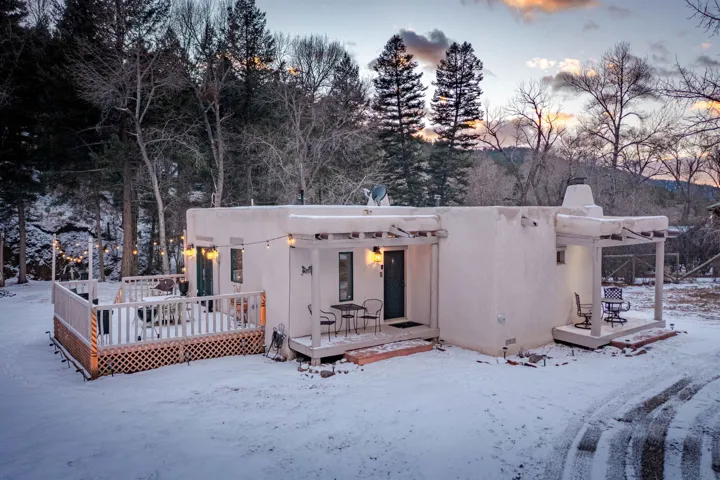 Your Winterwonderland Awaits! This turn key gem is being sold furnished as dipicted in the photos. Nestled in the heart of Taos Canyon along the Rio Fernando, this charming 1-bedroom adobe home offers a serene retreat on 0.91 acres of lush, wooded surroundings.
