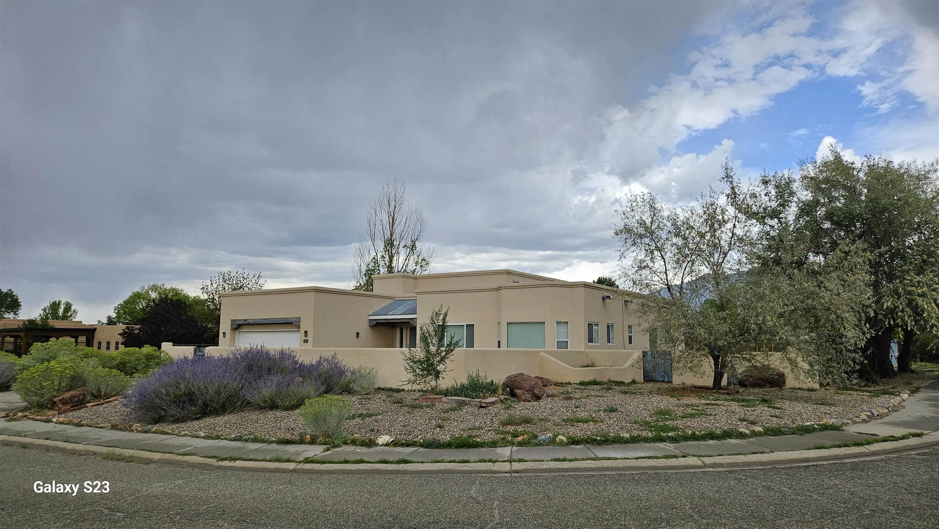 NEW ROOF installed by Collignon. Work completed 12/10/2025. Contemporary pueblo-style home in desirable Vegas de Taos. Abundant natural light and high viga ceilings in the living and dining area create comfortable and welcoming ambiance. The living room features doors to a covered patio and a large picture window which frame Taos Mountain views bringing the outdoors in. Quiet and private 3 bedroom and 2 bath 2,066 square foot home plus attached 2 car garage. The two bathrooms and kitchen have been recently updated. Walled courtyards, on .34 acre with unobstructed views. Tranquil location convenient to all amenities!