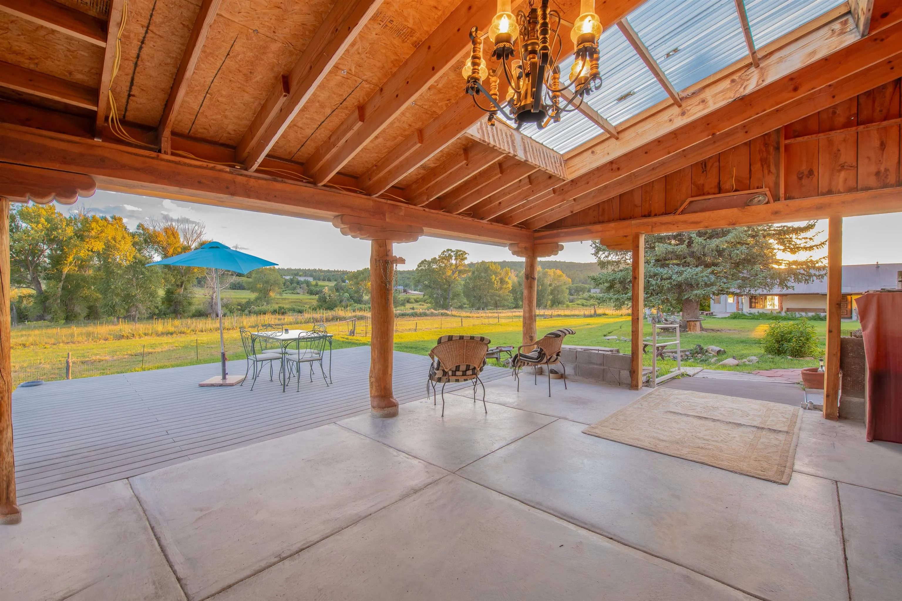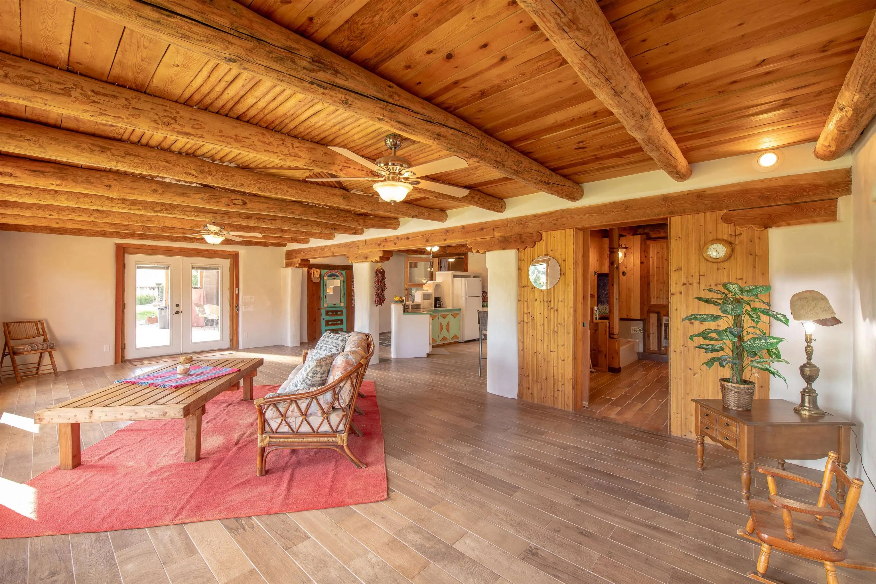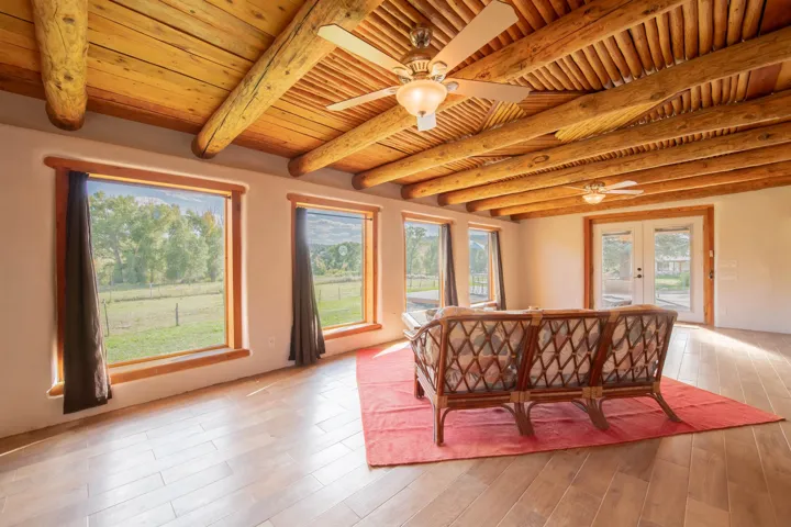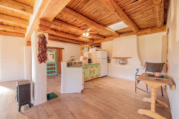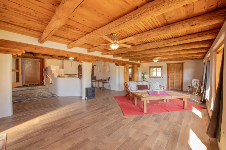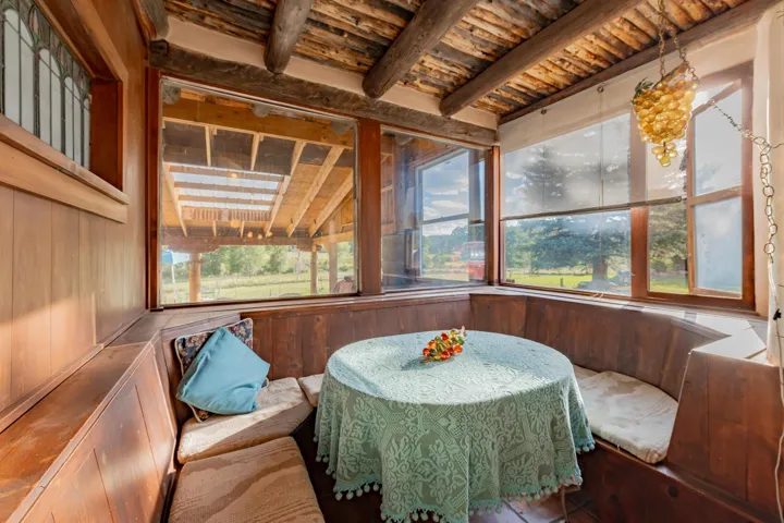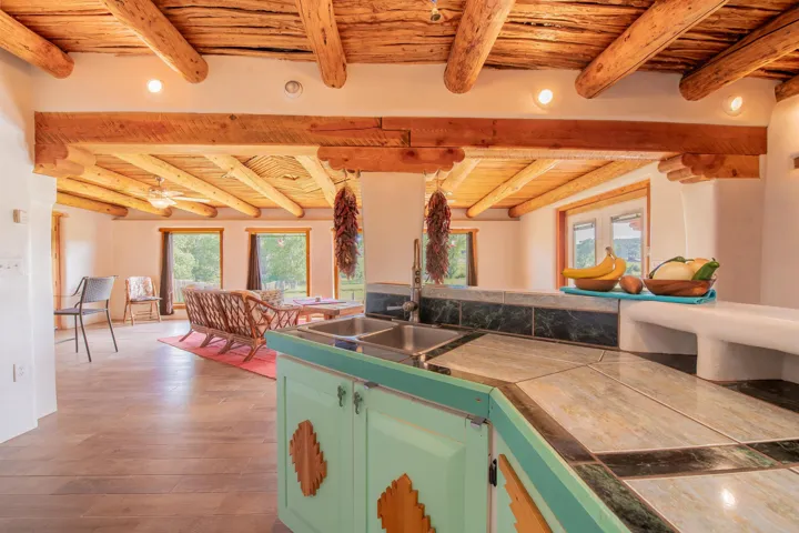 TWO HOMES – Welcome to the Sunrise and Sunset Homes. Nestled in the quaint Village of Vadito, NM, lies this rare 6+ acre property with two unique adobe homes, situated for peaceful pastural views that provide the full colorful spectrums of New Mexico sunrises and sunsets. The potential for organic farming, (soil has been free of herbicides and pesticides, nourished by only sheep and llama manure for owner’s 25 years), agricultural and livestock, a retreat or healing center, a family compound, and even rental income while living in one of the homes. The dark skies of this quiet location will leave you in awe of the brightness of the Milky Way, Orion, and all the constellations. Listen to the Rio Pueblo River which borders the south line of this property, alive with trout perfect for fly fishing and spot a heron on the shore catching breakfast. A river fed pond sits on the west side of the property awaiting your presence to share its views and quiet solitude. The property contains acequia water rights (6 acres), 3 water memberships available with the MDWCA that has been awarded annually in New Mexico for quality drinking water, two septic systems, a garage/ shop/ equipment building, a corral with 3 rooms and a hay barn that currently houses 2 llamas who produce manure second only to bat guano. The Sunset House boasts a kitchen that was recently refurbished with granite countertops, storage galore, soft close cabinets and a large kitchen island with seating space. There is new flooring throughout the living room, kitchen, and bathroom areas. The living room includes a wood burning stove and views of glorious sunsets framed by carved vigas and corbels. There is a 12’x 17’ greenhouse/sunroom/mudroom and also a 30’ x 10’ porch with storage attached. The Sunrise House is an 1864 circa custom updated adobe home with 2 separate living areas joined by a beautiful custom door. Either area could be perfect for caretaker or short-term renter. Local lore has it that Billy the Kid used to dance here when it was originally a dance hall! Ground floor living area has a gorgeous caramel- colored ceiling with vigas and latillas designed with a centerpiece Ojo de Dios. Four large windows in the great room look towards the fields and river to view and inhale mother nature’s beauty. Walk out from this great room to a 21’ x 20’ covered patio with attached composite 16’ x 20’ deck for those lovely morning/evening coffee, tea or cocktail times. Attached to this home is a 13′ x 40′ storage area. Could be converted to a carport, etc. This property is located approximately 18 miles SE of historic towns Ranchos de Taos and Taos, New Mexico and at approximately 7,500 ft elevation with a seasonal view of the 13,000 ft Jicarita Peak (a mountain held sacred by the local Picuris Pueblo people). The property produces a synergistic ecosystem and wildlife habitat for flowers, grasses, llamas, hawks and eagles among other wild birds. Sometimes you even get a visit from a buffalo or two! Located within 60 to 70 miles of six ski resorts, namely Sipapu (8 miles), Taos Ski Valley, Angel Fire, Red River, Ski Santa Fe, and Pajarito Ski Valley; supplying an outstanding selection of diverse activities for people of all ages and abilities. A RARE PROPERTY AVAILABLE FOR SALE! Please schedule your viewing today. **Buffalo not included**
