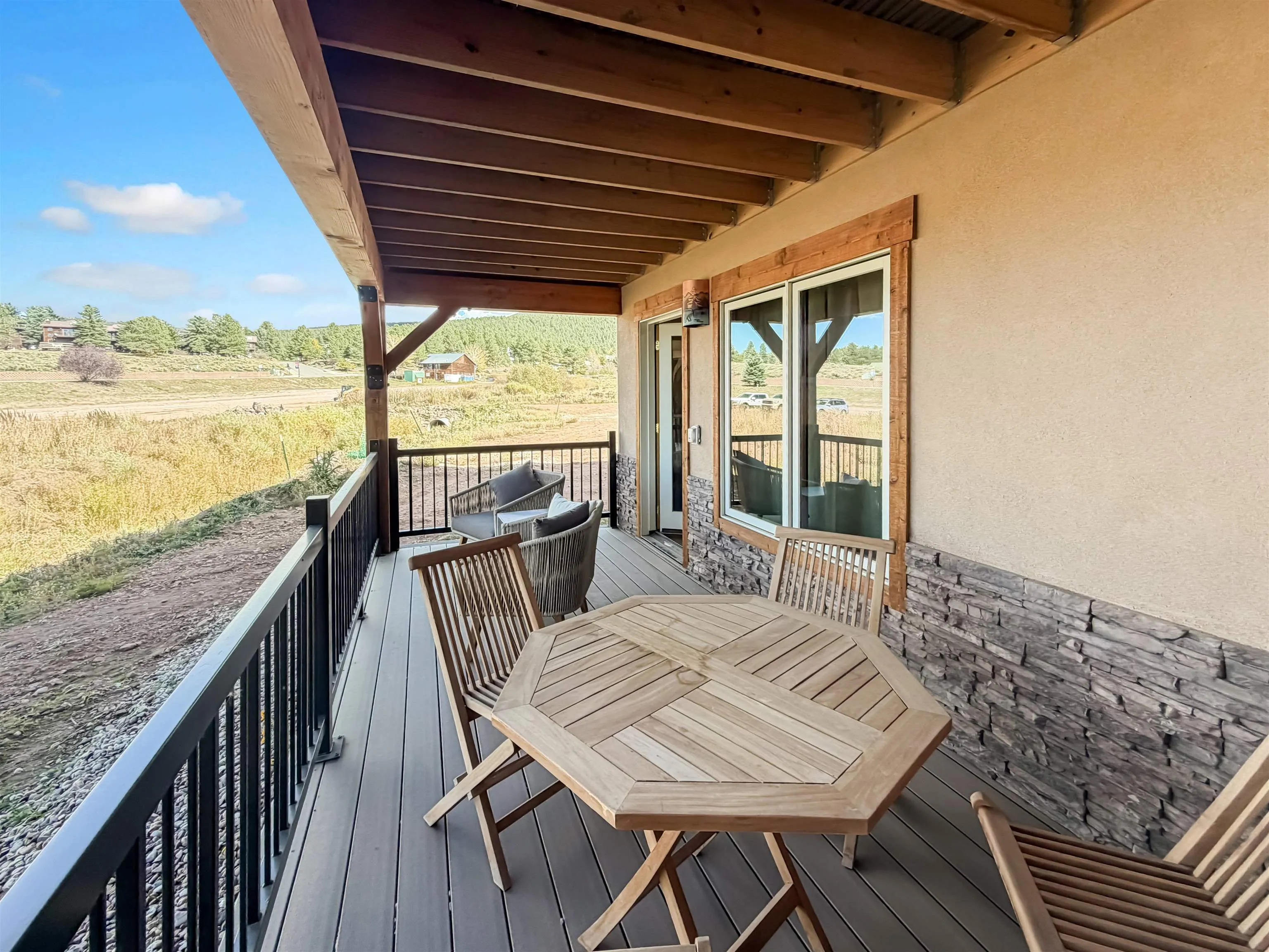 Newly built, beautifully designed with a mountain modern aesthetic, combining stucco and stone finished exterior with a cozy interior for the perfect blend and comfort is ready to be yours! Enjoy the breathtaking surrounding mountains while sipping your hot cocoa next to the gas fireplace or outside on the covered porch. One-Story layouts make these condos accessible and convenient, catering to those looking for easy, low-maintenance living. These spacious 3 bedroom, 2 bath, with a soaking tub in the primary bath are a rare find in this condo market, so get yours today! Centrally located in the heart of Angel Fire, this condo gives you fast and easy access to all the amenities and activities Angel Fire has to offer.
