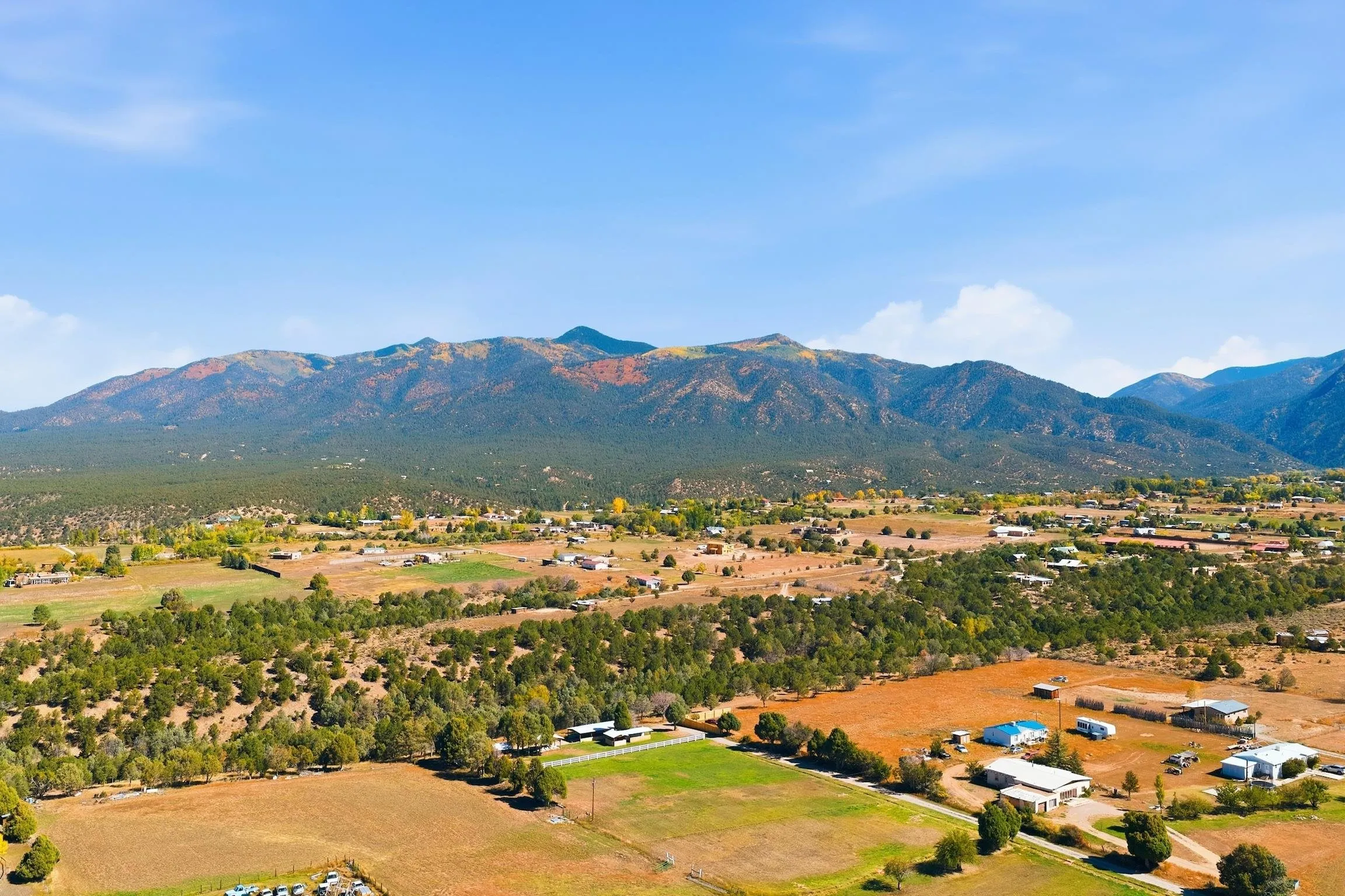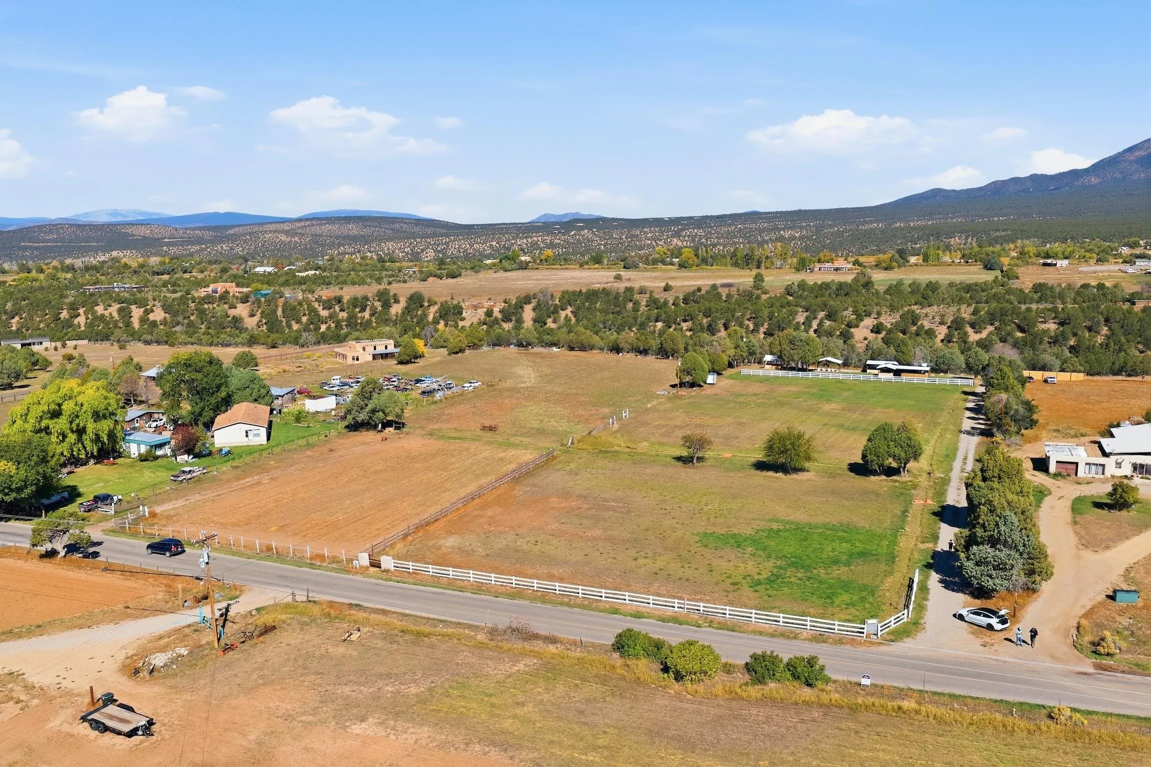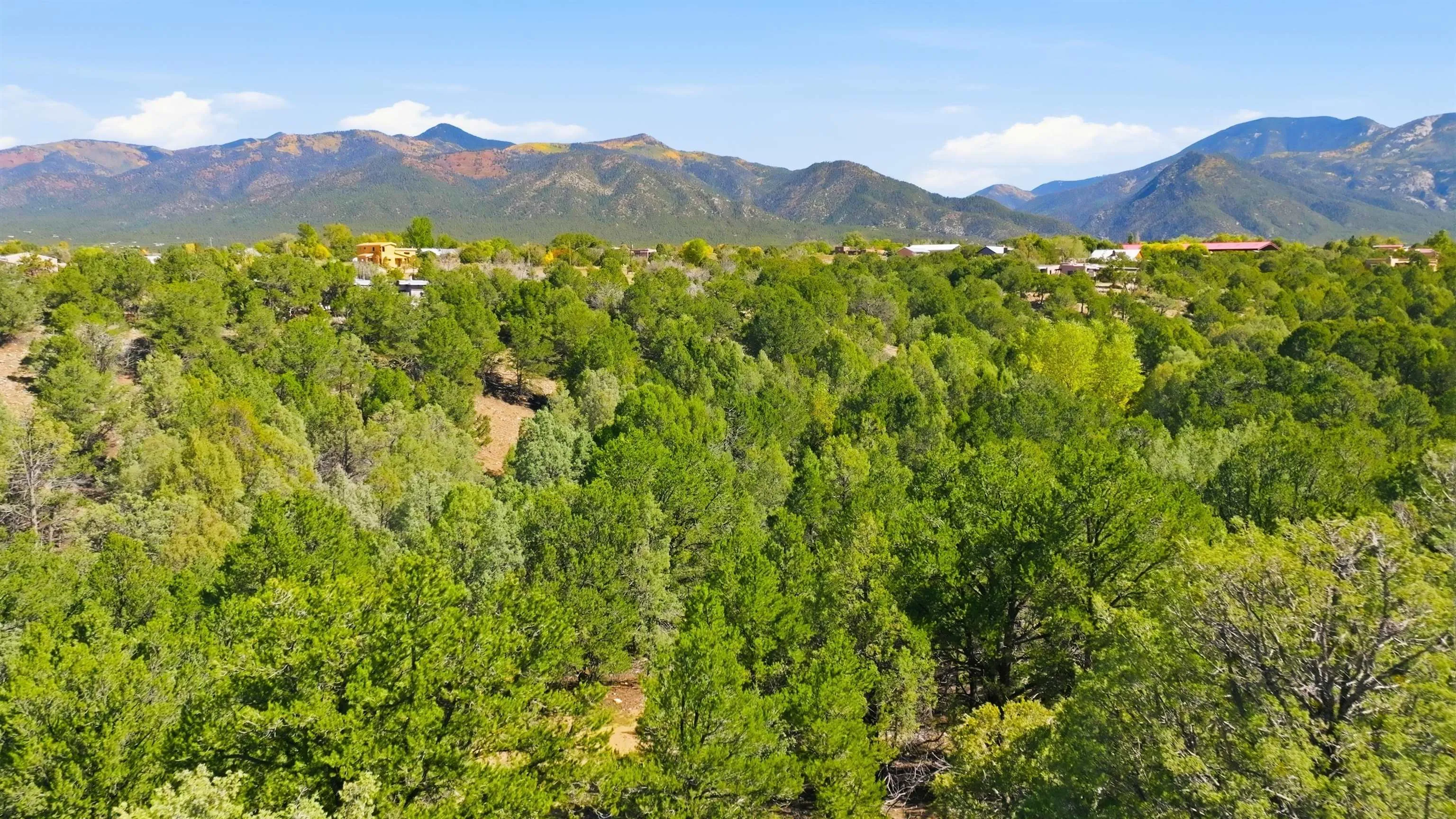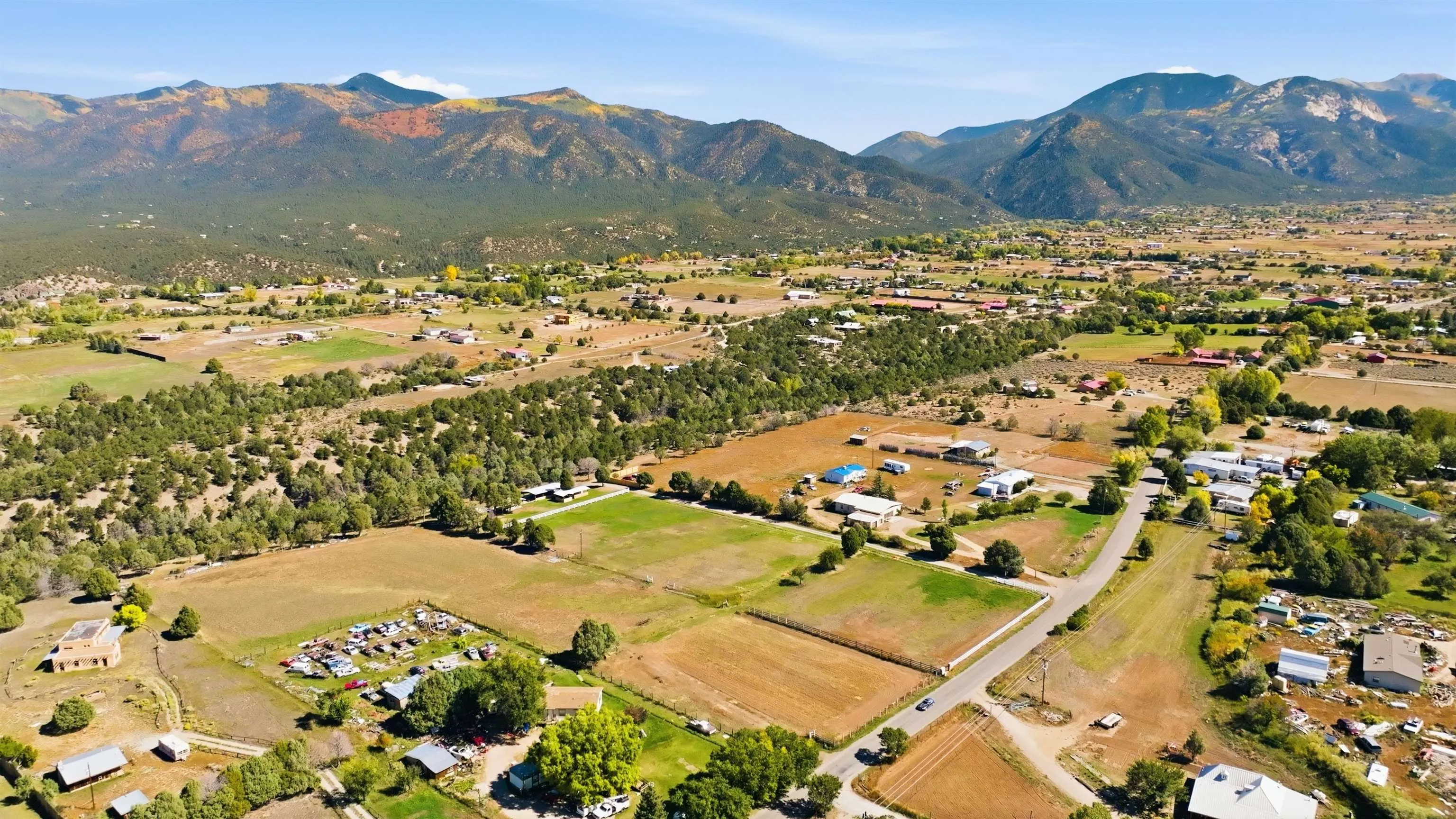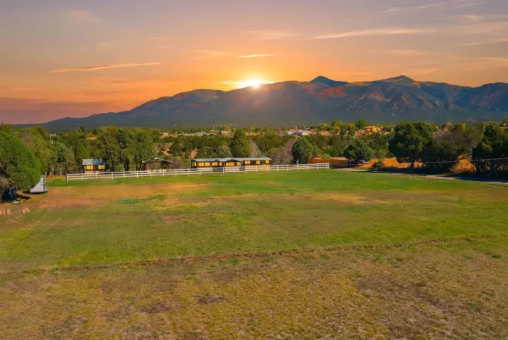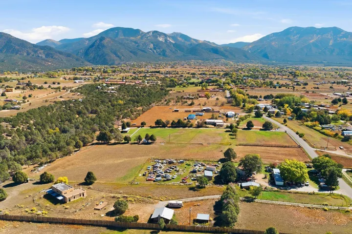 Magic Exists at Los Pino’s Park in Northern New Mexico ~ If you’re from Northern New Mexico, you likely know ALL about this remarkable, and truly one-of-a-kind property. If you don’t know about the magic of Los Pino’s, you certainly will when you lay first eyes and step foot on the Land. Nestled in the shadow of Taos Mountains in Northern New Mexico near Taos Ski Valley, minutes from iconic Downtown Taos, near the Rio Grande river, you will discover this lush irrigated 9.4 acre parcel with a Water Well, acequia Surface Water Rights, a run-off pond, and an impeccable outdoor event space infrastructure. Comes with it, an astounding reputation, and lots of potential. Los Pino’s Park is special, and for decades has served as a natural, lively, and vibrant event space for guests to celebrate all of life’s important moments under bright stars and well lit gazebos, around the custom bar, that sit atop solid concrete pads all powered by buried electric and water lines surrounded by five (5) hydrants. All of this may be left as is while continuing to host Special Events, such as, weddings, family reunions, anniversaries, graduations, birthdays, and so on… Perhaps you take it up a notch to entertain clients and host corporate functions with plenty of space for parking, or building multiple units for retreats. Better yet, you make this your own private sanctuary in the NM High desert, design your dream home to incorporate the already developed infrastructure in place, with a giant yard for pet’s to roam freely, and the children to play on nearly 10 acres. Los Pino’s is adjacent to, and complimented by a lush Cedar, Pinon and Juniper canyon flooded with mule deer who hang around a seasonal filled pond in the canyon where you will also find clear flat areas suitable for the construction of single dwelling units or cabins, with ample wood supply and privacy in your own little forest. Virtual homes are in the photos to spark your creativity. This land evokes everything about our High Desert amongst majestic mountains. Also being sold as a 4 Acre +- (MLS#114021) and 5 Acre +- parcel (MLS#114022).