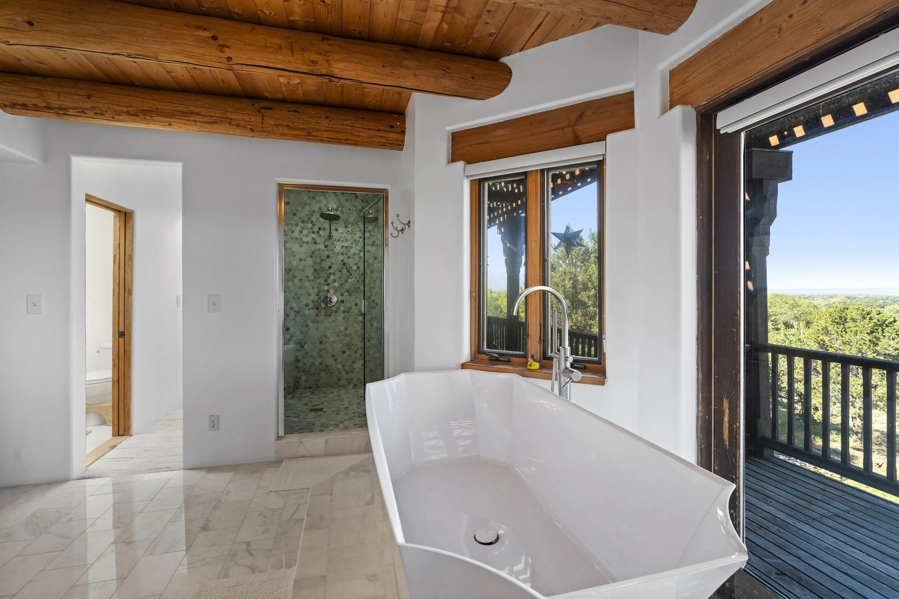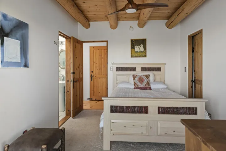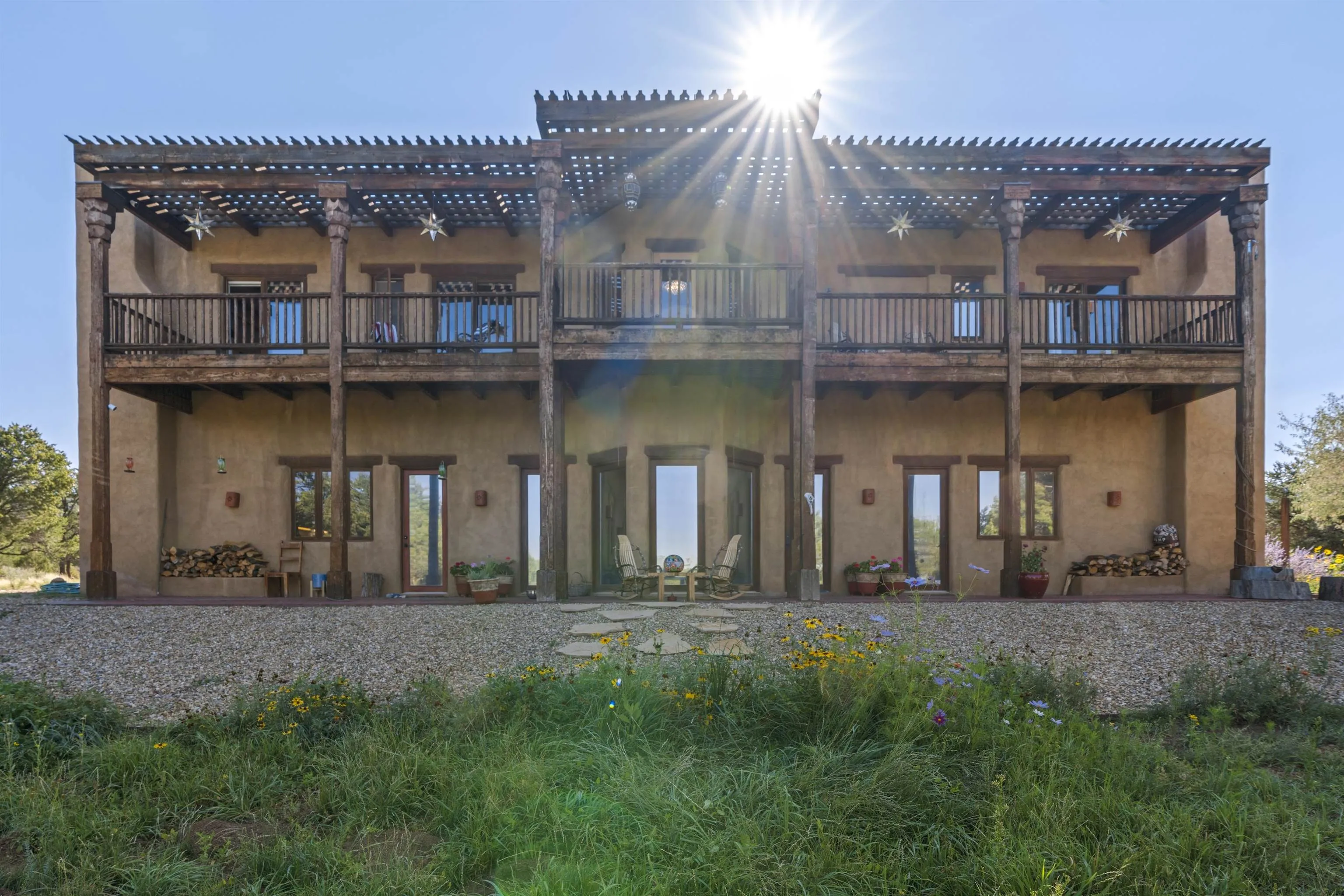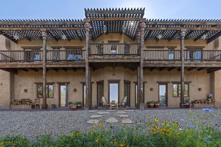 Perfect for refined hosting and elevated entertaining, this exceptional estate offers a rare blend of timeless design, global influence, and contemporary luxury. Crafted for those who value architectural artistry and effortless hospitality, the residence unfolds with thoughtful flow, generous gathering spaces, and sophisticated indoor and outdoor living. Each room opens like its own chapter. Distinct, intentional, and seamlessly connected to create a refined sense of livability and design. A timeless piece of Taos, New Mexico real estate, this 5-bedroom, 5-bathroom estate is haute couture in architectural form. A blend of classic Southwest character, Middle Eastern influence, and modern elegance, the home feels both storied and contemporary. Exquisite woodwork and one-of-a-kind doors anchor the estate with craftsmanship rarely seen today. A full, high-end renovation elevates the entire second floor as well as the lower pool suite, pairing luxury finishes with thoughtful spatial design. Every bathroom has been re-imagined to maximize comfort, serenity, and elevated hospitality. Designed for seamless entertaining, the sophisticated working chef’s kitchen opens into a grand dining room with soaring ceilings and an adjacent, beautifully appointed library. Two primary suites, one on each level, offer flexibility and privacy. From the upstairs porch, enjoy sweeping views of the town of Taos and the striking profile of the El Salto cliffs. Originally built by Ambassador Bill Eagleton, a career diplomat to numerous Middle Eastern nations, the residence carries an international pedigree matched by its exceptional design. With over 4,300 square feet of interior living and more than 3,100 square feet of outdoor patios, portals, and porches, the home is ideally suited for both intimate gatherings and large celebrations. The expansive great room opens onto a meticulously maintained patio featuring a 41-foot heated lap pool and in-ground hot tub. Lush gardens on drip irrigation create a private oasis of blooms, shade, and outdoor living. Set on 3 acres, the property also includes a peach orchard and thriving blackberry and raspberry patches just off the kitchen terrace. Six fireplaces, dramatic vaulted ceilings, generous art walls, and cozy architectural nooks complete the experience. An estate that feels both grand and deeply livable. A rare opportunity to own a truly singular oasis in the heart of magical Taos.