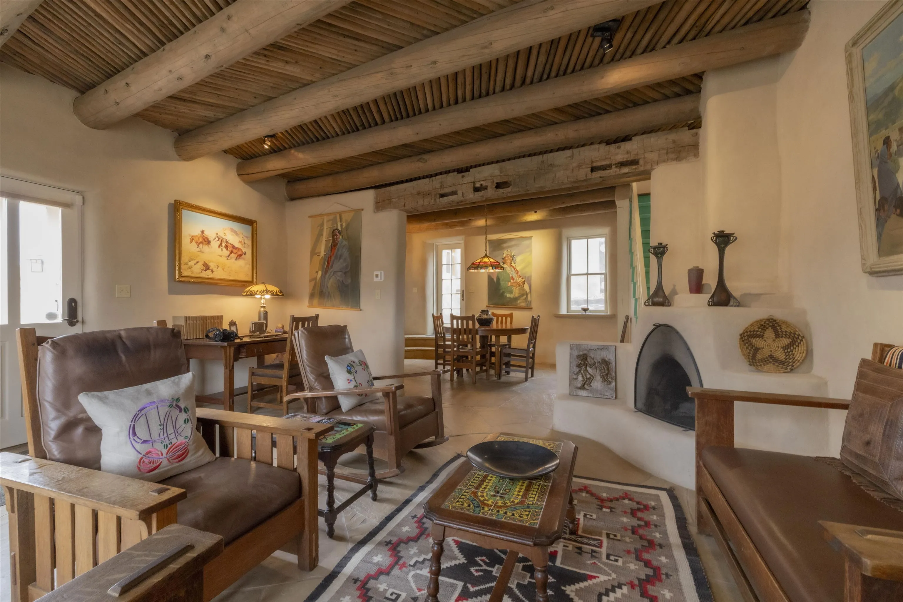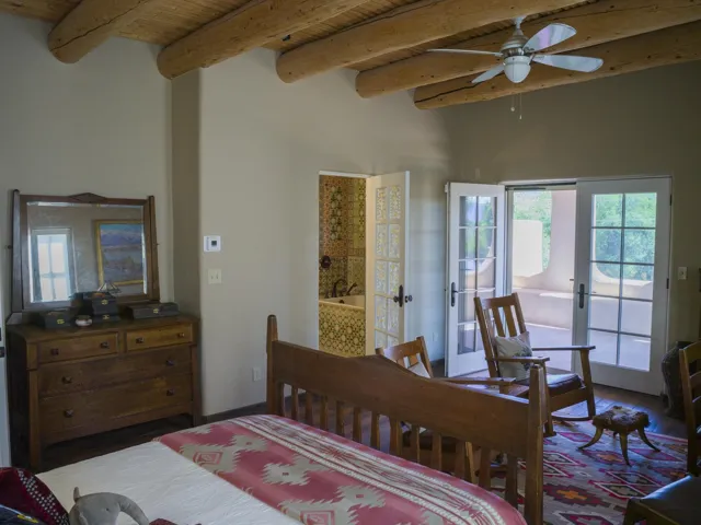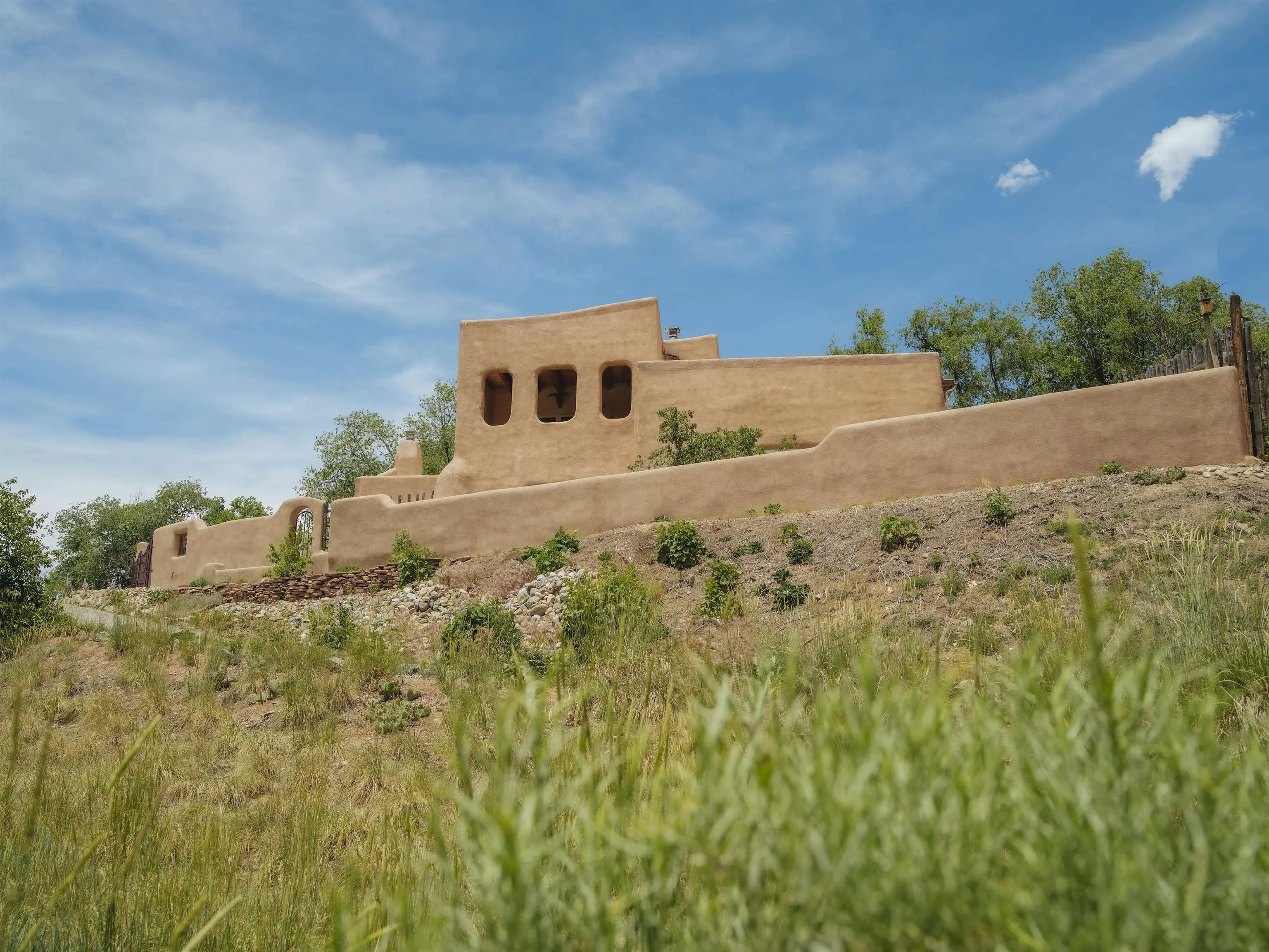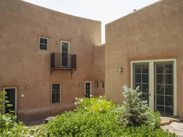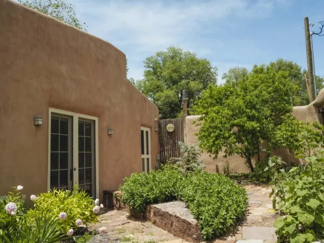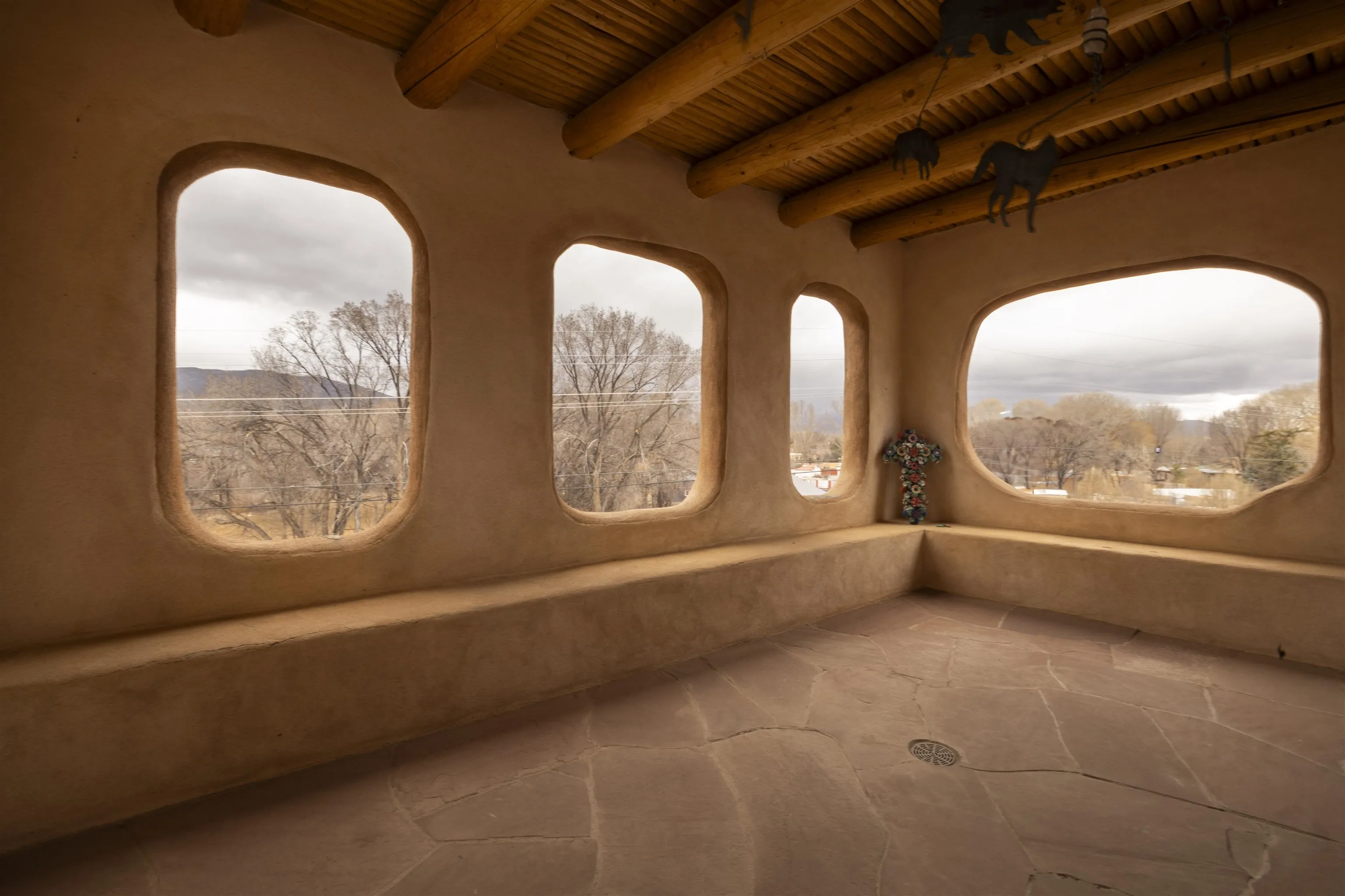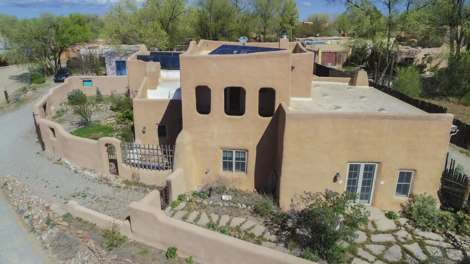 This remarkable adobe home, nestled in Taos’s historic district, offers a rare glimpse into the town’s rich artistic past, having once served as the residence and gallery of Taos Modernists painters Beatrice Mandelman and Louis Ribak. Originally constructed in 1880, the property underwent a thoughtful remodel in 2006, seamlessly blending its historic charm with modern amenities. Entering this 3280 sq ft property, you will feel the exceptional detail of craftsmanship and mindfulness for those seeking a truly distinctive property. The home features an extraordinary two bedroom/two bath main residence and a separate well-appointed one-bedroom/one bath apartment/studio all under one roof. Stepping into the heart of the home, there is a cozy parlor/dining area with a southwestern fireplace, and deep set windows. Thick walls and wood floors are found throughout the house. Prepare to be enchanted by the adjoining whimsically designed kitchen, featuring a Viking stove and lively, painted cabinetry and ample storage. It’s a space designed to spark joy and inspire your inner chef. Adjoining the parlor area is the large living room designed for both artistic inspiration and grand gatherings, and with a rich history of Taos lore. A guest bath is perfect and adds to its versatility. Upstairs, the primary suite is a sanctuary of comfort and privacy. The landing, lined with built-in cabinets, leads to a generously proportioned bedroom and oversized bath and attached closet. A cozy sitting area offers ample space for relaxation. French doors invite you to step out onto the front balcony or the rear Juliet balcony, each offering a unique perspective of the Taos landscape. The apartment/studio/guestroom offers a large living area, an upscale kitchen, and a southwestern fireplace. Access to a private, stone-terraced back courtyard, is perfect for relaxation and contemplation. Authentic New Mexican features abound, including vigas and lattilas ceilings, four southwestern fireplaces, natural mud plaster walls and nichos, and a mix of flagstone, reclaimed wood, and Saltillo tile flooring. Hand-painted beams and carved corbels add unique details. Other amenities include radiant floor heating, double-paned windows, and custom screen doors. The property includes a gated front courtyard, w/ spruce and fruit trees, a fruit tree orchard (pear, apple, apricot), and a private walled backyard with rock landscaping. Sustainable features include two cisterns for water collection, a gardening sprinkler system, an air exchanger in the laundry room, and solar panels with a natural gas backup for up to 12 hrs. of hot water. This exceptional property offers a unique opportunity to own a piece of Taos history, seamlessly blending historic charm with contemporary comfort.