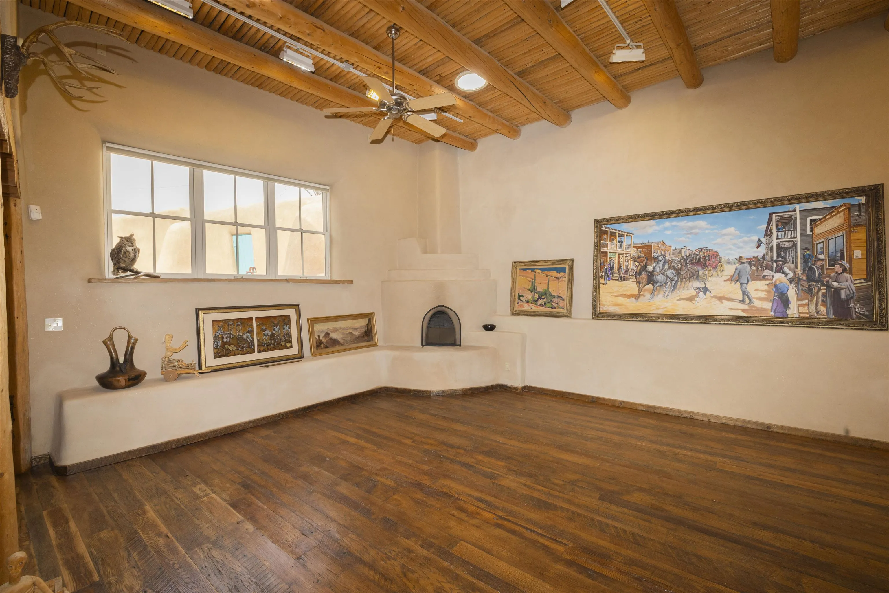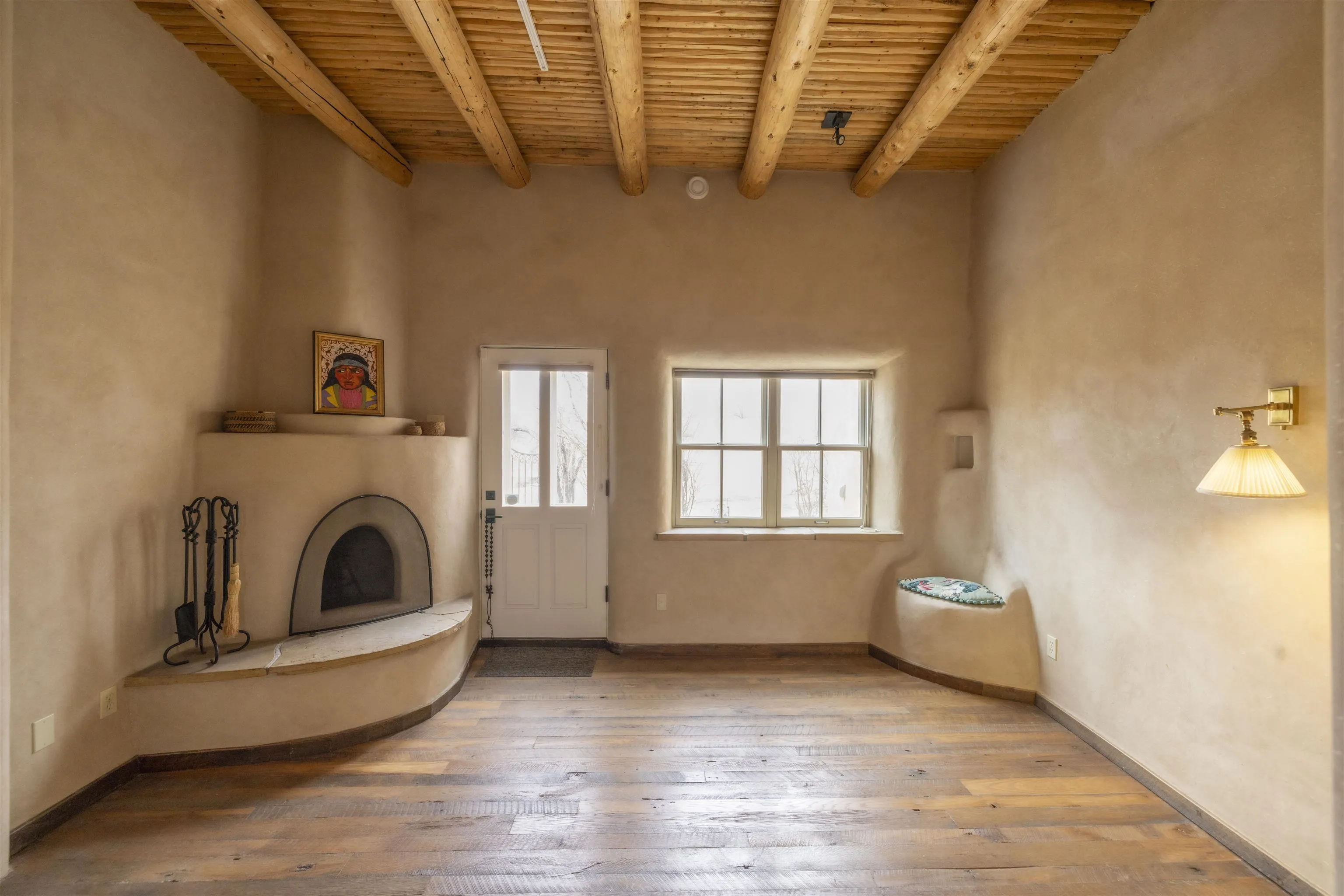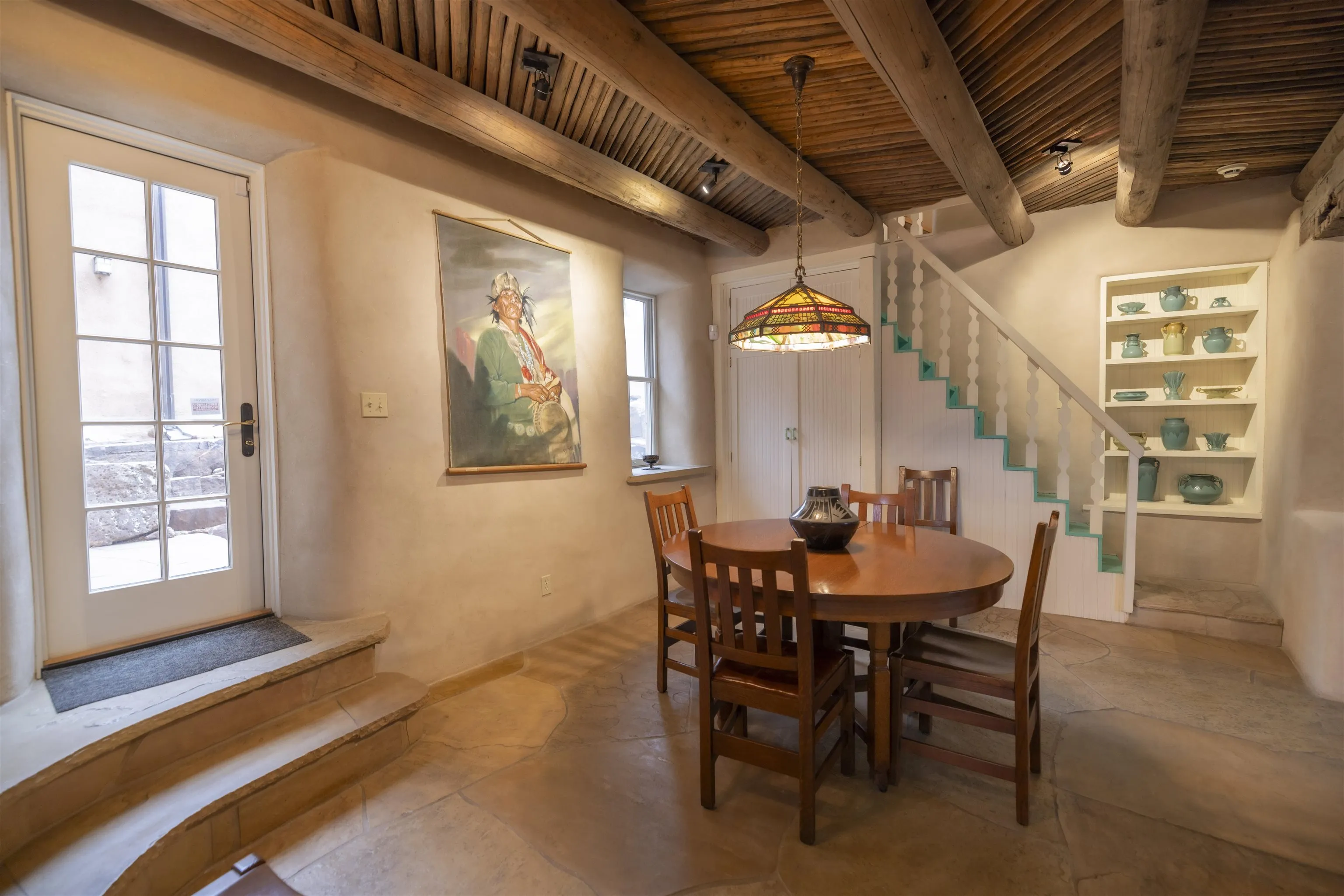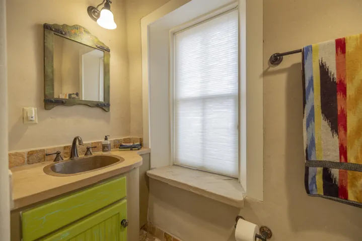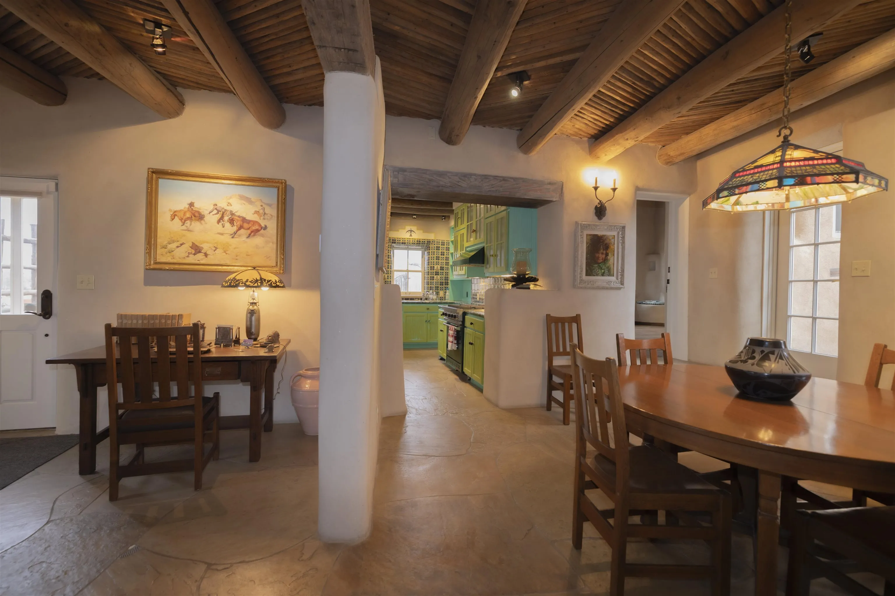This remarkable adobe home, nestled in Taos’s historic district, offers a rare glimpse into the town’s rich artistic past, having once served as the residence and gallery of Taos Modernists painters Beatrice Mandelman and Louis Ribak. Originally constructed in 1880, the property underwent a thoughtful remodel in 2006, seamlessly blending its historic charm with modern amenities. Entering this 3280 sq ft property, you will feel the exceptional detail of craftsmanship and mindfulness for those seeking a truly distinctive property. The home features an extraordinary two bedroom/two bath main residence and a separate well-appointed one-bedroom/one bath apartment/studio all under one roof. Stepping into the heart of the home, there is a cozy parlor/dining area with a southwestern fireplace, and deep set windows. Thick walls and wood floors are found throughout the house. Prepare to be enchanted by the adjoining whimsically designed kitchen, featuring a Viking stove and lively, painted cabinetry and ample storage. It’s a space designed to spark joy and inspire your inner chef. Adjoining the parlor area is the large living room designed for both artistic inspiration and grand gatherings, and with a rich history of Taos lore. A guest bath is perfect and adds to its versatility. Upstairs, the primary suite is a sanctuary of comfort and privacy. The landing, lined with built-in cabinets, leads to a generously proportioned bedroom and oversized bath and attached closet. A cozy sitting area offers ample space for relaxation. French doors invite you to step out onto the front balcony or the rear Juliet balcony, each offering a unique perspective of the Taos landscape. The apartment/studio/guestroom offers a large living area, an upscale kitchen, and a southwestern fireplace. Access to a private, stone-terraced back courtyard, is perfect for relaxation and contemplation. Authentic New Mexican features abound, including vigas and lattilas ceilings, four southwestern fireplaces, natural mud plaster walls and nichos, and a mix of flagstone, reclaimed wood, and Saltillo tile flooring. Hand-painted beams and carved corbels add unique details. Other amenities include radiant floor heating, double-paned windows, and custom screen doors. The property includes a gated front courtyard, w/ spruce and fruit trees, a fruit tree orchard (pear, apple, apricot), and a private walled backyard with rock landscaping. Sustainable features include two cisterns for water collection, a gardening sprinkler system, an air exchanger in the laundry room, and solar panels with a natural gas backup for up to 12 hrs. of hot water. This exceptional property offers a unique opportunity to own a piece of Taos history, seamlessly blending historic charm with contemporary comfort.