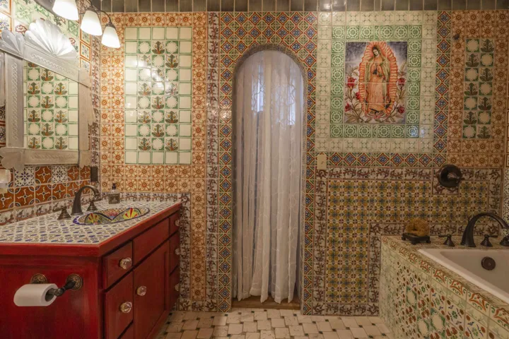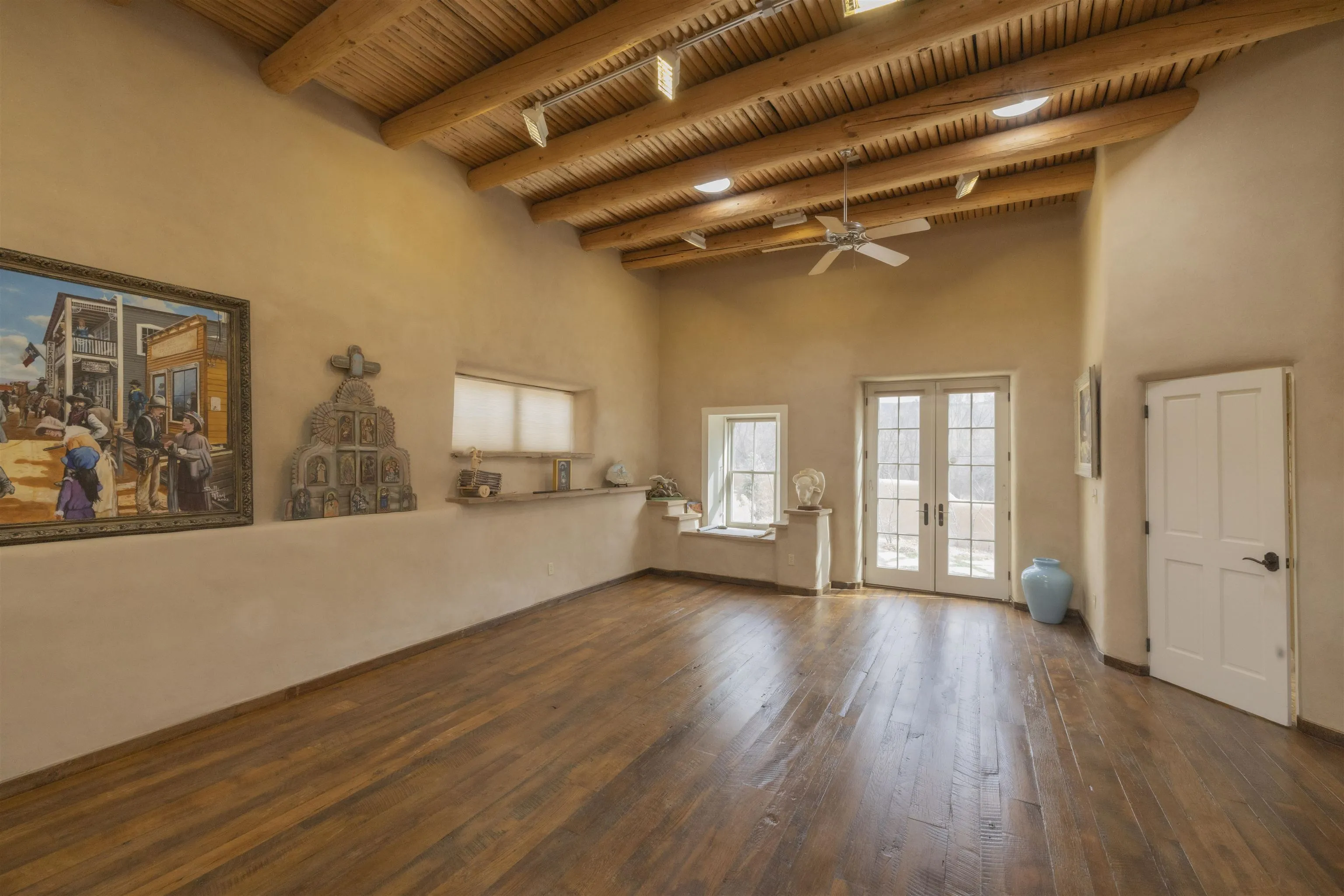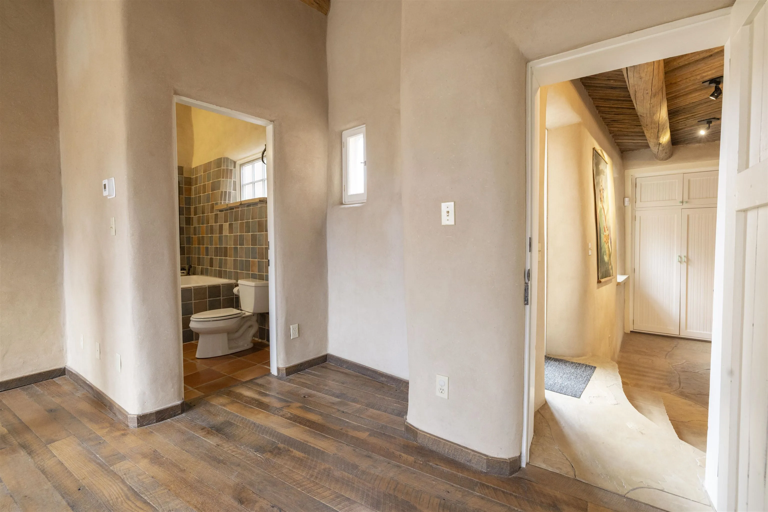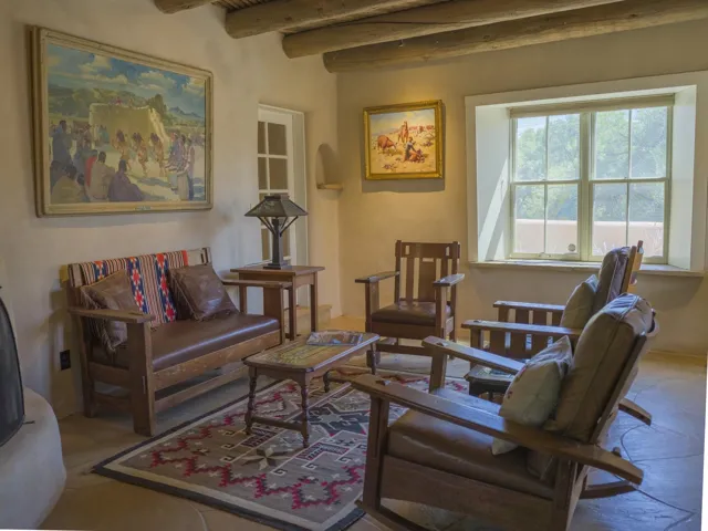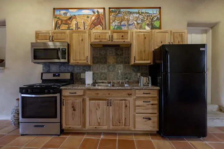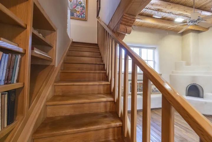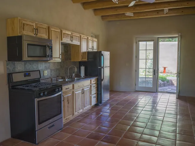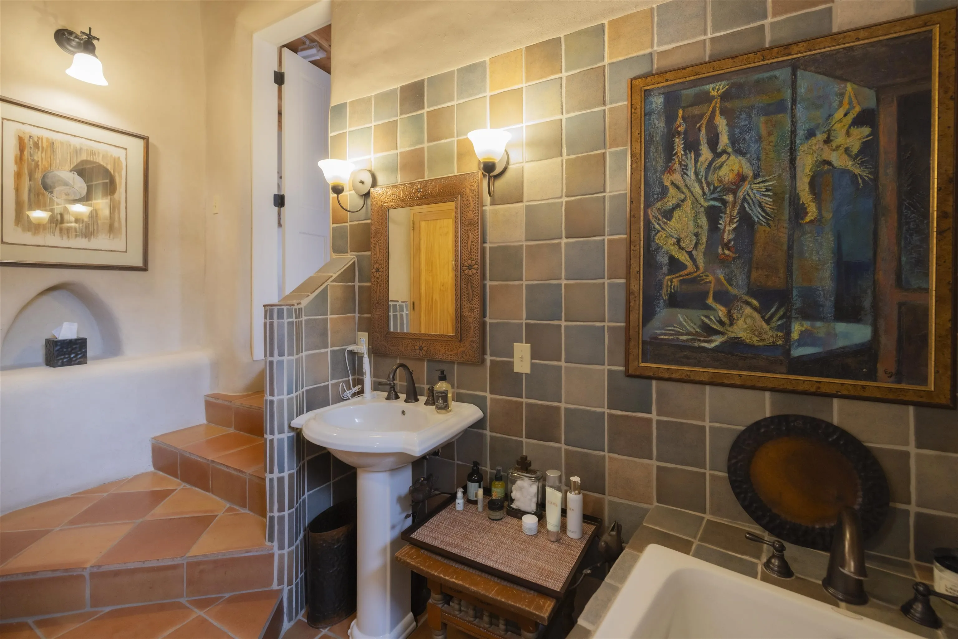 This remarkable adobe home, nestled in Taos’s historic district, offers a rare glimpse into the town’s rich artistic past, having once served as the residence and gallery of Taos Modernists painters Beatrice Mandelman and Louis Ribak. Originally constructed in 1880, the property underwent a thoughtful remodel in 2006, seamlessly blending its historic charm with modern amenities. Entering this 3280 sq ft property, you will feel the exceptional detail of craftsmanship and mindfulness for those seeking a truly distinctive property. The home features an extraordinary two bedroom/two bath main residence and a separate well-appointed one-bedroom/one bath apartment/studio all under one roof. Stepping into the heart of the home, there is a cozy parlor/dining area with a southwestern fireplace, and deep set windows. Thick walls and wood floors are found throughout the house. Prepare to be enchanted by the adjoining whimsically designed kitchen, featuring a Viking stove and lively, painted cabinetry and ample storage. It’s a space designed to spark joy and inspire your inner chef. Adjoining the parlor area is the large living room designed for both artistic inspiration and grand gatherings, and with a rich history of Taos lore. A guest bath is perfect and adds to its versatility. Upstairs, the primary suite is a sanctuary of comfort and privacy. The landing, lined with built-in cabinets, leads to a generously proportioned bedroom and oversized bath and attached closet. A cozy sitting area offers ample space for relaxation. French doors invite you to step out onto the front balcony or the rear Juliet balcony, each offering a unique perspective of the Taos landscape. The apartment/studio/guestroom offers a large living area, an upscale kitchen, and a southwestern fireplace. Access to a private, stone-terraced back courtyard, is perfect for relaxation and contemplation. Authentic New Mexican features abound, including vigas and lattilas ceilings, four southwestern fireplaces, natural mud plaster walls and nichos, and a mix of flagstone, reclaimed wood, and Saltillo tile flooring. Hand-painted beams and carved corbels add unique details. Other amenities include radiant floor heating, double-paned windows, and custom screen doors. The property includes a gated front courtyard, w/ spruce and fruit trees, a fruit tree orchard (pear, apple, apricot), and a private walled backyard with rock landscaping. Sustainable features include two cisterns for water collection, a gardening sprinkler system, an air exchanger in the laundry room, and solar panels with a natural gas backup for up to 12 hrs. of hot water. This exceptional property offers a unique opportunity to own a piece of Taos history, seamlessly blending historic charm with contemporary comfort.