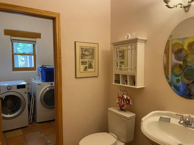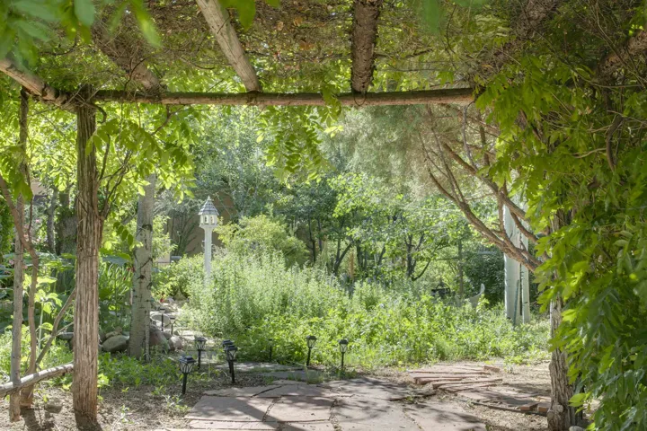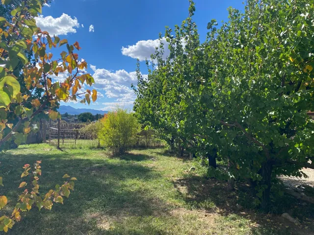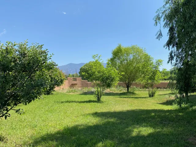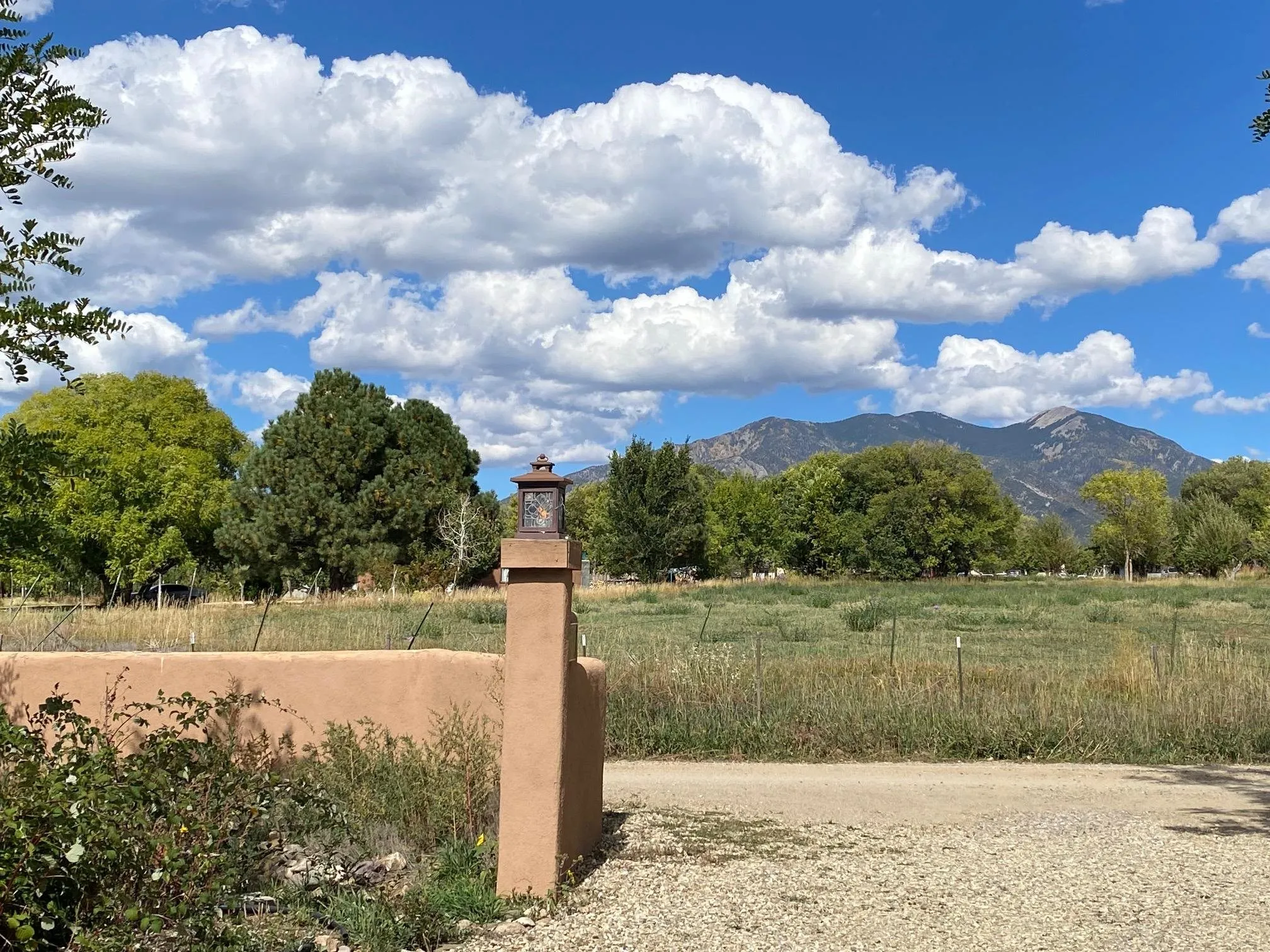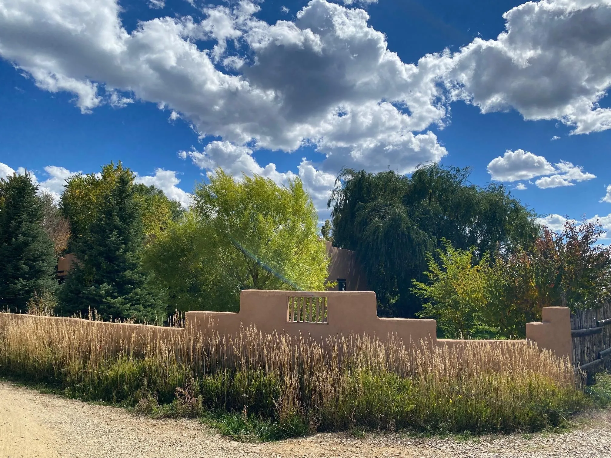 Canon Oasis! Lush gardens and a shady entry courtyard welcome you to to this immaculate home less than two miles from Taos Plaza. Saltillo tile floors and viga ceilings embrace the flavor of southwestern detailing throughout. In-floor radiant heat and ceiling fans maintain comfortable temperatures year round. With three bedrooms, 2.5 bathrooms, an office and over 2200 sq ft, of interior living space there is ample room for hosting and entertaining guests. The great room features soaring ceilings with vigas and two distinct living areas. Cuddle up in front of the southwestern style fireplace on one side or engage in conversation or a watch movie on the other. The breakfast area leads to a covered patio and gardens beyond. Archways lead to the formal dining room and kitchen. Be sure not to miss the details on the cooktop island or the view of the garden from above the kitchen sink. There’s a convenient pantry tucked behind the kitchen and a powder room and laundry. Primary and guest bedrooms are located down the hall in the west wing of the residence. There is a dedicated office. Two other guest bedrooms and common bathroom lay beyond. The primary bedroom is spacious with its own southwestern style fireplace and access to the gardens. It’s primary bathroom has double sinks, a separate shower and corner jetted tub to get away from it all. A walk-in closet provides an amazing amount of storage! At the rear of the heated two-car garage is an artists studio with exterior access and privacy that awaits your creativity. Valley land is fed by an acequia. More than sixty trees occupy the property — many fruit —- and a grand-father willow tree canopies the back yard. Extensive flagstone patios and walkways wind through rose gardens and flower beds leading to a wisteria covered sombra. There is even a fenced area for four-legged family members and a detached shed for seasonal storage and gardening tools. The neighborhood paths lead to endless Carson National Forest hiking trails. This property is one of a kind in so many ways. Truly magical and rare elegance abounds!
