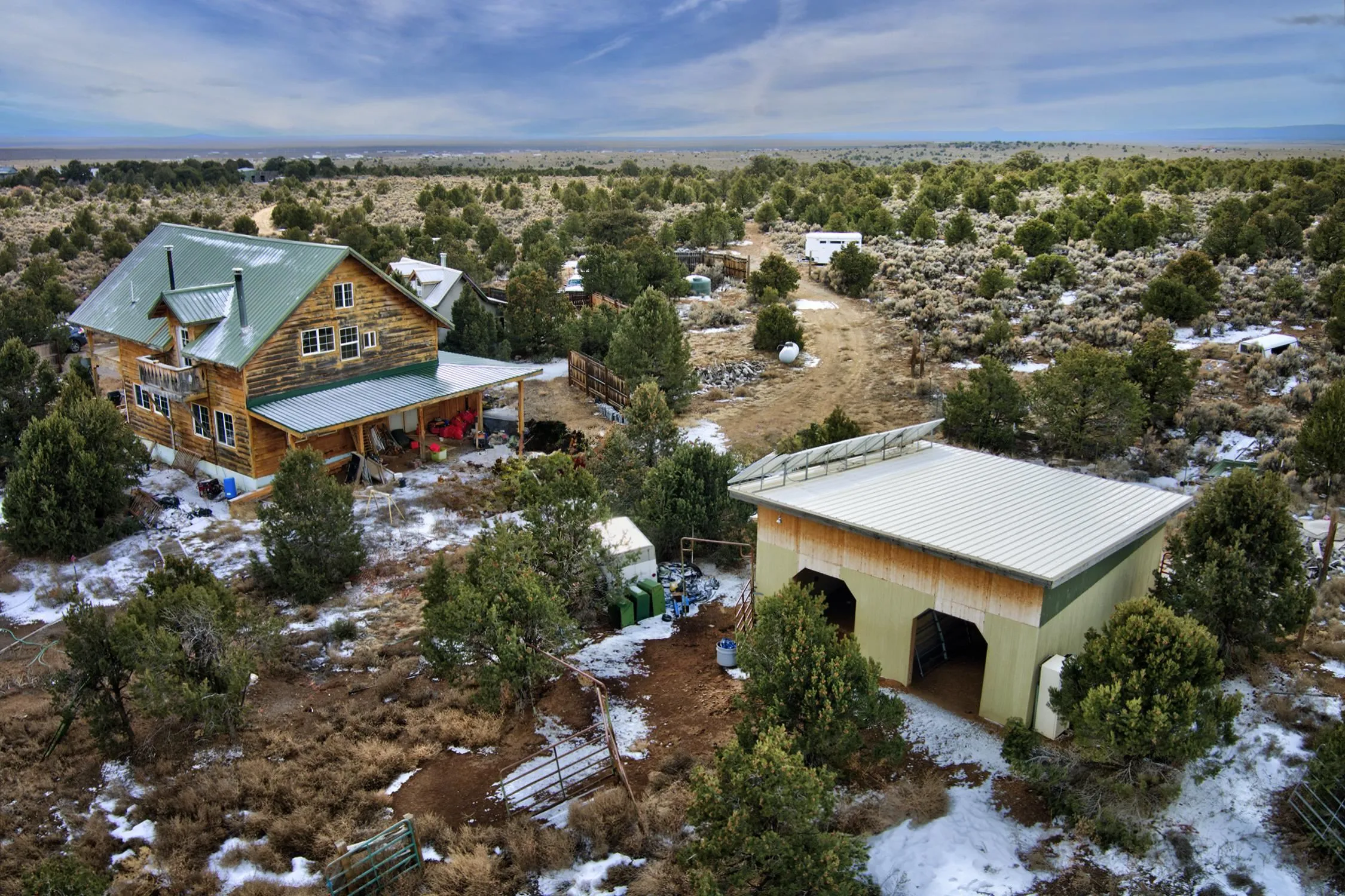 Welcome to Flying F Ranch, a rare 288.59-acre property where Southwestern charm meets sustainable living. With unobstructed views stretching 35 miles, this one-of-a-kind ranch is a rugged sanctuary awaiting your creative vision. Two primary residences provide plenty of space for everyone. Enjoy unmatched views from the second-floor primary suite and spacious covered balcony of the 2-bedroom, 1.5 bath chalet. The classic adobe home features a sunken living room 2 Carmen Velarde fireplaces, a wood stove, and a galley kitchen with custom tile countertops and backsplash and brick flooring. Outbuildings include a 2-room cabin, your own turn of the century adobe chapel, two hay barns, a workshop, garage and more. Plenty of space to roam, raise, or ride. We’ll provide the bones and bling, you bring your imagination. Whether you’re seeking a retreat, a working ranch, or an inspiring canvas for your dreams, Flying F Ranch is an offering unlike any other. A place of wild, panoramic freedom, where sunrises and starlit skies become daily rituals.