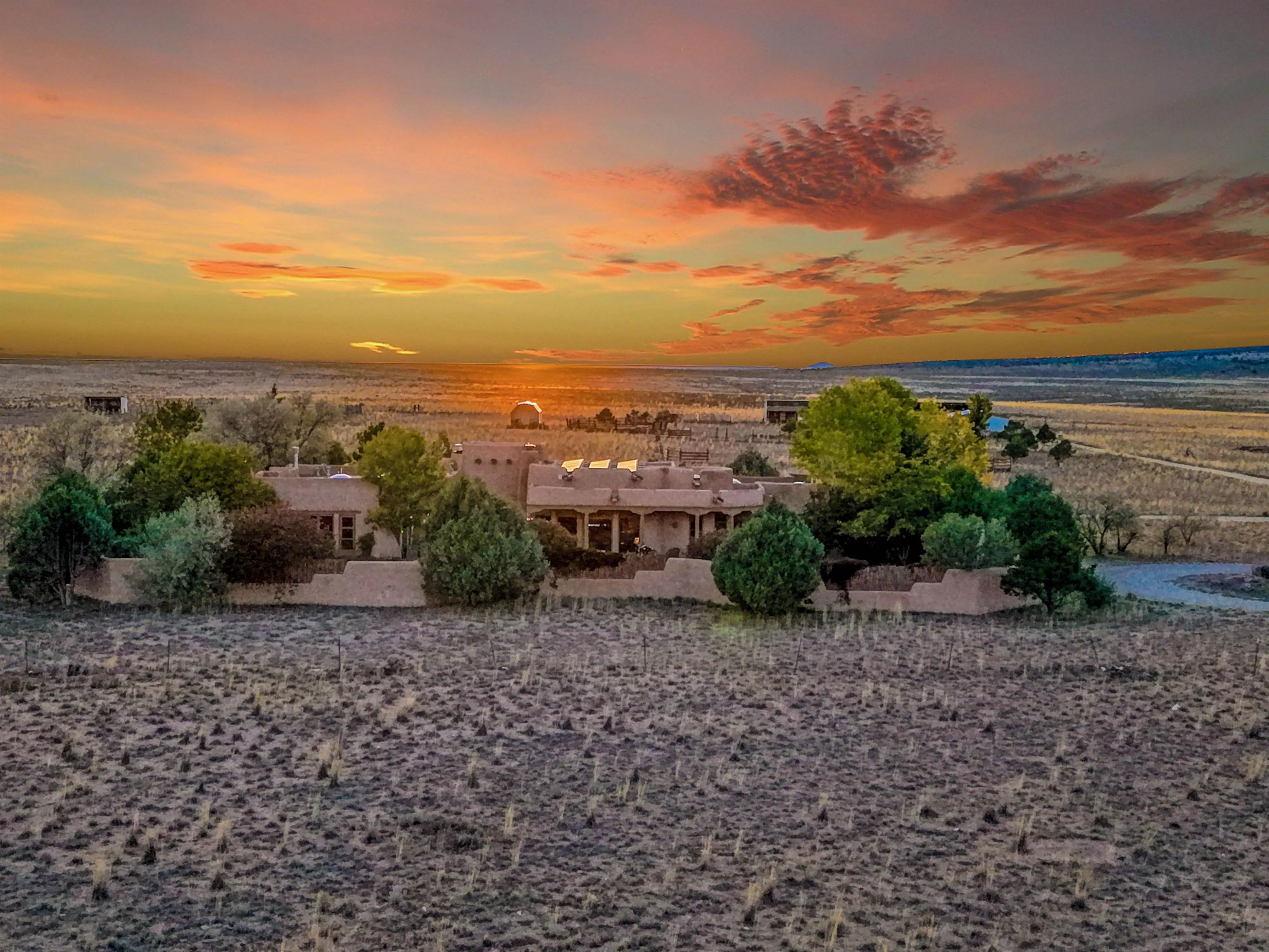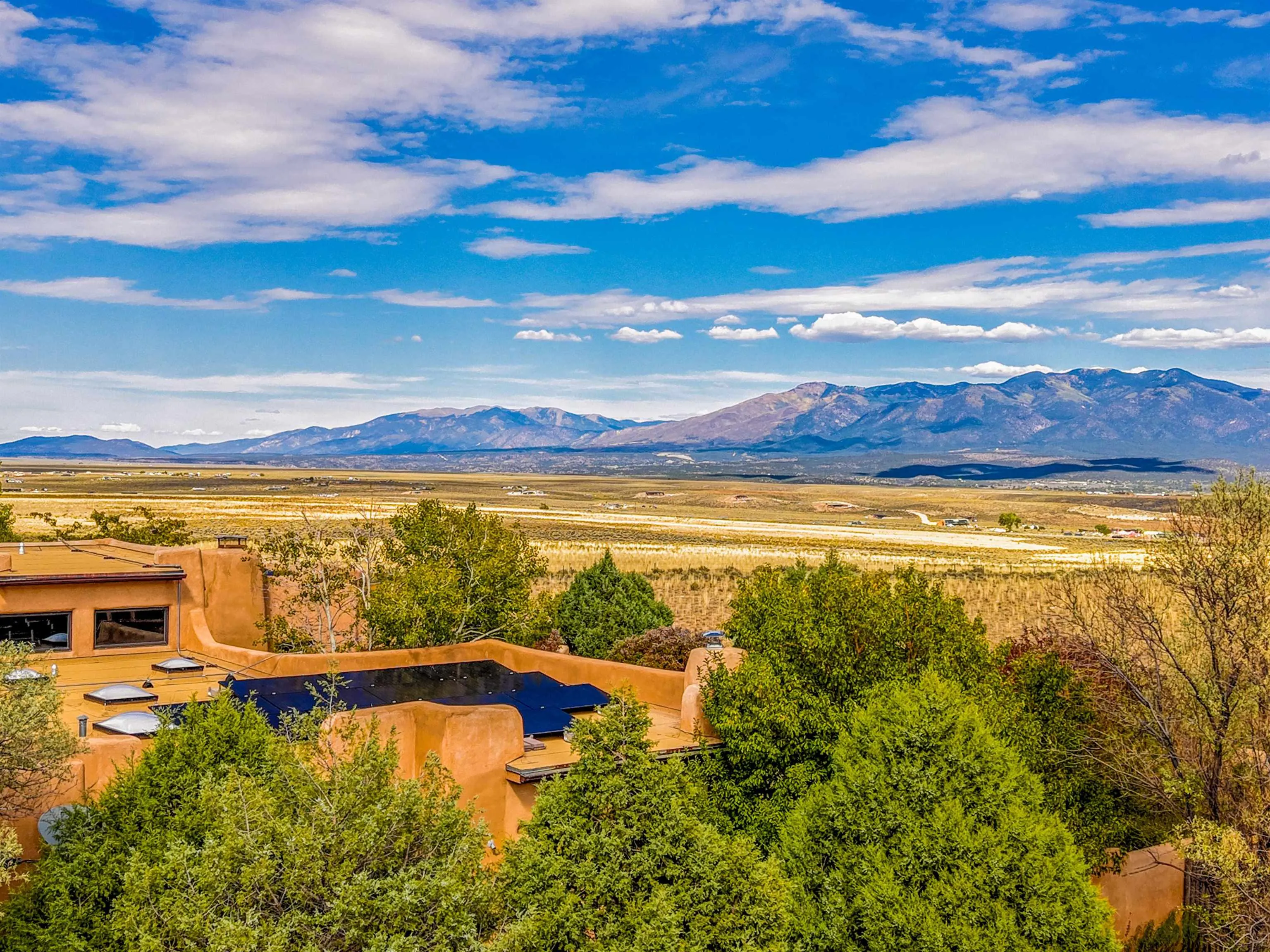 Welcome to a truly exceptional Northern New Mexico retreat—110 acres of serene beauty and luxurious living. This remarkable property features a stunning 4-bedroom, 3-bath primary residence once showcased in Enchanted Homes magazine, a testament to its timeless design, high-level craftsmanship, and one-of-a-kind charm. Inside, you’ll find hand-carved beams, a magnificent stone fireplace, and warm, inviting spaces designed for comfort and elegance. The chef’s kitchen is a dream for culinary enthusiasts, while multiple private patios and lush, thoughtfully landscaped gardens create a true oasis in the desert—perfect for quiet mornings, lively gatherings, and starlit evenings. Conveniently located just 10 quick minutes west of the Taos Regional Airport, this extraordinary estate is as functional as it is beautiful. A grid-tied solar system, private well, and high-speed fiber optic internet ensure modern sustainability and convenience. The land includes well-appointed outbuildings: storage, tack room, hay barn, and a 3-bedroom, 2-bath manufactured caretaker’s home—ideal for guests, a ranch manager, or extended family. Take in breathtaking 360-degree views from every angle and enjoy the option for an elk hunting license, adding unique appeal for outdoor enthusiasts. Whether you dream of tending gardens, riding horses, or simply soaking up the peace and privacy under expansive skies, this property invites you to experience the very best of refined country living. If you’ve been searching for a luxurious private sanctuary that must be seen to be truly appreciated, this is the one.
