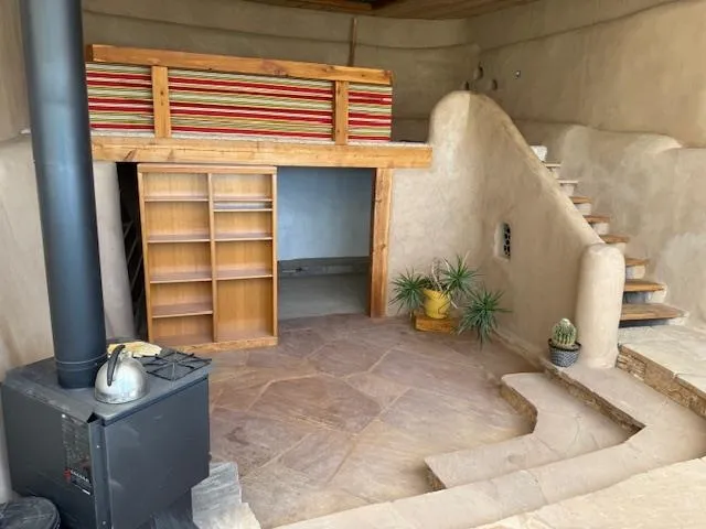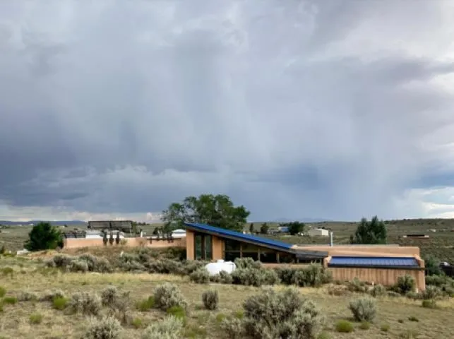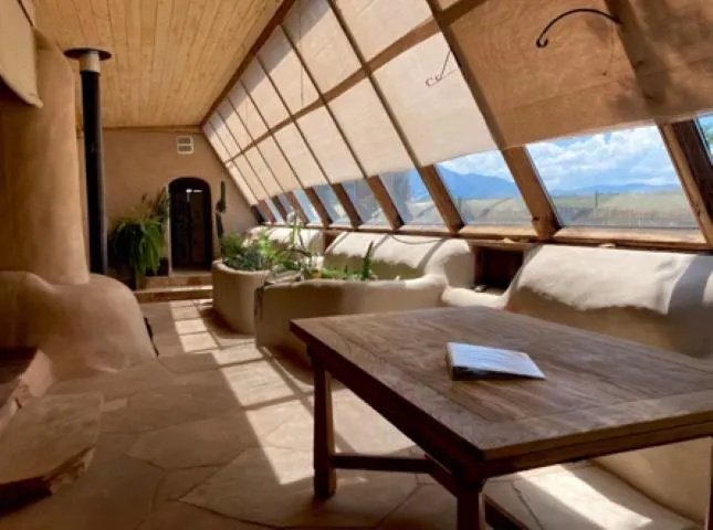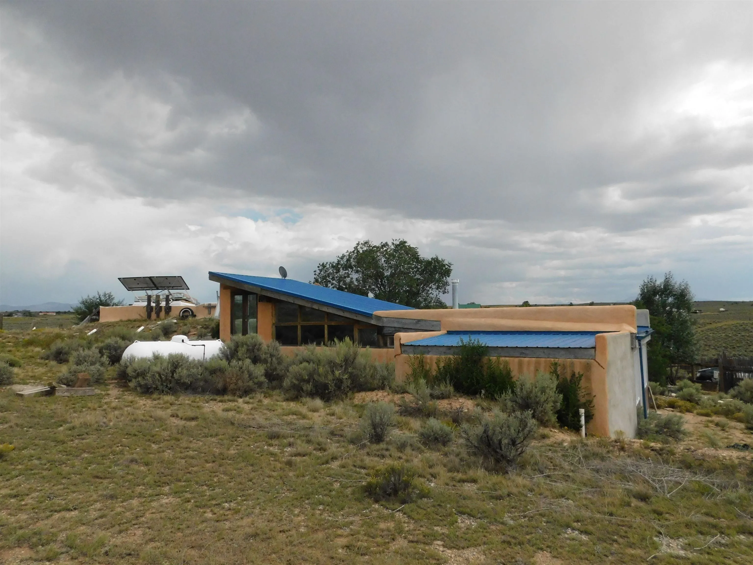 This authentic Taos home originated as an Earthship in 1995, hand-built with rammed earth tire walls on the north, west and east, and a wall of slanted glass on the south. Over time, it expanded with additional greenhouses, workshop, and a studio creating approximately 4000 square feet of interior space. Outdoor latilla fences, gardens, and mature trees create a welcoming atmosphere. Sustainable living guides the heart of the home. The home is a hybrid, using both an off-grid solar electric system This and electricity from Kit Carson Electric. Hardwire is in place for internet (TaosNet) and telephone landline. A water catchment system includes three cisterns with a total capacity of 6000 gallons; rain water is collected from the roofs and gray water is collected separately from the bathroom sink and shower. A new three-bedroom-capacity septic system was placed in spring of 2025, at a cost of $15,800. (See associated document.) Enter the home from the south through the West Greenhouse. This light-filled room has an organic close-to-the-earth feel with outdoor carpet on the ground and translucent ceiling above. To the right is the South Greenhouse with a built-in planter and shelves for more plants—an ideal sitting room to soak in warmth of the sun on cold winter days. Through the West Green House, to the north, are glass doors to an outdoor area and a wide hallway leading to the studio. A metal screen door with locking wood door at the front of the hall leads into the Earthship. Earthship: Through a mudroom with a freestanding closet system, you step on to the flagstone floor of the Earthship and into open area large enough for a family sized dining table and chairs. The room continues along the bank of windows with built-in planters below. To the left, step up to the spacious open kitchen with granite countertops, open shelving, an island with stove, and more open shelving. To the north of the planters is the sunken living room with a wood stove and high ceiling. Behind the living room is a small room under a loft that could be used as an office, library, walk-in closet. Up the open staircase is the large sleeping loft with skylights to let in fresh air and light. Back on the ground floor, at the end of the wall of windows, step up into a large bathroom area with a mirrored closet, vanity sink, walk-in shower, and hot tub and the toilet is in its own little room next to the vanity. Hallway: Down the hallway, before reaching the studio, is a door to the workshop with ample storage space and the solar voltaic components. The wide hall has windows on the top half of the western wall. Studio: At the end of the hallway, also with an entrance from the outside, is a 1200 square foot studio with radiant floor heat. The rectangular room has a vaulted ceiling with a loft at the eastern end. High windows let in northern light. Within the studio is half-bathroom with shower, sink, toilet, and washer hook-up. At the northern end of the studio is a cool storage room and the utility closet that houses the propane radiant floor heating system and on-demand water heater. Additional information: Square footage of the property should be regarded as estimated. Buyer is advised to take measurements and conduct inspection(s) of the home and its systems to assure accuracy and condition. There is no domestic well on this property; neighboring wells are reported to be 400-450’ deep. The current owners augment their drinking water by importing water during dry years and use a Berkey filter for drinking and cooking water. The property survey was updated in the spring of 2025 (see documents). Broker and Brokerage take no responsibility with regard to the size or condition of the property.
