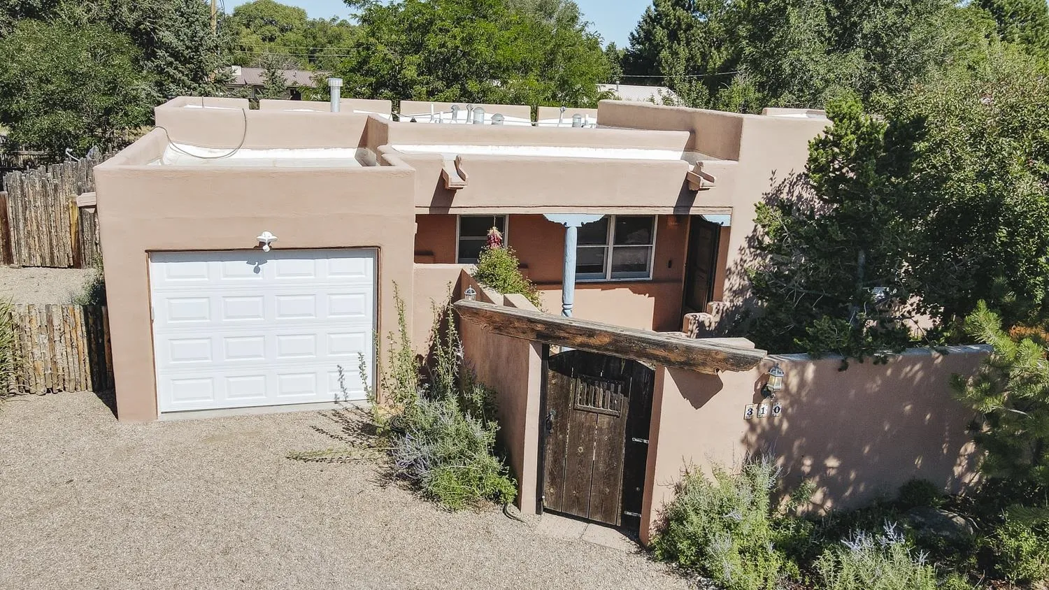 YOUR PICTURE PERFECT TAOS DREAM HOME delivers ultimate comfort with air conditioning and an unbeatable location steps from everything. Discover the enchanting world of Taos with this gorgeous, move-in ready 3-bedroom, 2-bath Pueblo-style home. Fully fenced with a one-car attached garage, this 1462 sq ft residence welcomes you through a beautifully manicured outdoor courtyard with a fountain, immediately setting a serene tone. The well-thought-out open floor plan creates a spacious and inviting atmosphere, perfect for both daily living and entertaining. The kitchen, truly the heart of the house, boasts new upscale appliances, ample counter space for cooking, countertop for casual dining and plenty of storage. The spacious dining/living room extends seamlessly outdoors to a lovely patio—ideal for morning coffee or evening relaxation or entertaining. A large primary bedroom with an attached bathroom opens directly to a hot tub and a stunning landscaped back patio. Two additional bedrooms offer versatile spaces for guests or a dedicated studio. Enjoy the warmth and beauty of tile floors throughout, complemented by a charming Southwestern fireplace, tongue & groove and Viga ceilings that add character and charm. Comfort is paramount with radiant floor heat keeping you warm on chilly evenings, and efficient mini-splits providing year-round climate control. The attached garage has custom shelving and lots of storage. Additionally there is an adorable green shed perfect for additional storage or whatever your needs are. This home comes with the convenience of town water, sewer, and natural gas. Beyond the flagstone patio, you’ll find a meticulously landscaped and treed backyard with a chicken coop and plenty of space for outdoor dining. There are prolific pear trees, a magical quartz fountain and many outside areas to lounge, lunch or meditate. Live in a community where local treasures are just steps away, and the vibrant culture of Taos, including fabulous cafes, new and vibrant restaurants, and the lively Taos Plaza, is at your footsteps.