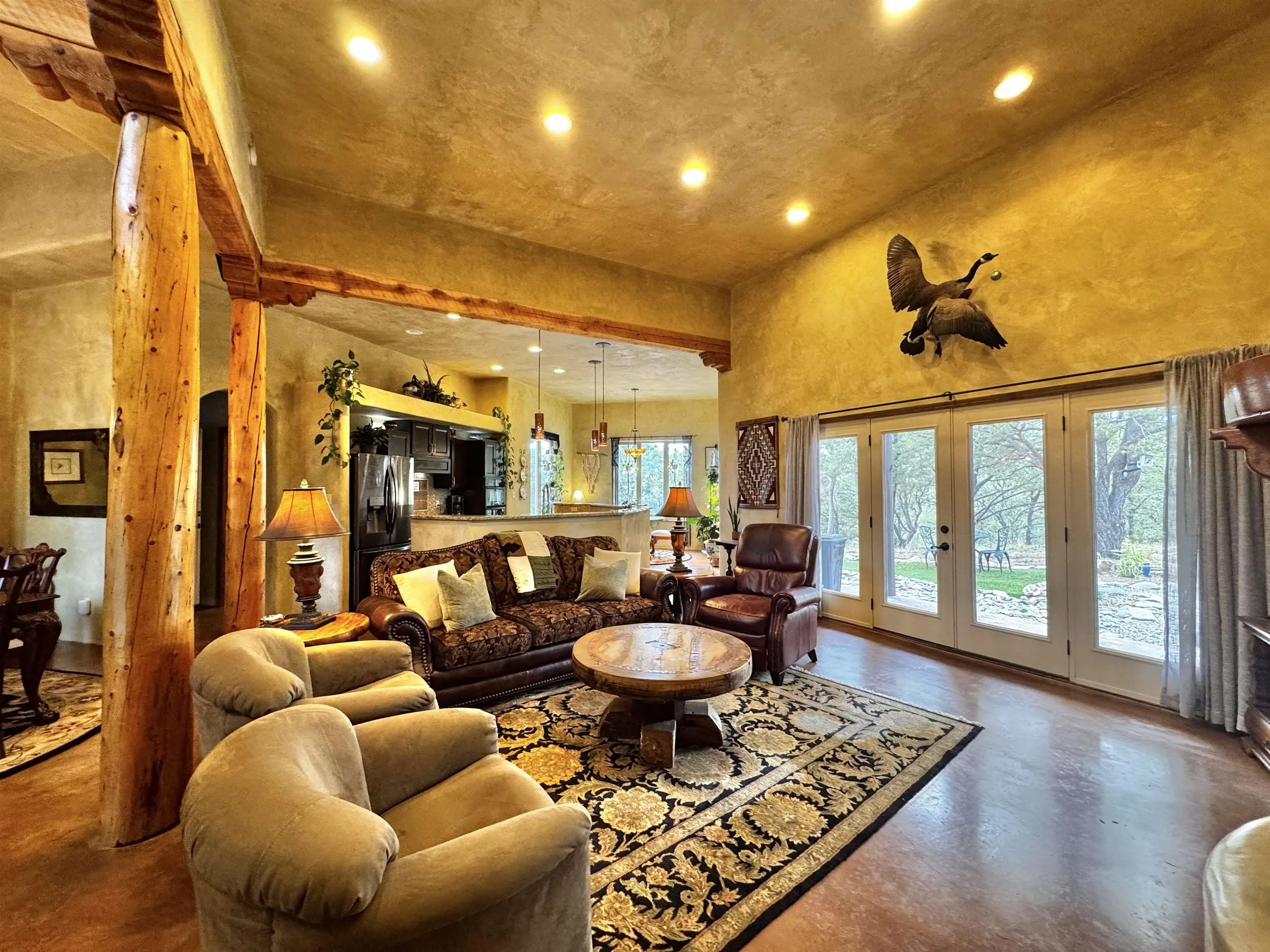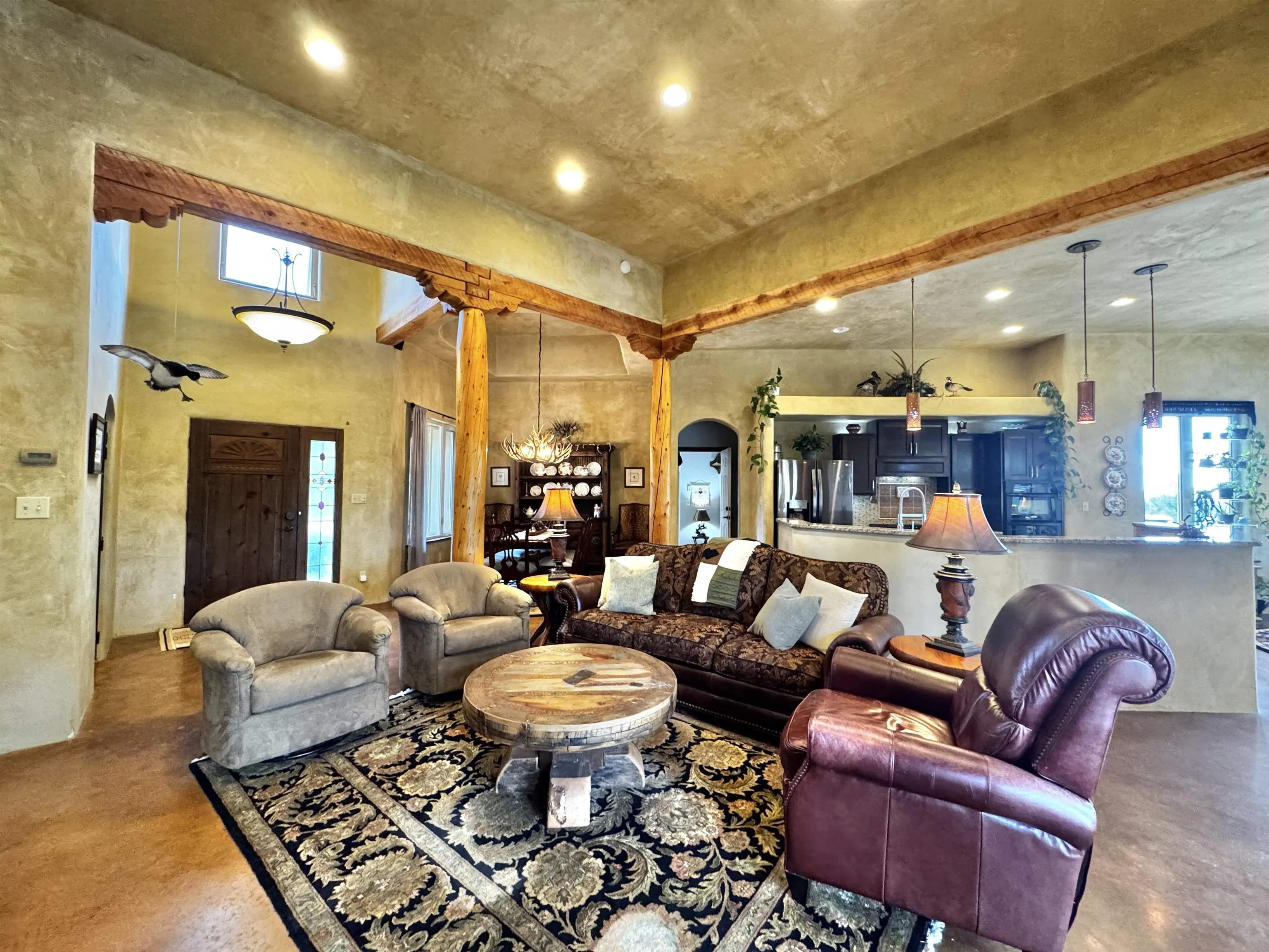 154 Gallina Canyon Road is a unique property situated within the Sangre de Cristo Mountains of the Northern Taos Valley. This remarkable residence is perched high among the pine, juniper, and piñon trees on two acres of serene mountainous land. This exquisite pueblo-style home is approximately 2,475 square feet, and consists of three-bedrooms, and three-bathrooms. Conveniently, there is a bonus room that can be utilized for various purposes. You decide how this space best suits your needs. This home boasts spacious living, comfort and luxury all in one. Soak in the beautiful diamond finished walls, granite counter tops, stained concrete floors, tall ceilings and beautiful wood beams and vigas which create a beautiful and inviting ambiance. Enjoy family meals from the formal dining area or from the more intimate dining space located off the kitchen. Windows can be found throughout the home bringing in an abundance of natural light and nature. The home features two kivas. One is located in the living room. The second can be found in the master bedroom. Both are perfectly located for those cold winter nights. Outside the home, you are welcomed with nicely manicured landscape as well as a large driveway and yard creating ample space to move around. Notably, this property is the sole Gallina Canyon area property available for sale, featuring a detached two-bay, 45’x45’ garage/workshop. The garage is laid upon a concrete foundation and includes a 15’x45′ covered parking area, one roll up 12 foot tall door and one single automatic door. One wall within the garage has a built-in workbench with storage and a built-in mini fridge. Additional storage space, shelving and countertops can be found throughout which adds to the conveniences needed. Additionally, there is a sink with a 10 gallon hot water heater and an exterior gutter system that feeds into two water tanks for watering as well as for emergency fire extinguishing purposes. The home benefits from a private domestic well as well as an above ground sprinkler system. This incredible neighborhood brings tranquility, accessibility and exterior beauty to any outdoor enthusiast, with so many amenities surrounding this property. This house is located only 23 minutes from the Taos Ski Valley, 24 minutes from the Rio Grande Gorge Bridge, 13 minutes from the village or Arroyo Seco, 24 minutes from the Taos Plaza and 23 minutes from the Taos Pueblo. We invite you to schedule your showing today to experience in person what this exquisite property has to offer.