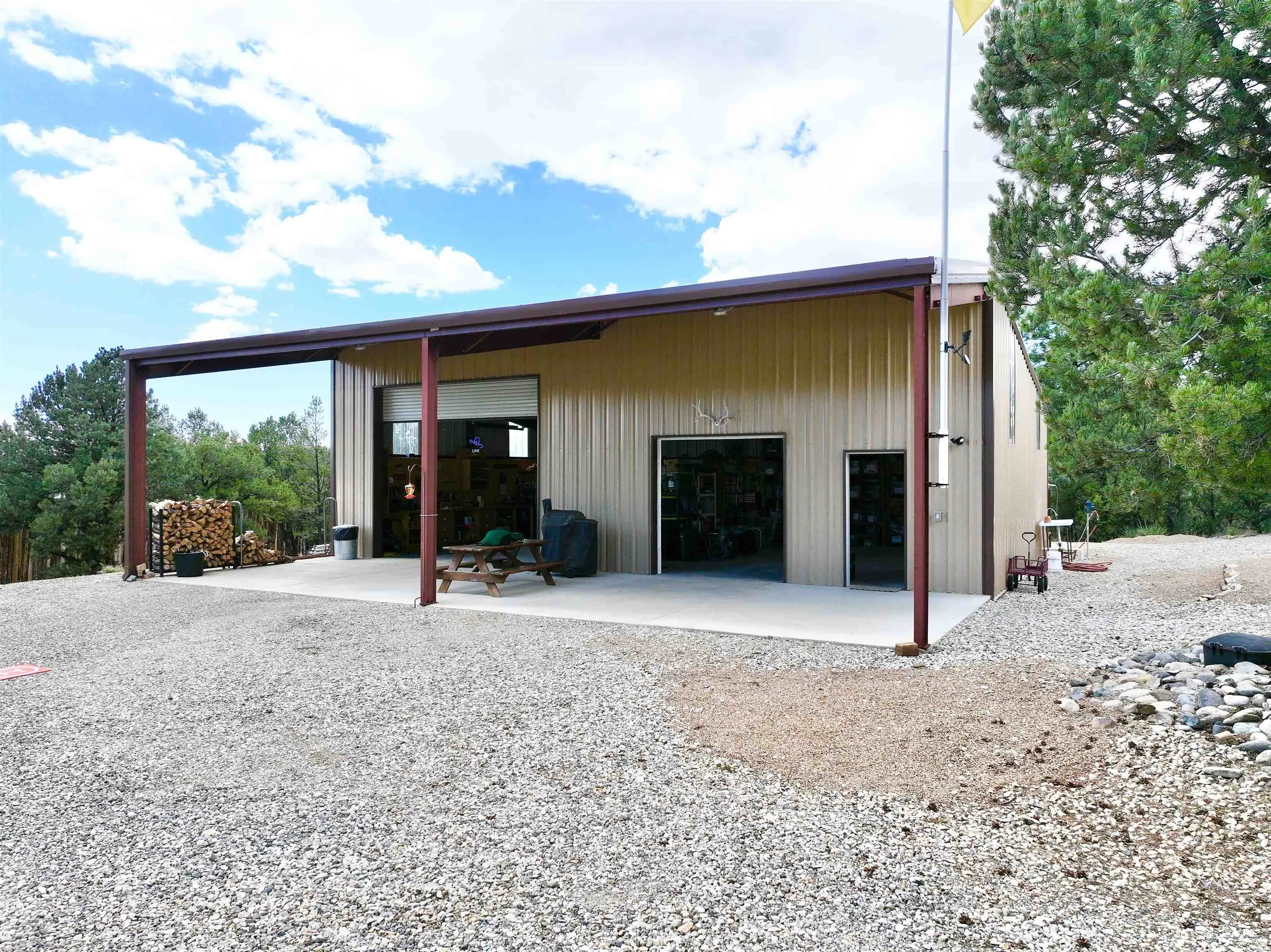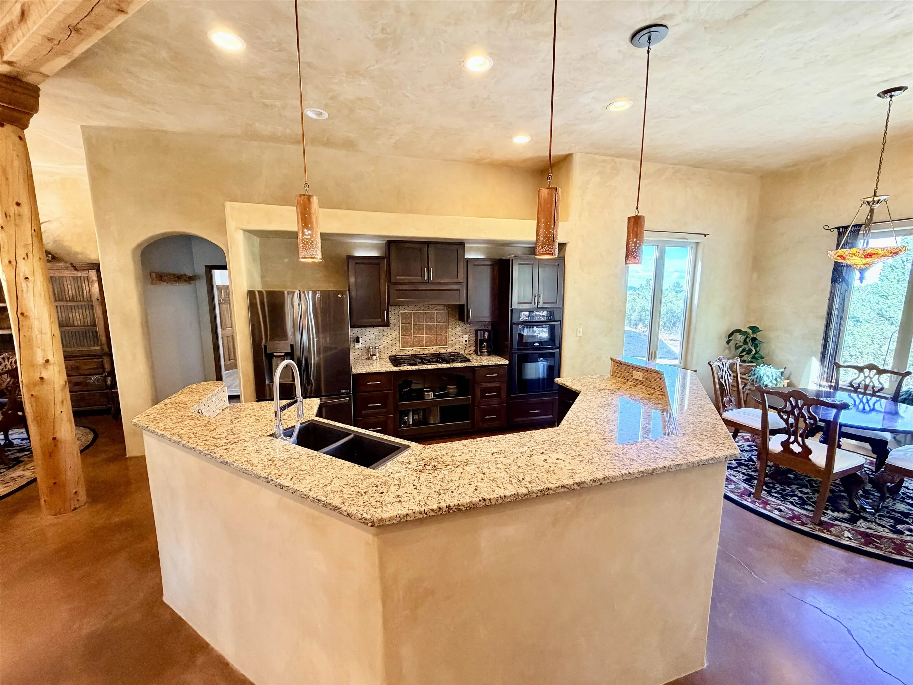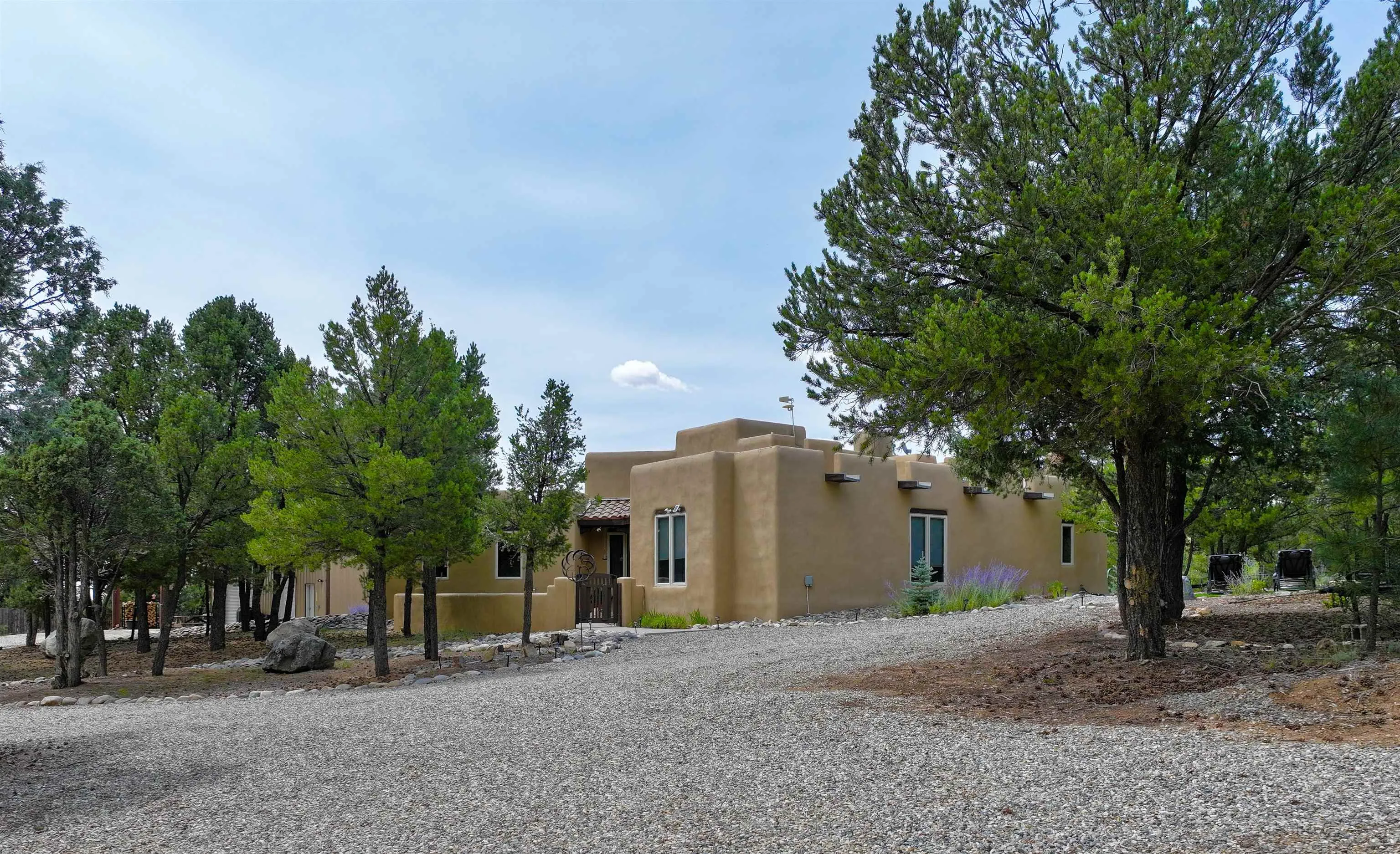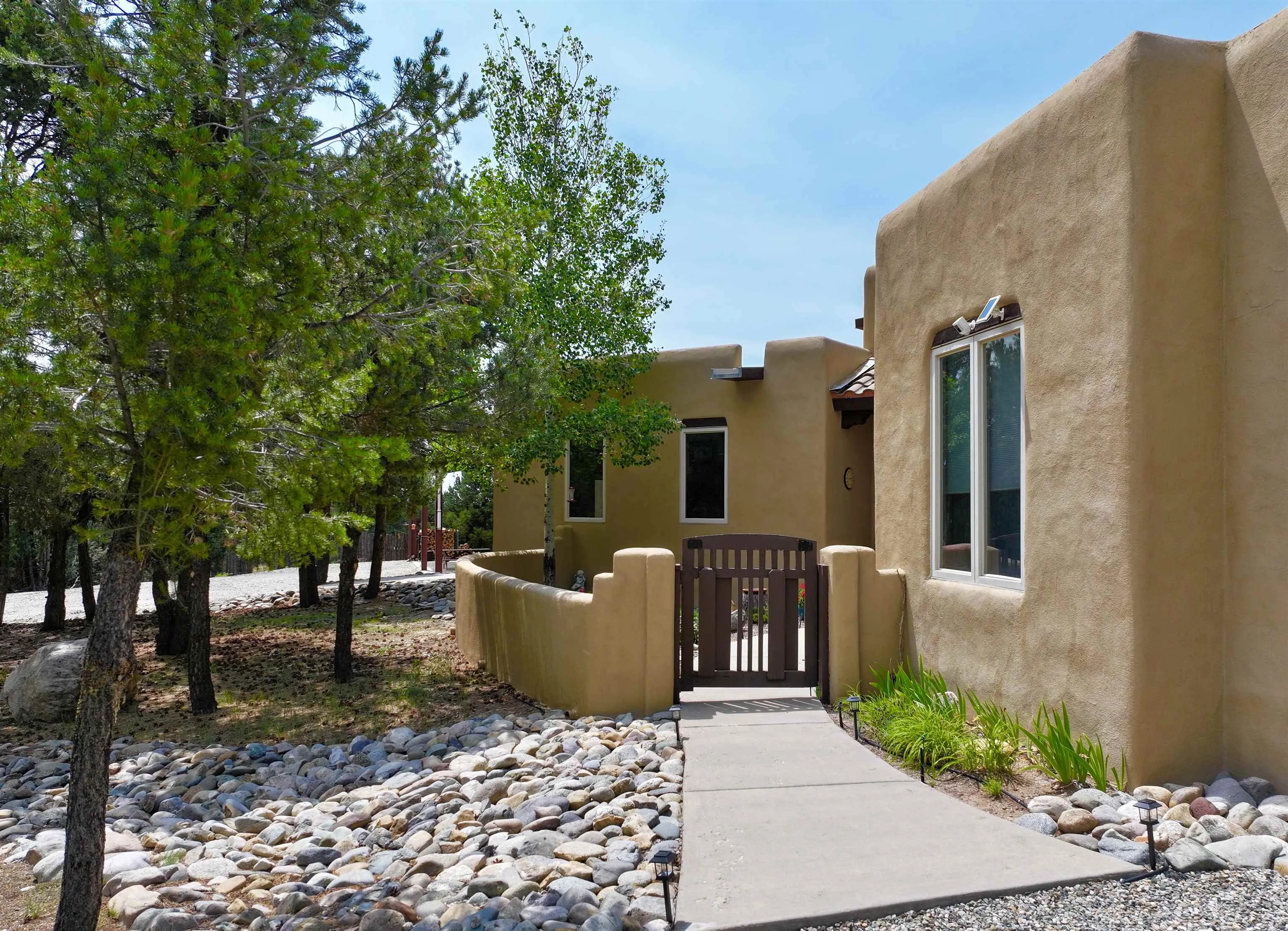 154 Gallina Canyon Road is a unique property situated within the Sangre de Cristo Mountains of the Northern Taos Valley. This remarkable residence is perched high among the pine, juniper, and piñon trees on two acres of serene mountainous land. This exquisite pueblo-style home is approximately 2,475 square feet, and consists of three-bedrooms, and three-bathrooms. Conveniently, there is a bonus room that can be utilized for various purposes. You decide how this space best suits your needs. This home boasts spacious living, comfort and luxury all in one. Soak in the beautiful diamond finished walls, granite counter tops, stained concrete floors, tall ceilings and beautiful wood beams and vigas which create a beautiful and inviting ambiance. Enjoy family meals from the formal dining area or from the more intimate dining space located off the kitchen. Windows can be found throughout the home bringing in an abundance of natural light and nature. The home features two kivas. One is located in the living room. The second can be found in the master bedroom. Both are perfectly located for those cold winter nights. Outside the home, you are welcomed with nicely manicured landscape as well as a large driveway and yard creating ample space to move around. Notably, this property is the sole Gallina Canyon area property available for sale, featuring a detached two-bay, 45’x45’ garage/workshop. The garage is laid upon a concrete foundation and includes a 15’x45′ covered parking area, one roll up 12 foot tall door and one single automatic door. One wall within the garage has a built-in workbench with storage and a built-in mini fridge. Additional storage space, shelving and countertops can be found throughout which adds to the conveniences needed. Additionally, there is a sink with a 10 gallon hot water heater and an exterior gutter system that feeds into two water tanks for watering as well as for emergency fire extinguishing purposes. The home benefits from a private domestic well as well as an above ground sprinkler system. This incredible neighborhood brings tranquility, accessibility and exterior beauty to any outdoor enthusiast, with so many amenities surrounding this property. This house is located only 23 minutes from the Taos Ski Valley, 24 minutes from the Rio Grande Gorge Bridge, 13 minutes from the village or Arroyo Seco, 24 minutes from the Taos Plaza and 23 minutes from the Taos Pueblo. We invite you to schedule your showing today to experience in person what this exquisite property has to offer.