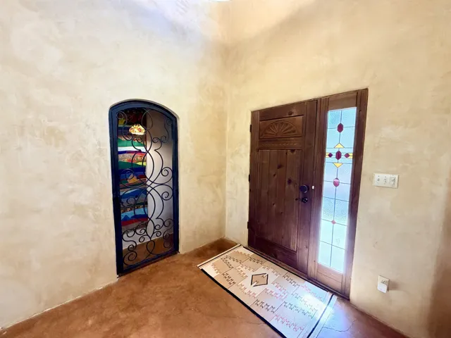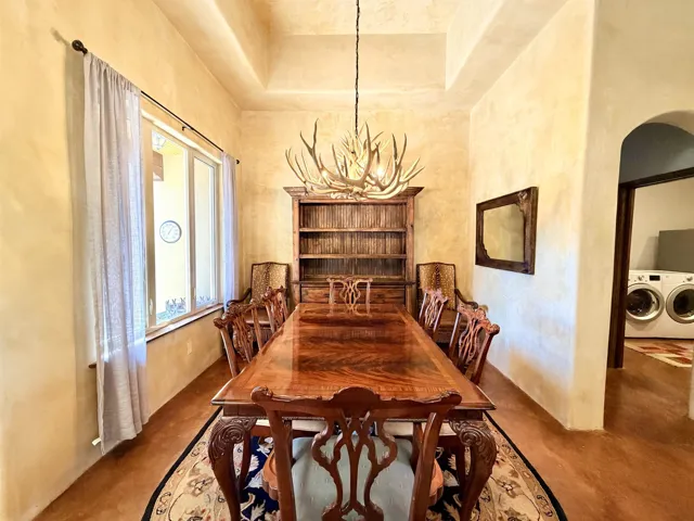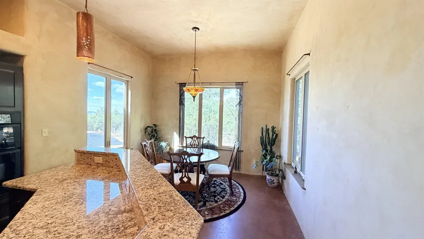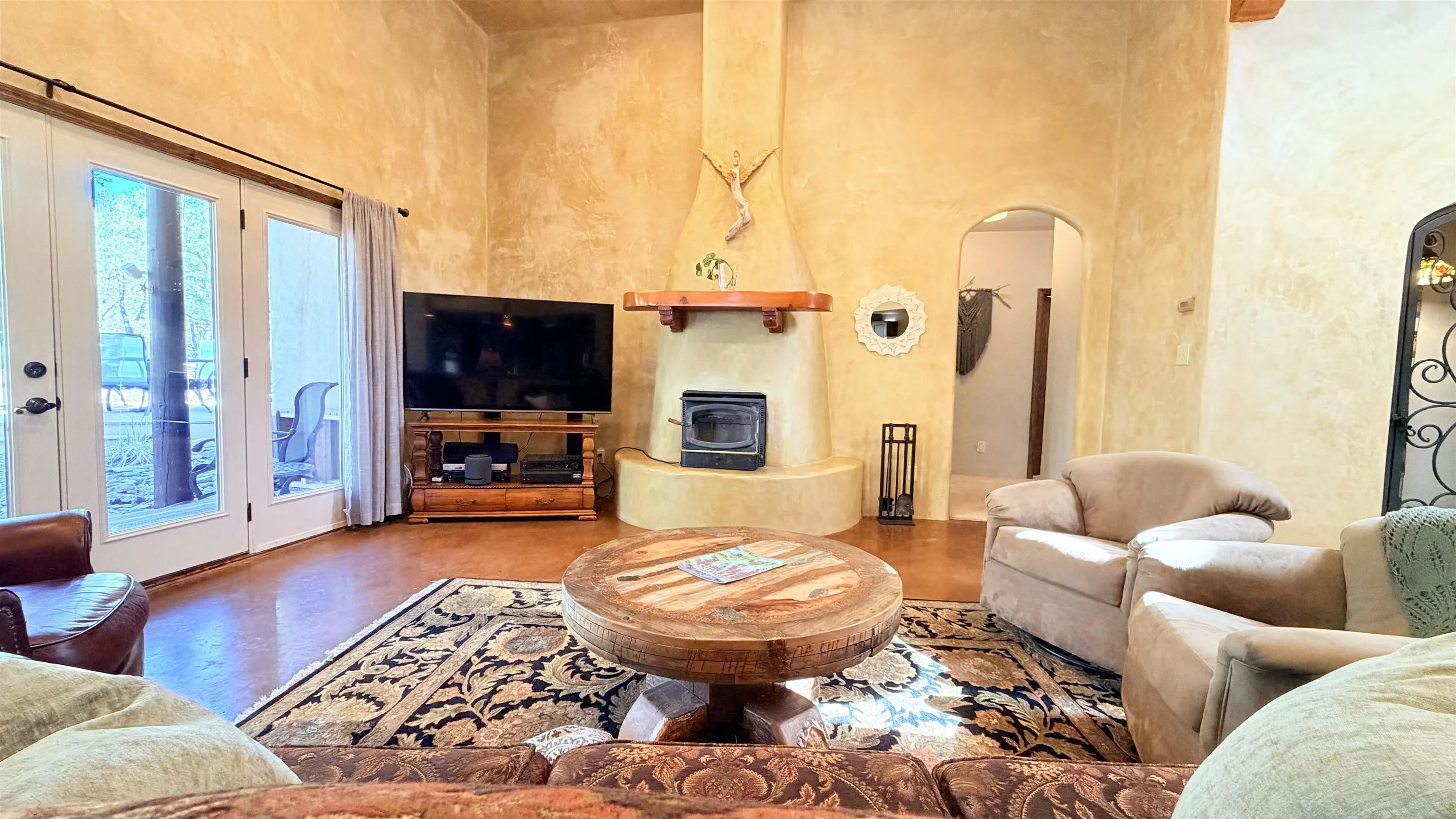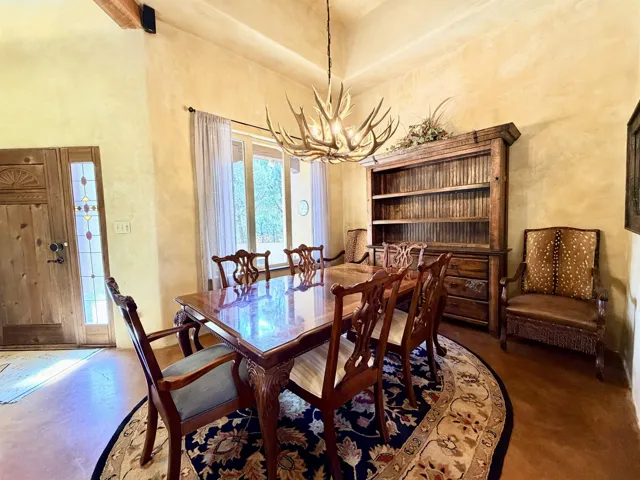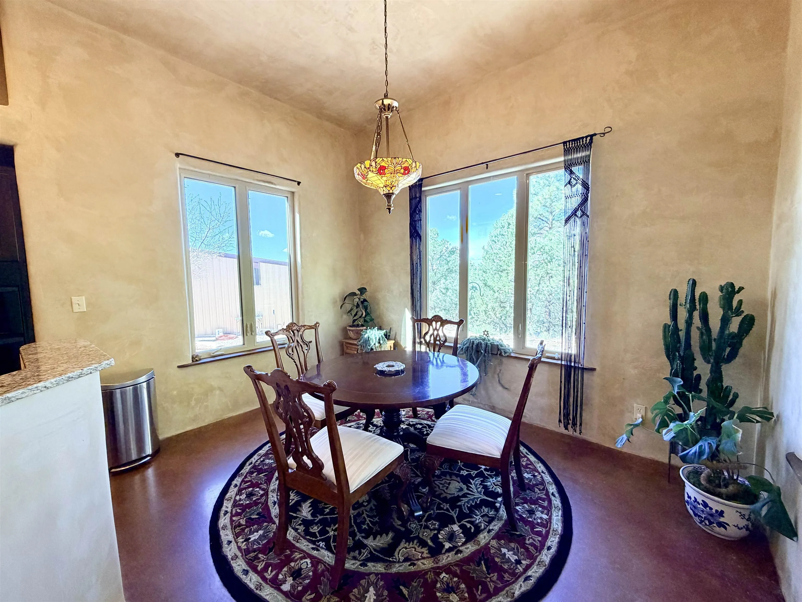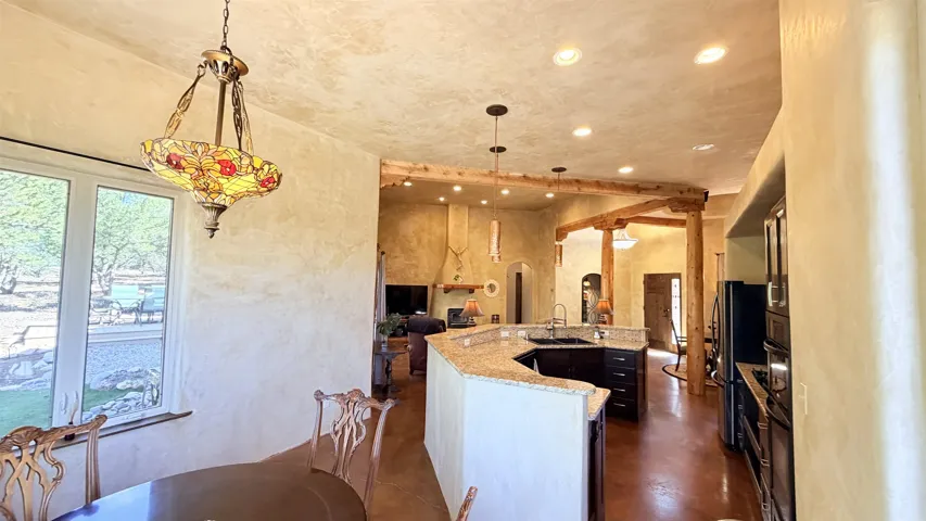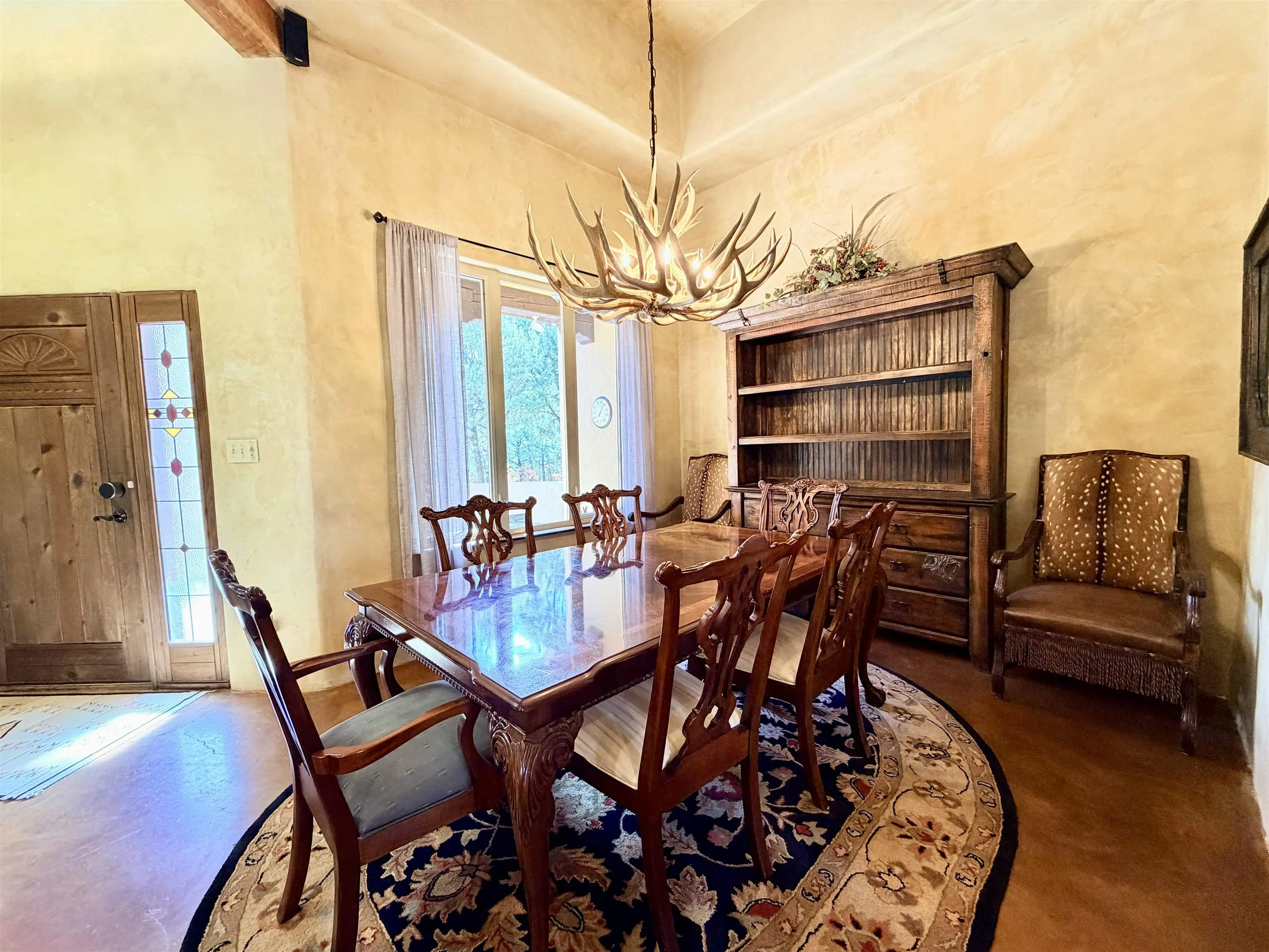 154 Gallina Canyon Road is a unique property situated within the Sangre de Cristo Mountains of the Northern Taos Valley. This remarkable residence is perched high among the pine, juniper, and piñon trees on two acres of serene mountainous land. This exquisite pueblo-style home is approximately 2,475 square feet, and consists of three-bedrooms, and three-bathrooms. Conveniently, there is a bonus room that can be utilized for various purposes. You decide how this space best suits your needs. This home boasts spacious living, comfort and luxury all in one. Soak in the beautiful diamond finished walls, granite counter tops, stained concrete floors, tall ceilings and beautiful wood beams and vigas which create a beautiful and inviting ambiance. Enjoy family meals from the formal dining area or from the more intimate dining space located off the kitchen. Windows can be found throughout the home bringing in an abundance of natural light and nature. The home features two kivas. One is located in the living room. The second can be found in the master bedroom. Both are perfectly located for those cold winter nights. Outside the home, you are welcomed with nicely manicured landscape as well as a large driveway and yard creating ample space to move around. Notably, this property is the sole Gallina Canyon area property available for sale, featuring a detached two-bay, 45’x45’ garage/workshop. The garage is laid upon a concrete foundation and includes a 15’x45′ covered parking area, one roll up 12 foot tall door and one single automatic door. One wall within the garage has a built-in workbench with storage and a built-in mini fridge. Additional storage space, shelving and countertops can be found throughout which adds to the conveniences needed. Additionally, there is a sink with a 10 gallon hot water heater and an exterior gutter system that feeds into two water tanks for watering as well as for emergency fire extinguishing purposes. The home benefits from a private domestic well as well as an above ground sprinkler system. This incredible neighborhood brings tranquility, accessibility and exterior beauty to any outdoor enthusiast, with so many amenities surrounding this property. This house is located only 23 minutes from the Taos Ski Valley, 24 minutes from the Rio Grande Gorge Bridge, 13 minutes from the village or Arroyo Seco, 24 minutes from the Taos Plaza and 23 minutes from the Taos Pueblo. We invite you to schedule your showing today to experience in person what this exquisite property has to offer.