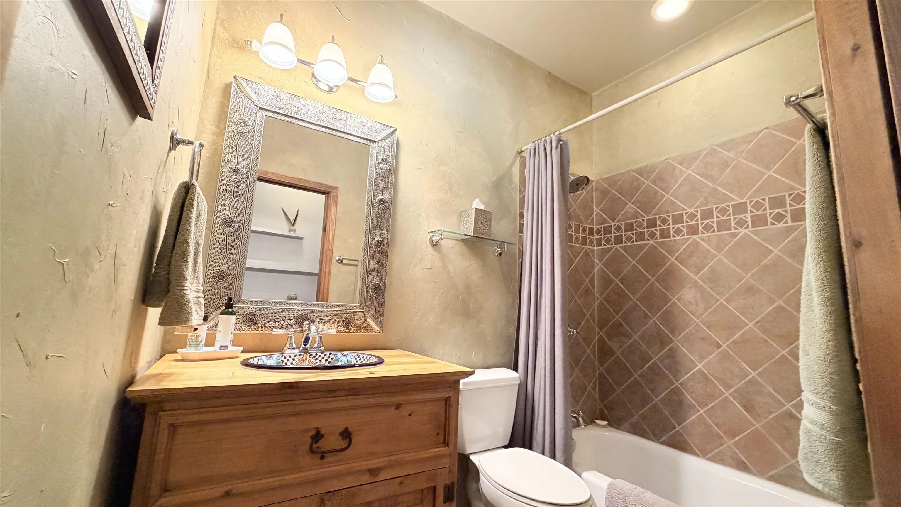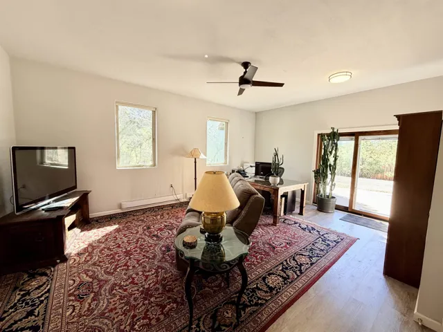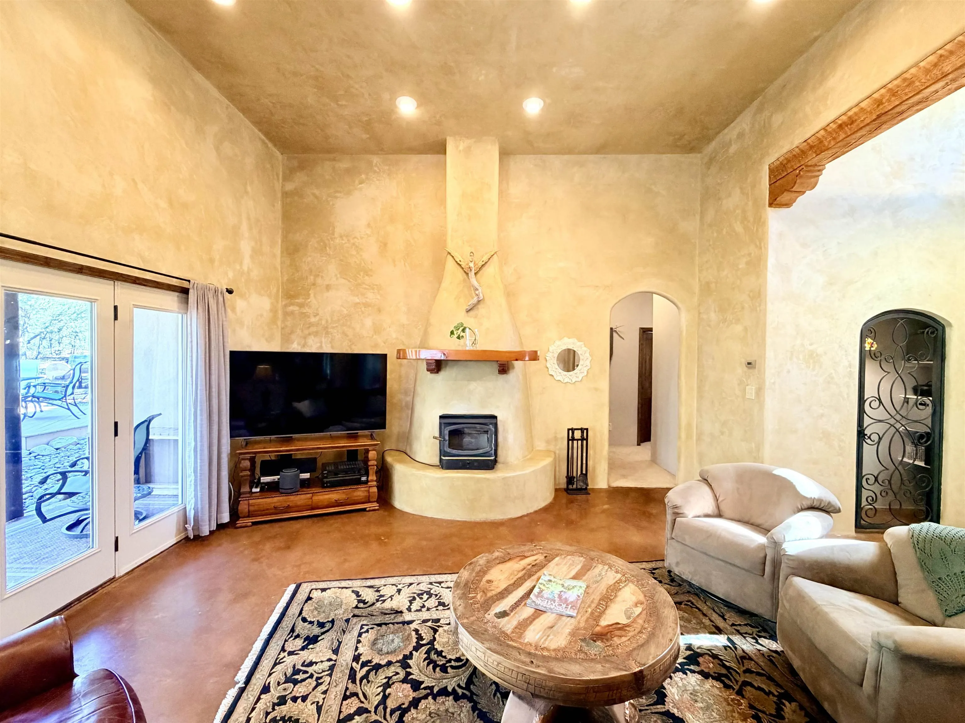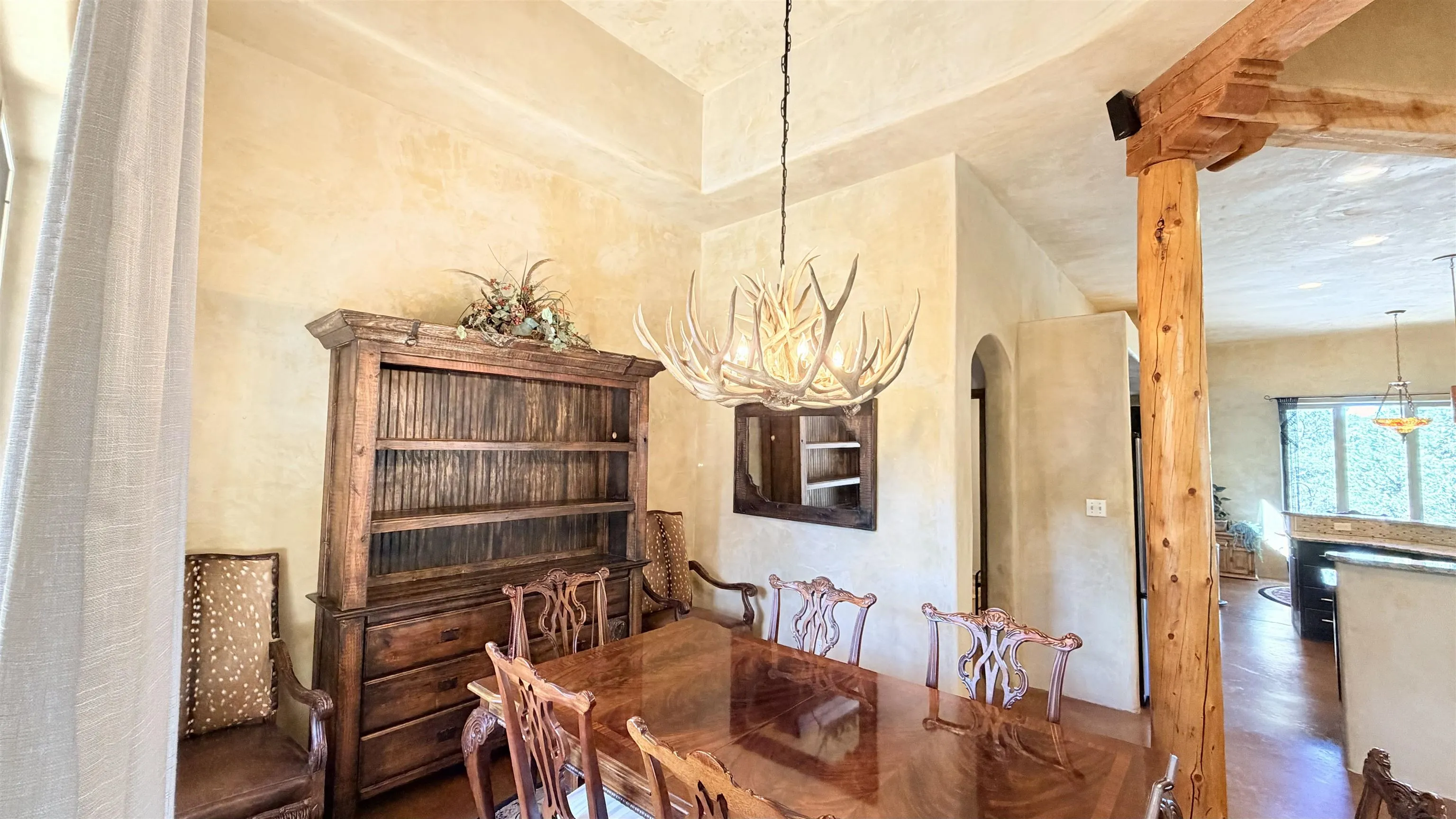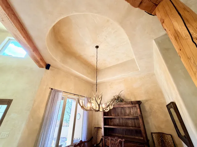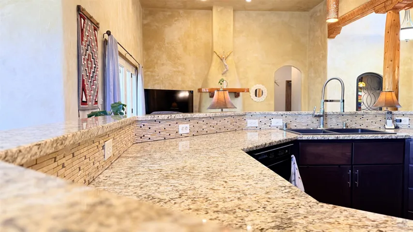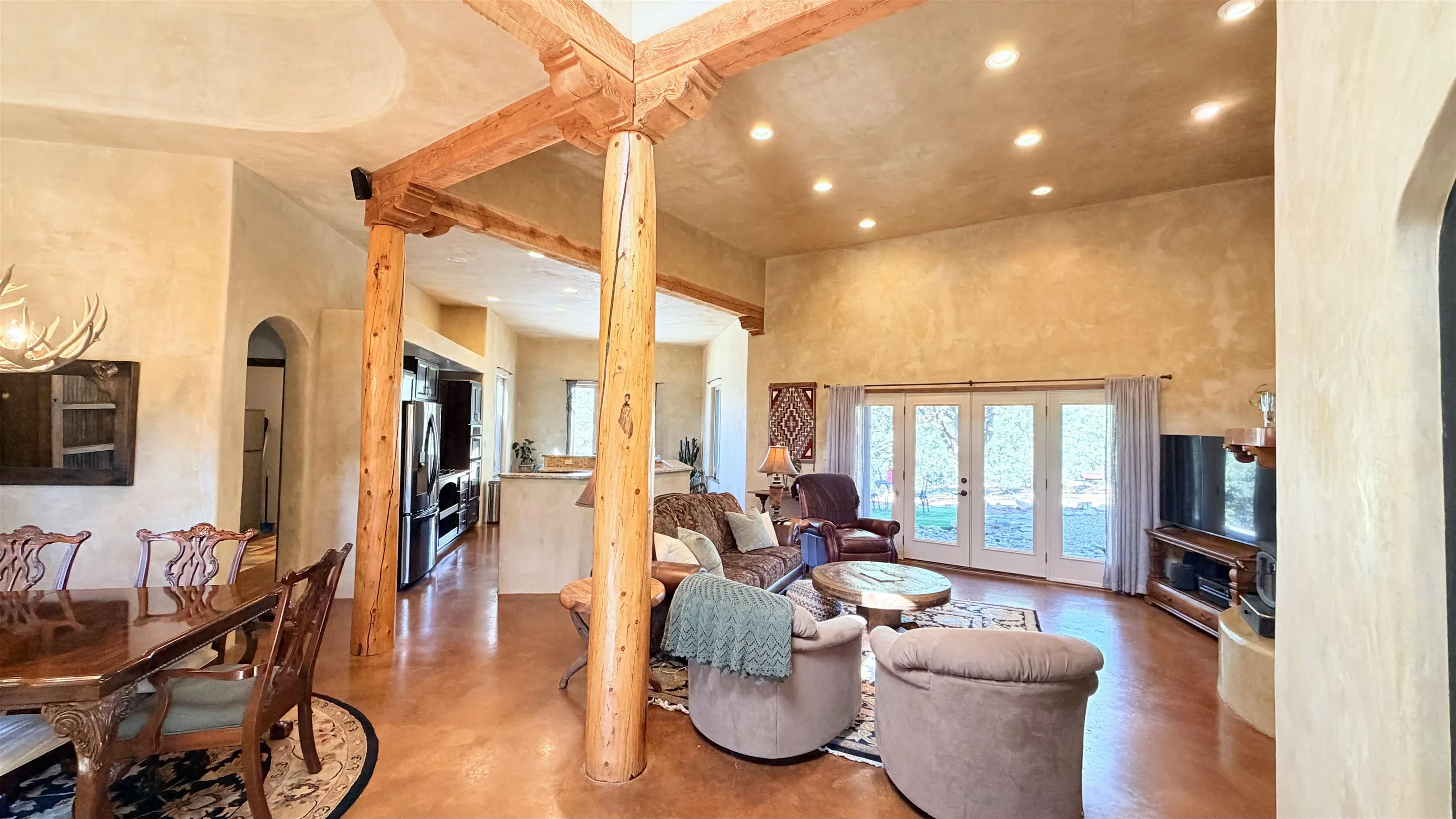 154 Gallina Canyon Road is a unique property situated within the Sangre de Cristo Mountains of the Northern Taos Valley. This remarkable residence is perched high among the pine, juniper, and piñon trees on two acres of serene mountainous land. This exquisite pueblo-style home is approximately 2,475 square feet, and consists of three-bedrooms, and three-bathrooms. Conveniently, there is a bonus room that can be utilized for various purposes. You decide how this space best suits your needs. This home boasts spacious living, comfort and luxury all in one. Soak in the beautiful diamond finished walls, granite counter tops, stained concrete floors, tall ceilings and beautiful wood beams and vigas which create a beautiful and inviting ambiance. Enjoy family meals from the formal dining area or from the more intimate dining space located off the kitchen. Windows can be found throughout the home bringing in an abundance of natural light and nature. The home features two kivas. One is located in the living room. The second can be found in the master bedroom. Both are perfectly located for those cold winter nights. Outside the home, you are welcomed with nicely manicured landscape as well as a large driveway and yard creating ample space to move around. Notably, this property is the sole Gallina Canyon area property available for sale, featuring a detached two-bay, 45’x45’ garage/workshop. The garage is laid upon a concrete foundation and includes a 15’x45′ covered parking area, one roll up 12 foot tall door and one single automatic door. One wall within the garage has a built-in workbench with storage and a built-in mini fridge. Additional storage space, shelving and countertops can be found throughout which adds to the conveniences needed. Additionally, there is a sink with a 10 gallon hot water heater and an exterior gutter system that feeds into two water tanks for watering as well as for emergency fire extinguishing purposes. The home benefits from a private domestic well as well as an above ground sprinkler system. This incredible neighborhood brings tranquility, accessibility and exterior beauty to any outdoor enthusiast, with so many amenities surrounding this property. This house is located only 23 minutes from the Taos Ski Valley, 24 minutes from the Rio Grande Gorge Bridge, 13 minutes from the village or Arroyo Seco, 24 minutes from the Taos Plaza and 23 minutes from the Taos Pueblo. We invite you to schedule your showing today to experience in person what this exquisite property has to offer.