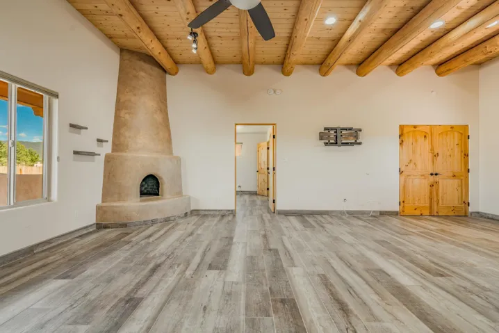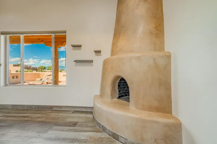 Wow! This home has a LOT of elements that make it an ideal place to live. Want to know more? Set off a dead-end road with a perfect floor plan, views, no deferred maintenance, with the most ideal bedroom and bathroom count — this home is rockin’! The road and parking area are fully graveled — no dirt or mud to worry about. The front courtyard is gated with custom metal gates set in an adobe wall and features a big flagstone patio, a large real rock water feature, and great Taos Mountain views you can also enjoy from the living room and master. Inside, you’ve got 1,382 sq ft, 3 bedrooms, and 2 full baths. The living room feels open with 12’ tongue-and-groove ceilings with large vigas, and a wood-burning kiva fireplace with a nice diamond plaster finish. The kitchen has granite counters, oversized cabinets, stainless steel appliances, and even a wine cooler. In the spaces where window coverings matter most, you’ll find top-of-the-line Hunter Douglas cellular blinds already in place! The master suite comes with a walk-in closet, dual vanity sinks, and large windows that let in tons of natural light. The house was built in 2021, so there’s no deferred maintenance. It’s heated by radiant floor heat with an on-demand boiler powered by natural gas for low heating bills. The attached 2-car garage is heated and completely finished. There’s also a whole-house water softener, ADT security system (just needs activation), and a dedicated laundry closet. Out back, you’ll find a fully fenced yard that’s perfect for pets, a portal with a matching flagstone patio, and a brand-new oversized shed for storage. Xeriscaping in the front keeps things easy, and the neighborhood itself is quiet and welcoming. Put your roots down in this neighborhood!