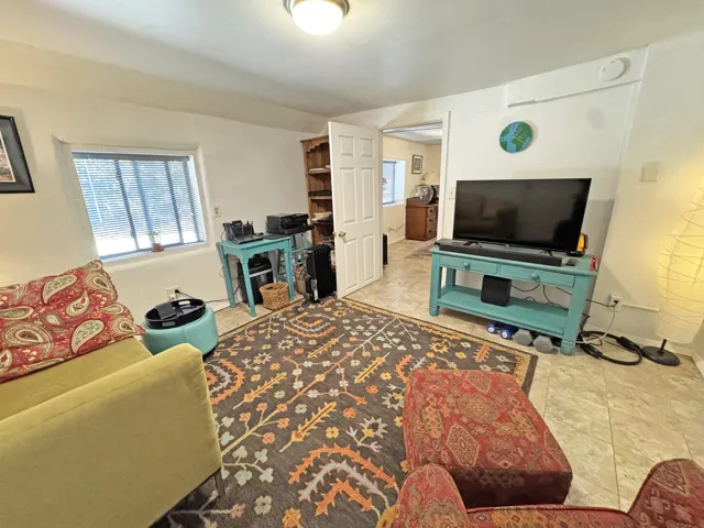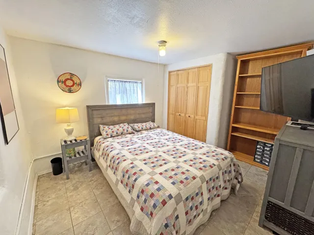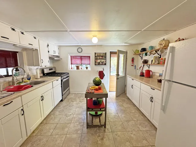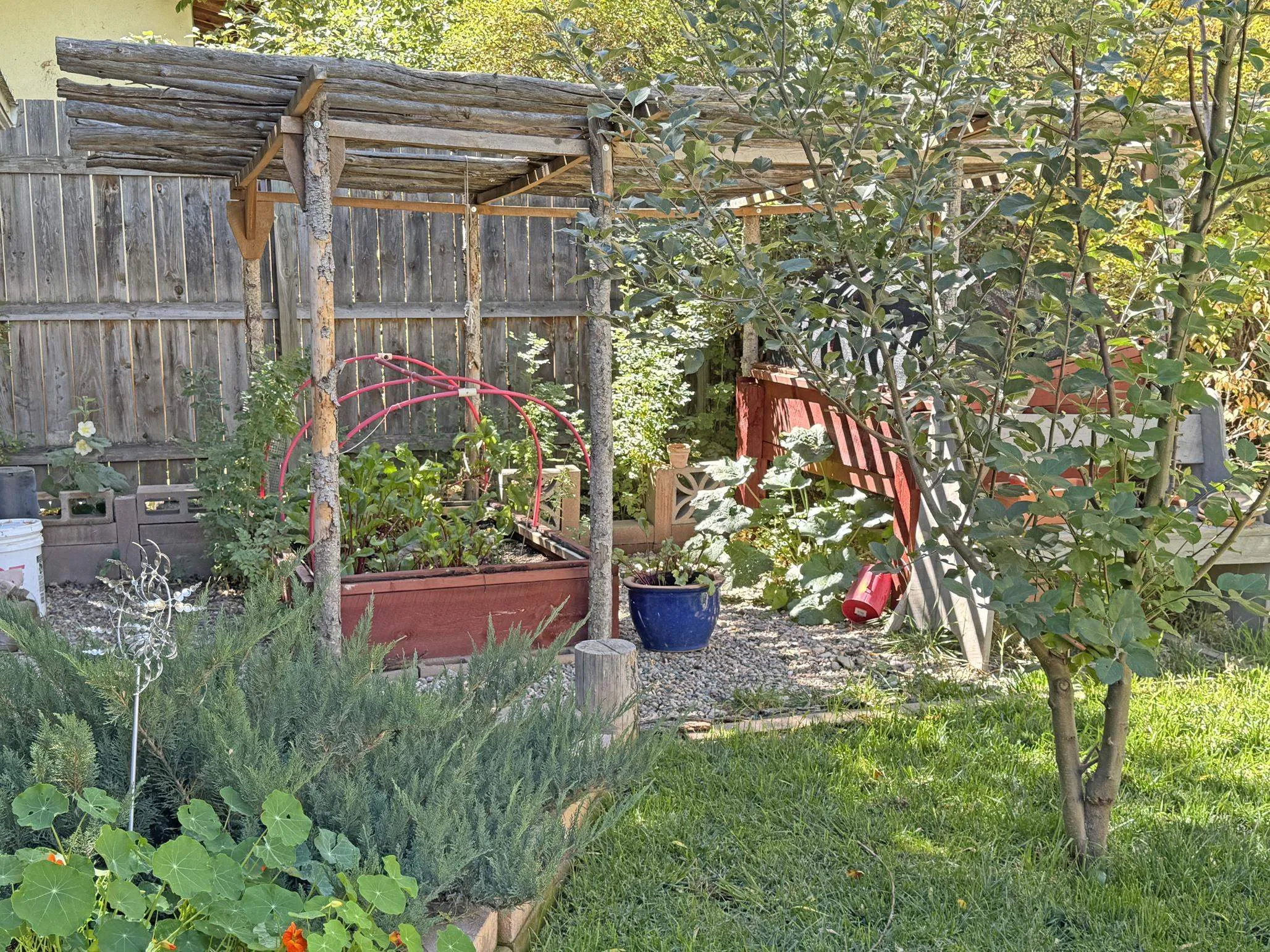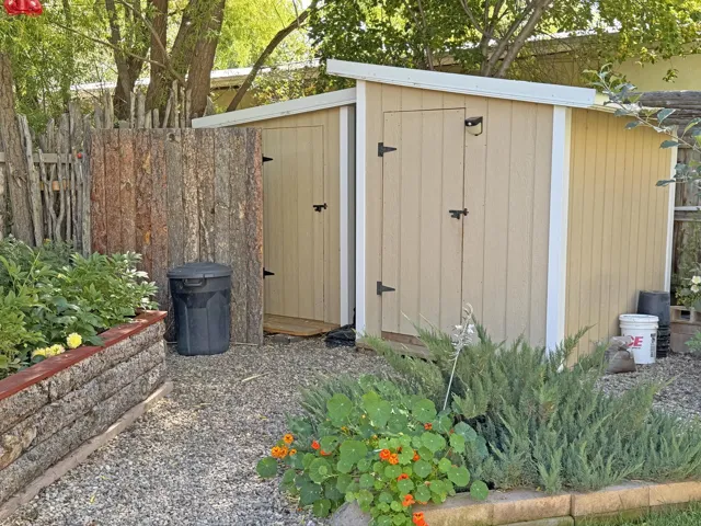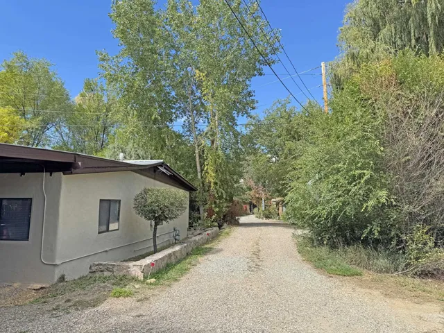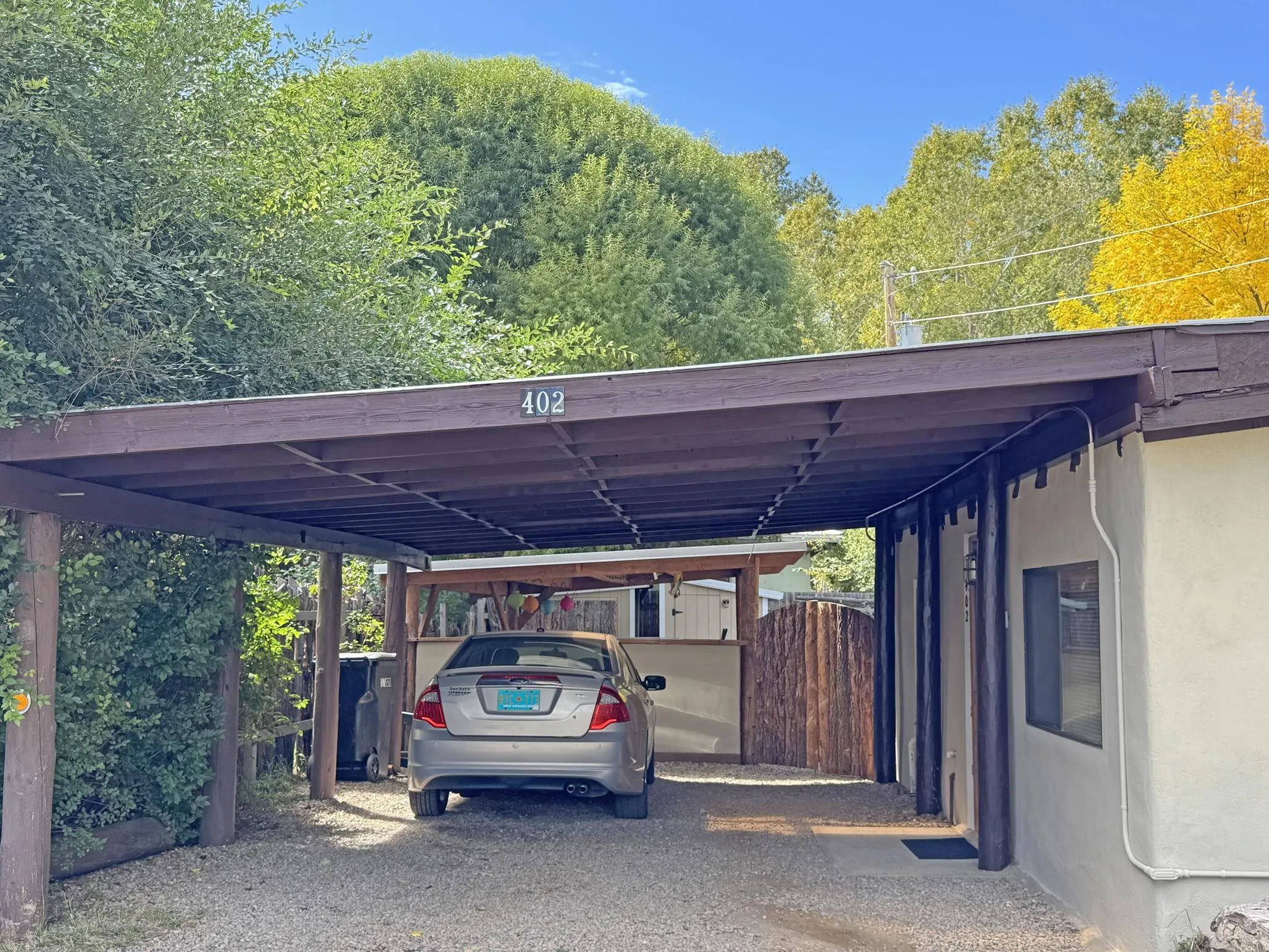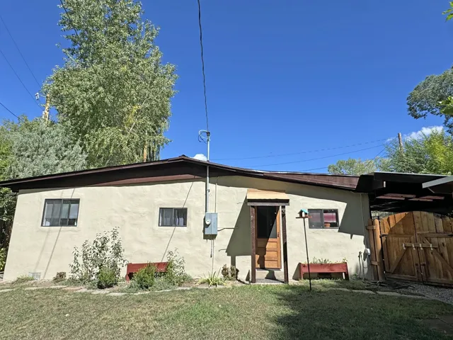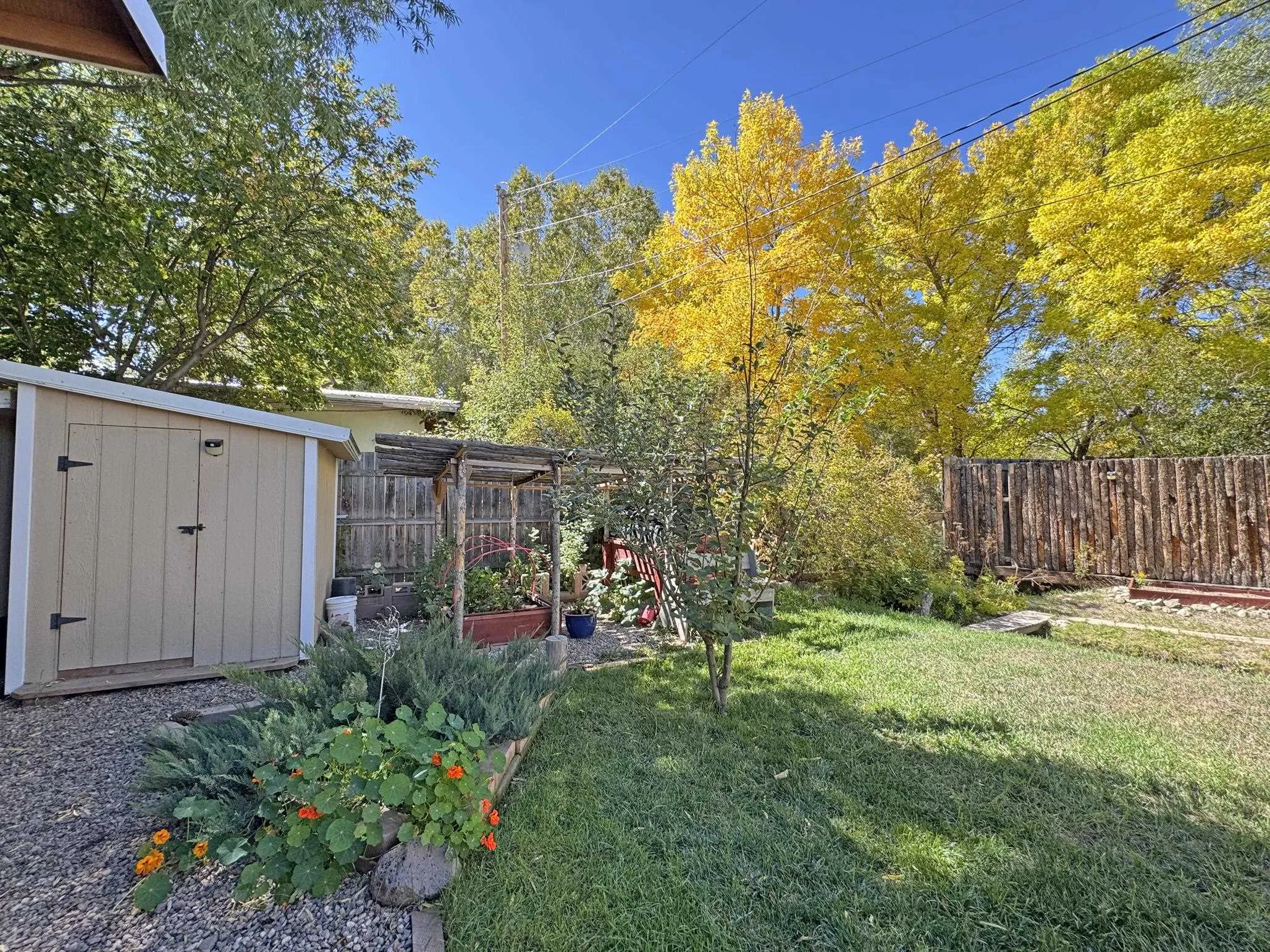 Sweet, affordable, renovated in-town ’60’s vintage 928sf adobe with lots of natural light! Views of Taos Mountain. Open, sensible two bedroom/one bathroom open floorplan. 2017 renovation includes new country kitchen and tub/shower bathroom cabinets and fixtures, propanel roof, Thermopane windows, vinyl tile floors, paint, water heater, and natural gas heaters. 2017 appliances, including washer and dryer in utility room, convey with sale. Continuing renovations through 2025 include freshly painted exterior trim and new stucco paint. Sited on a private, verdant lot with seasonal acequia periodically running all summer, native grass, mature trees and spacious ramada for outdoors entertaining. Two attractive and substantial storage sheds tastefully tucked into the corner of the back yard. Landscape beds with bright perennials; two apple trees, and raised vegetable beds with shade and hoops for fresh produce. Fully fenced back yard with old growth tree overhang and bright Fall color. Pitched propanel roof. Attached spacious carport accommodates two tandem parked cars. Strong cell service and Kit Carson fiber optic Internet. GPS: 36.41088187038228, -105.57988665662972. Located on a quiet dead end street with easy walk to Taos Plaza and all Town amenities. Perfect starter home, in-town vacation cottage or easy investment property. These don’t come along often!