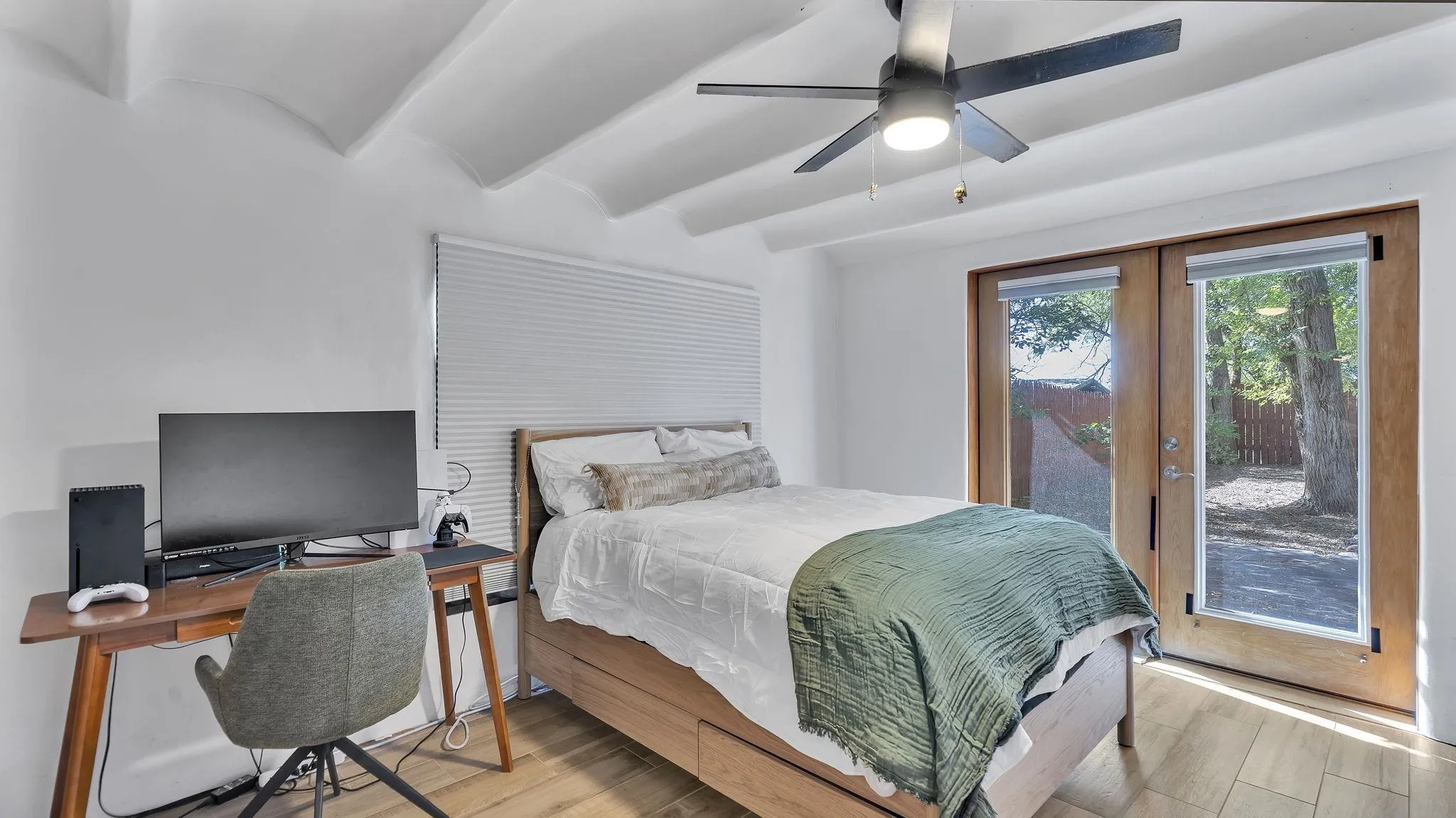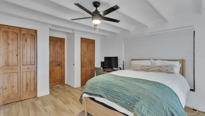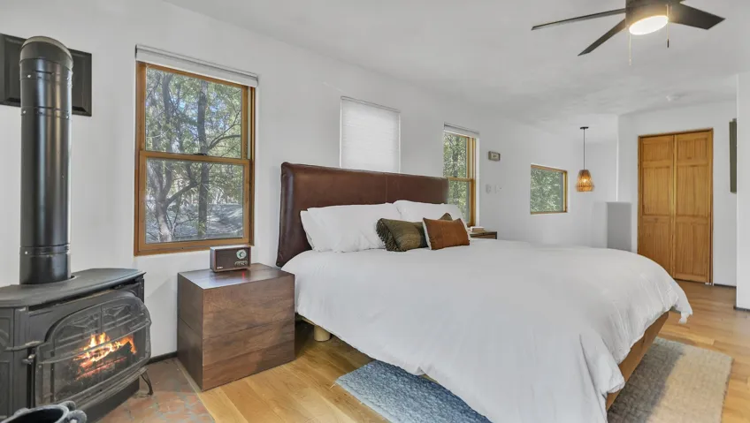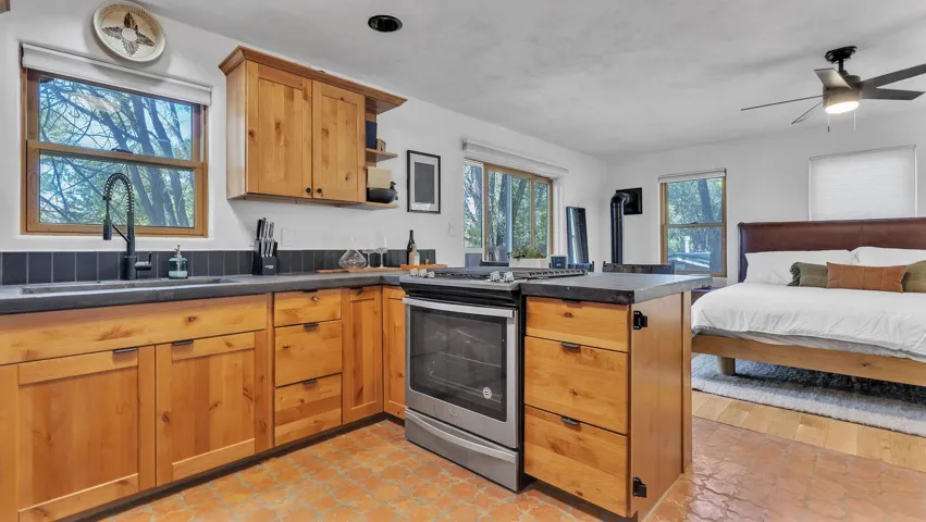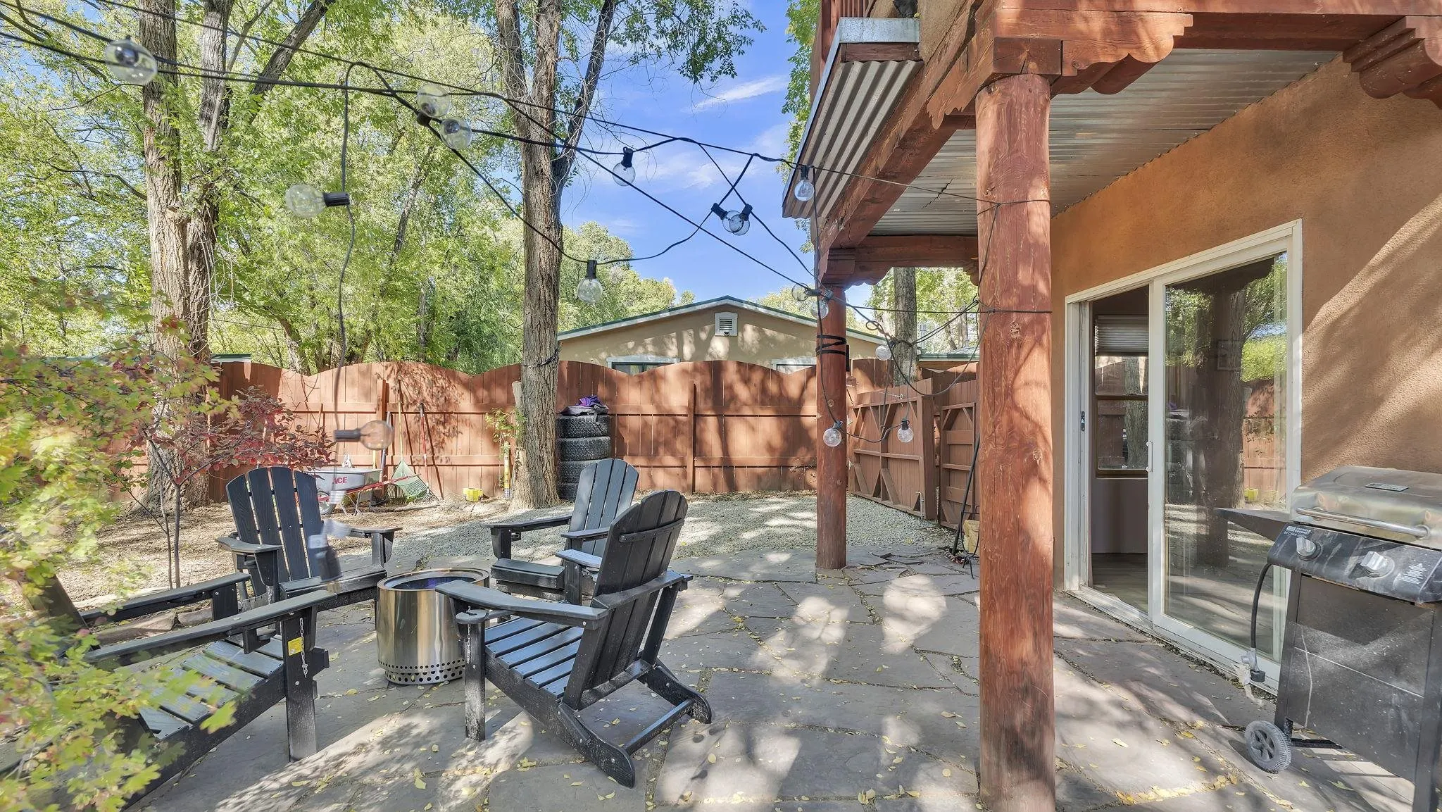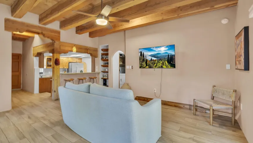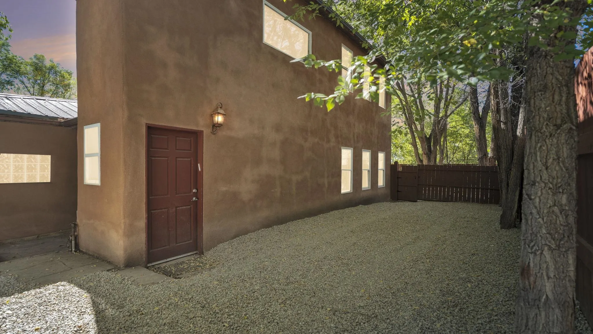 True Taos Charm on Montoya Street Near Taos Plaza ~ This authentic, beautifully remodeled adobe home is a downtown Taos masterpiece, blending historic character with modern luxury. Located just a short stroll from the Taos Plaza, this 1940s-era property features a main house with 3 bedrooms and 2 baths, plus a valuable detached upstairs studio apartment perfect for rental income or a private guest space. Inside the main home, the renovation is meticulous. High-end fixtures complement classic Southwestern style, including elegant oiled pine beams and corbels on the ceilings, and flagstone and wood-inspired tile floors. The kitchen is a chefs desire with stainless steel appliances, thoughtful space, and ample storage. The central living space with extra high ceilings is where you make year-round memories with family and friends. Spacious bedrooms are bathed in natural sunlight, and two offer direct access to the lush, shaded outdoor patios. The home sits on a large, landscaped lot that borders Couse Pasture, providing a fenced backyard ideal for pets to roam and children to play. These spaces, along with the thoughtful layout of the home are designed for entertaining guest for all the holidays and Park Concerts. At this location you are also close to the chic and newly restored Hotel Willa where you will experience some of the finest hospitality and dining in the Southwest. This property is a rare “Old Taos” gem, offering the ultimate walkability and privacy. Owning a home here means immersing yourself in the many special features of Taos, New Mexico. Nestled against the dramatic backdrop of the Sangre de Cristo Mountains, Taos is renowned for its vibrant art scene, with world-class galleries and museums around every corner. It’s a haven for outdoor enthusiasts, offering year-round recreation from skiing and snowboarding at Taos Ski Valley to hiking, mountain biking, hunting, fishing, and whitewater rafting on the Rio Grande. The town is rich with history and culture, and offers a unique blend of Native American, Hispanic, and Anglo traditions. In Taos you’ll find a community that values both the high desert’s serene beauty and a lively, independent spirit. At this home you will find the comfort and peace you’ve been looking for in our majestic high desert
