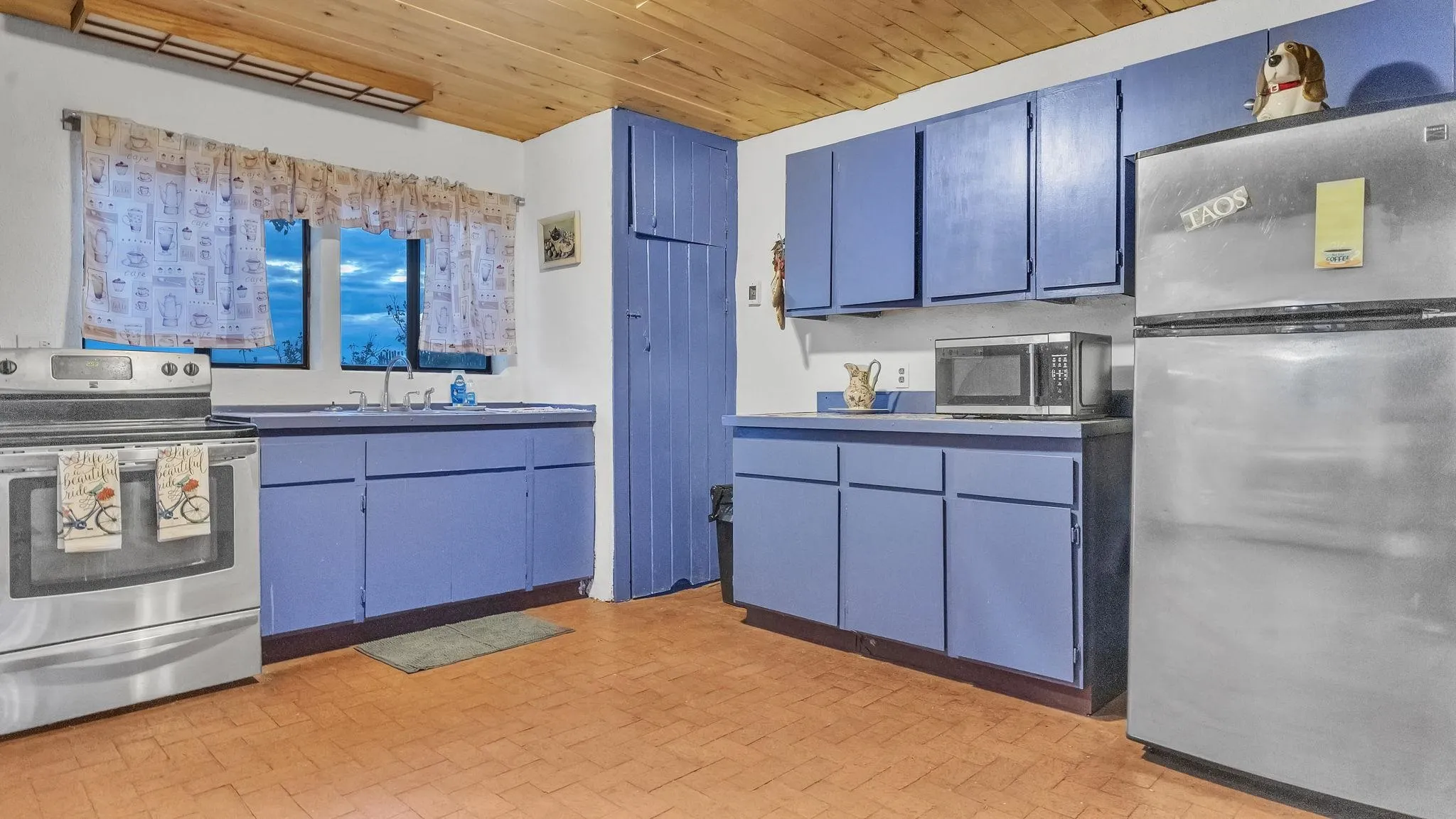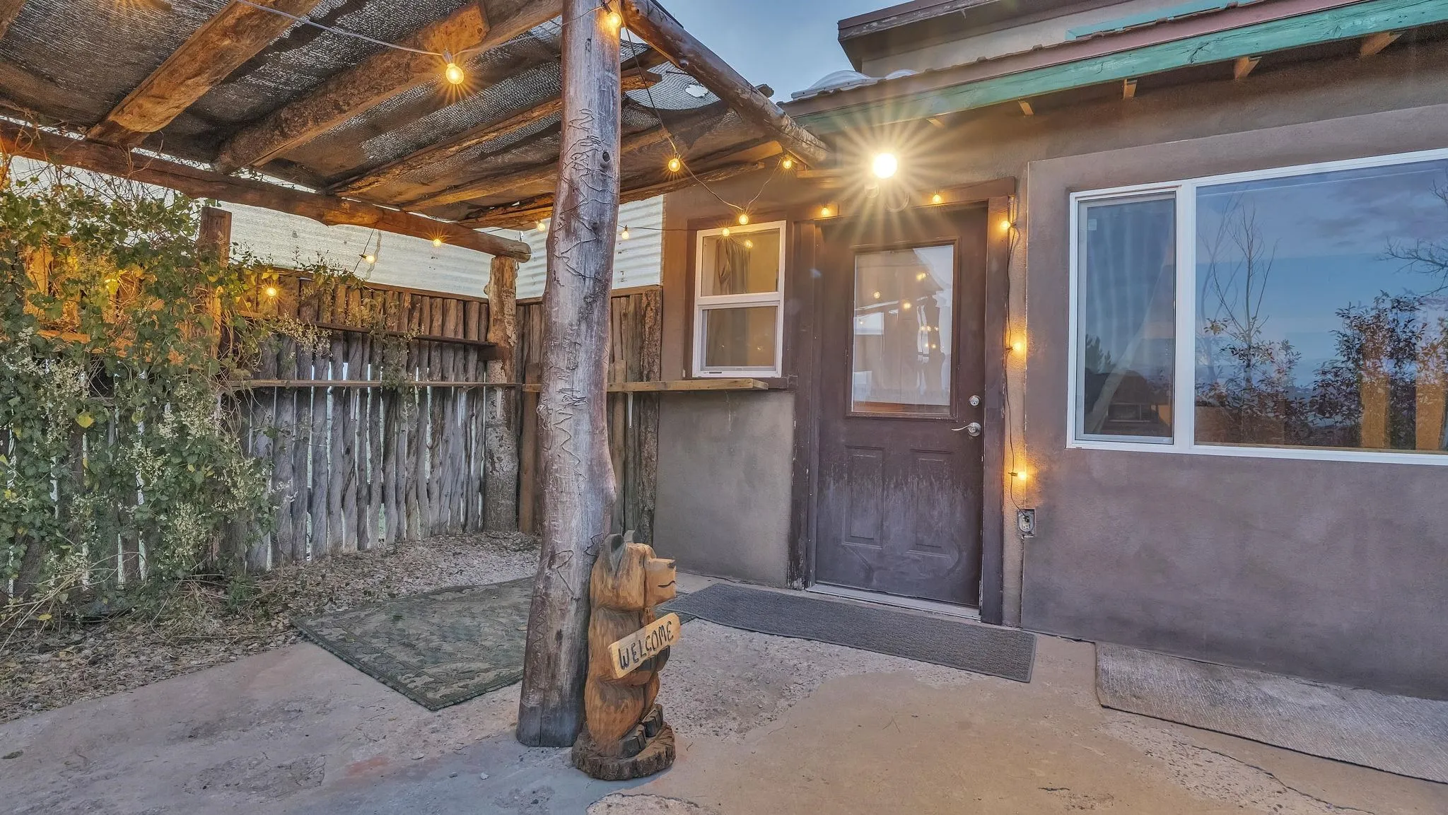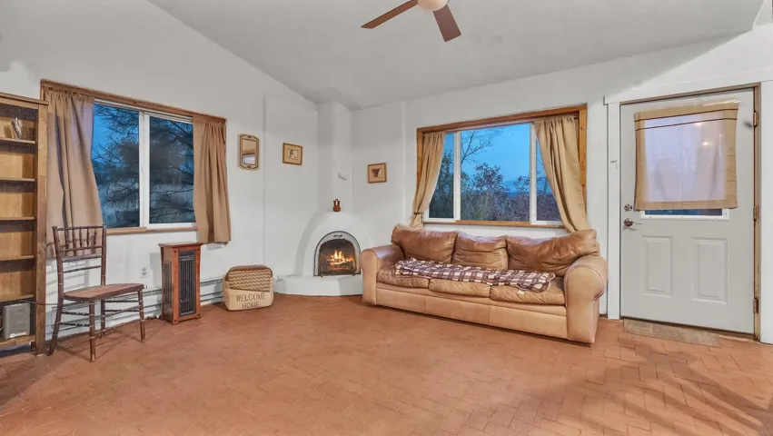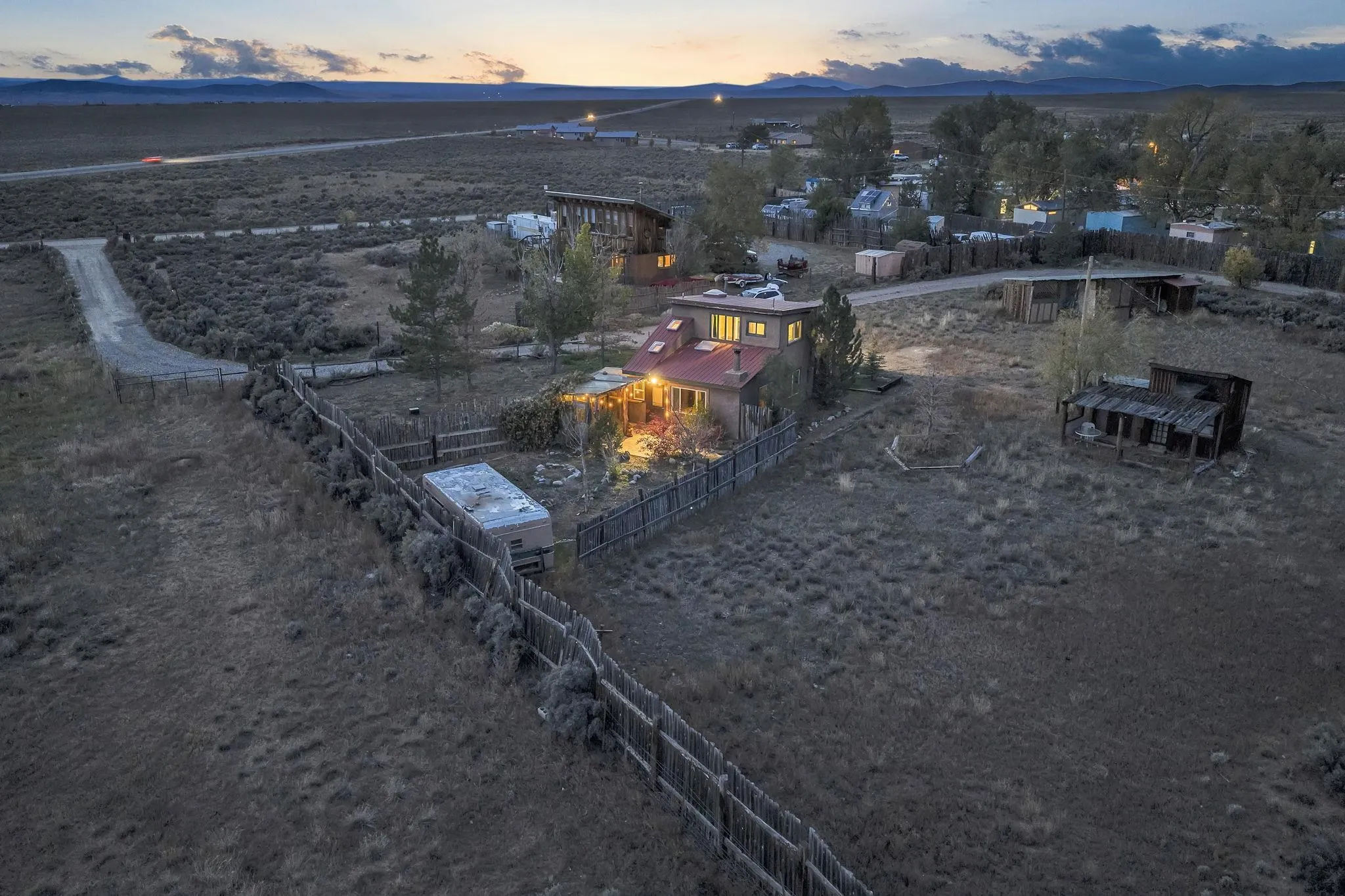 The Taos Escape You’ve Been Searching For ~ In the Upper Colonias neighborhood conveniently located near Highway 522, you will find this perfect little home situated on three-quarter acres of land with stellar mountain views. The residence capitalizes on panoramic southern exposure which helps to keep the home nice and warm naturally. Inside, the fluid, open-plan is enriched by a traditional kiva fireplace, a reclaimed Spanish-era timber beam, with classic brick floors. The upper level contains a private sanctuary, complete with slate flooring and magnified mountain views. The exterior features a small portal with bistro lighting beside the garden and a secure, fenced perimeter for pets. The grounds are surrounded by trees, punctuated by towering ponderosa pines and aspen. A detached, two-story annex (currently an artist’s refuge) offers additional potential, and can possibly be converted to an equine enclosure, offering forty linear feet of secure storage. Here, you will be few minutes from the Taos Ski Valley, the Town of Taos, John Dunn Bridge at the Rio Grande, and many more desirable locations for outdoor exploring. this property presents a rare investment opportunity or a deeply personalized homestead, come see for yourself!