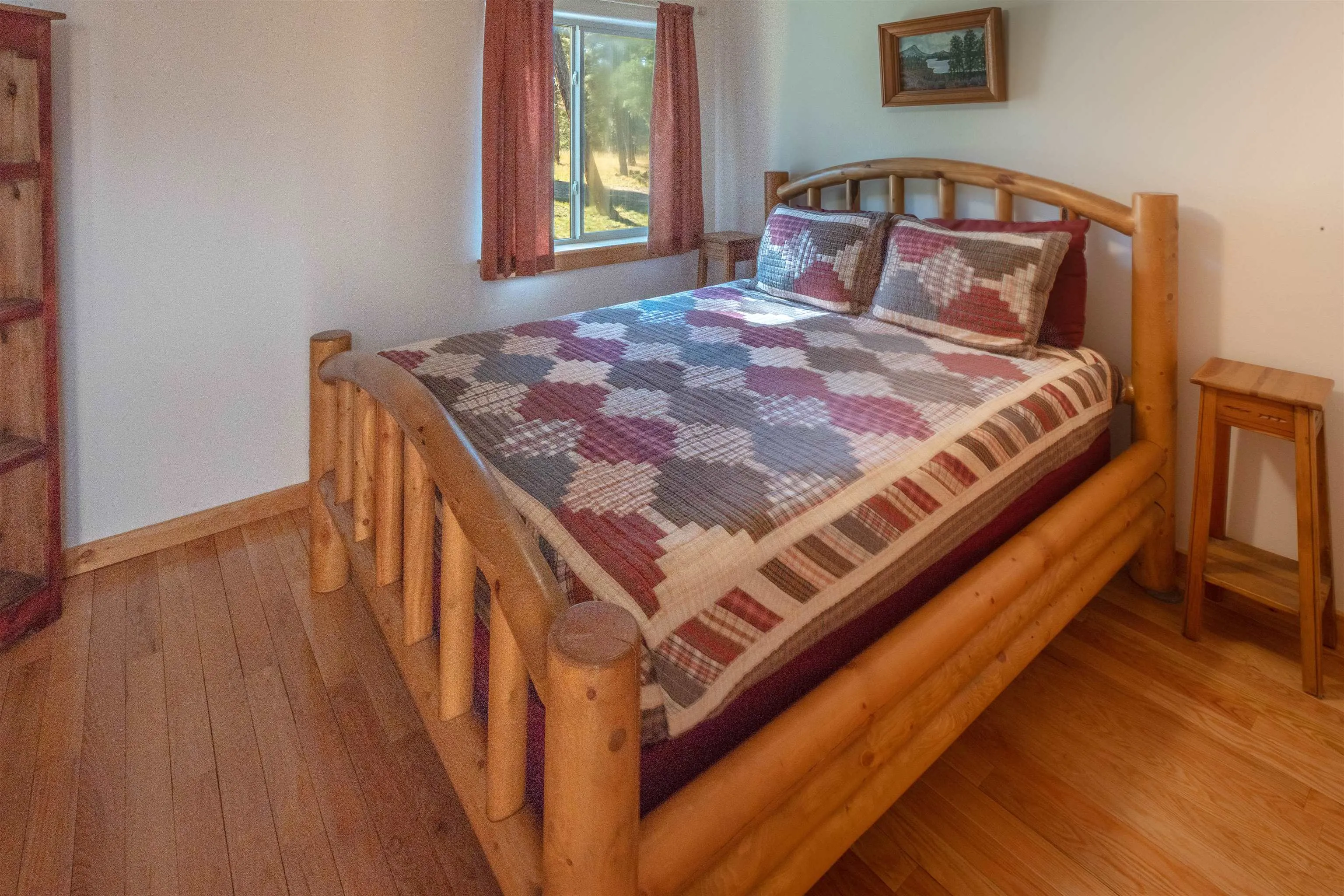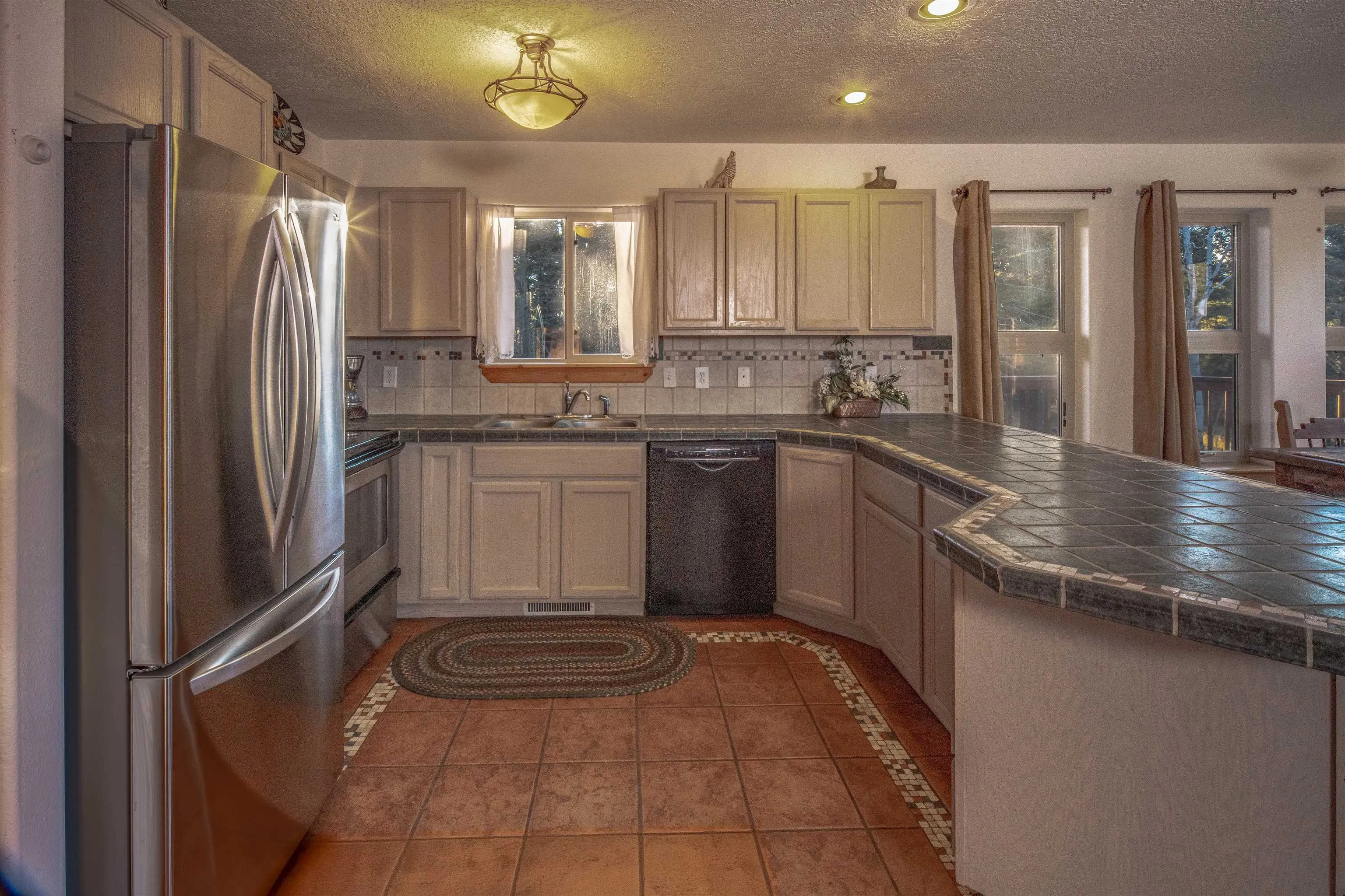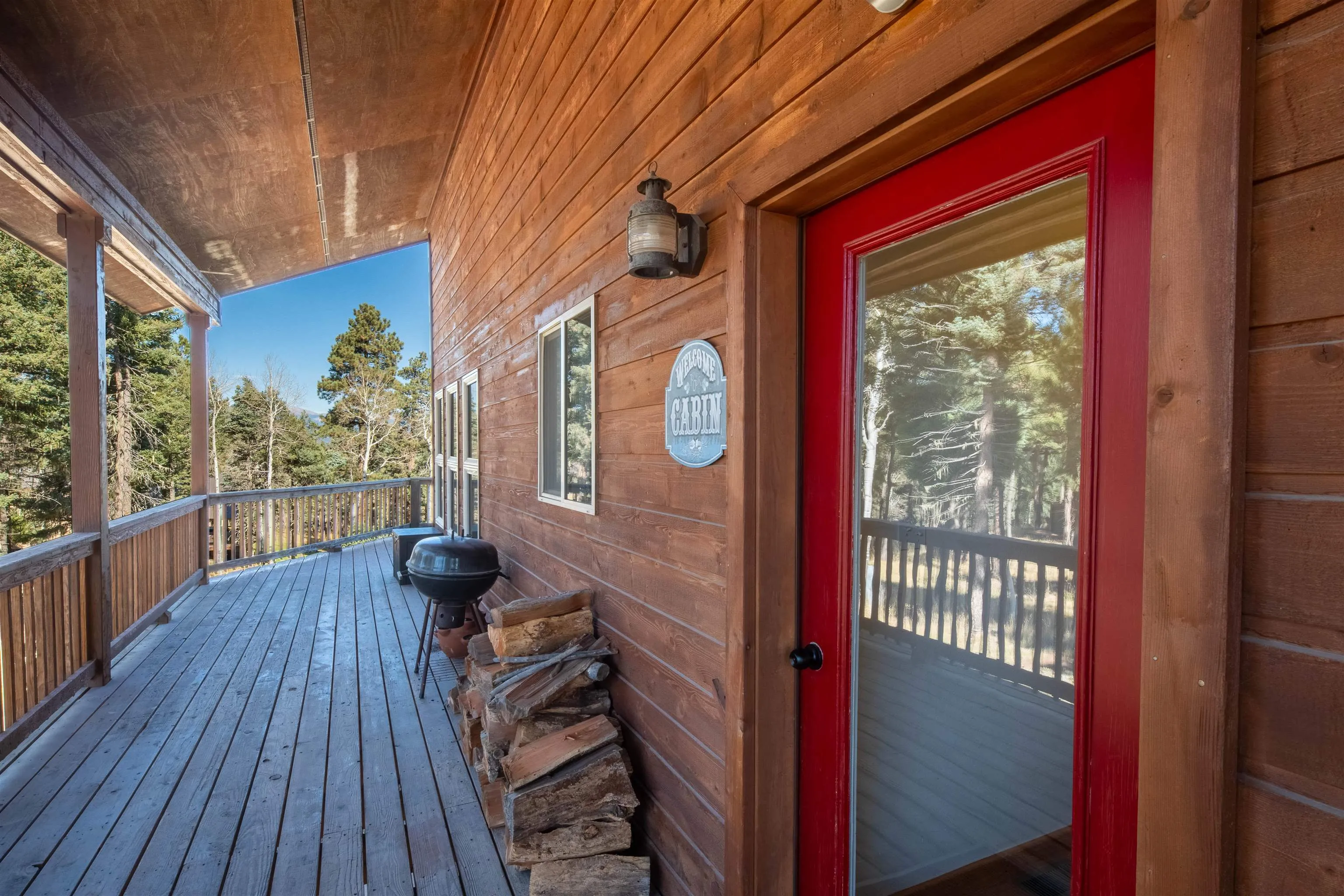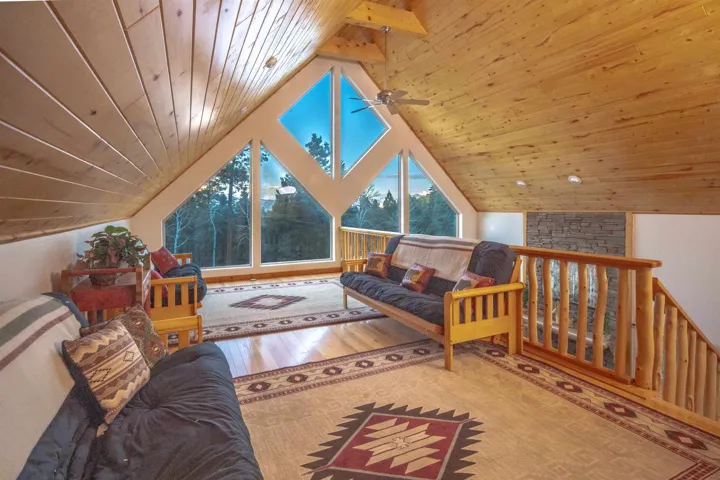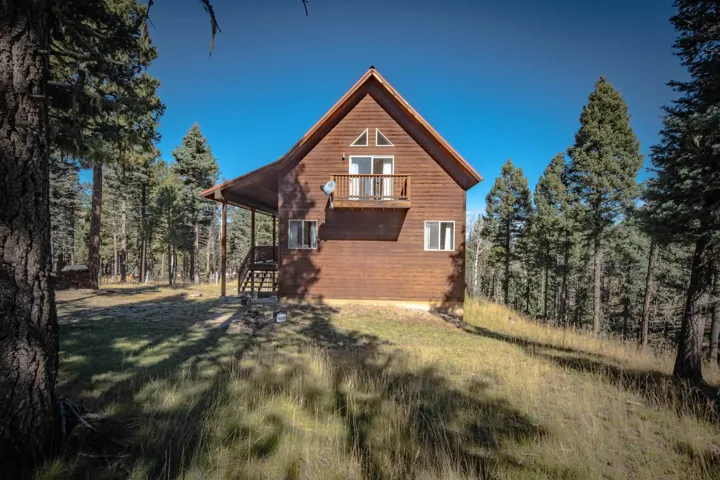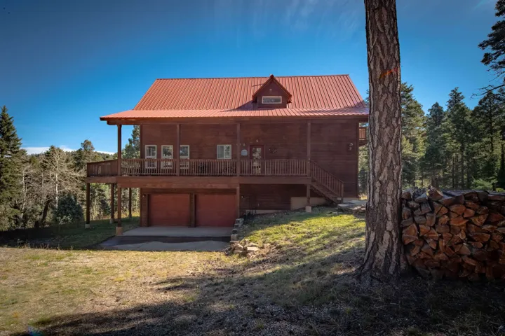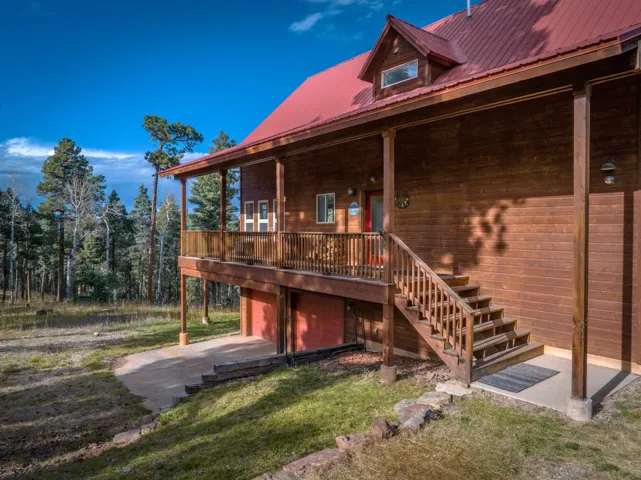 Discover this custom-built rustic retreat – a 4 bedroom, 3 bathroom chalet with Wheeler Peak views and exceptional attention to detail. With over 2,400 sq ft of living space, this home includes a fully equipped 500 sq ft studio apartment with private garage entry, offering the perfect guest quarters, owner’s suite, or rental opportunity. Step inside to soaring ceilings anchored by a dramatic BIS Ultima wood-burning fireplace, framed floor-to-ceiling Harristone stone wall. The oversized loft spans more than 400 sq ft and overlooks the living room and extends to a wall of windows, filling the home with light and mountain views. Solid oak hardwood floors, warm-toned tile with tumbled stone accents, and solid wood Southwestern-style doors bring rich texture and warmth throughout. Thoughtful upgrades include soundproof insulation in all interior walls and ceilings, energy-efficient design, and a cast-iron tub with colorful Mexican porcelain sink in the primary suite. Outdoor living is just as impressive with an expanded wrap-around deck (12’ wide instead of standard 8’) and a private balcony off the primary bedroom, perfect for taking in sunsets or watching elk and deer wander across the open space bordering two sides of the property. The circle driveway makes access easy year-round and provides extra parking. Additional highlights include a finished garage with electrical in place for future expansion, furniture with distinctive Southwest character, and the peace of knowing no additional neighbors will be building next door. A private, yet accessible location, abundant natural beauty, and thoughtful custom features make this home truly move-in ready and a standout value in Angel Fire. This is a short walk to Monte Verde Lake. Seller is offering $5,000 credit at closing for deck staining.