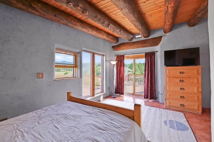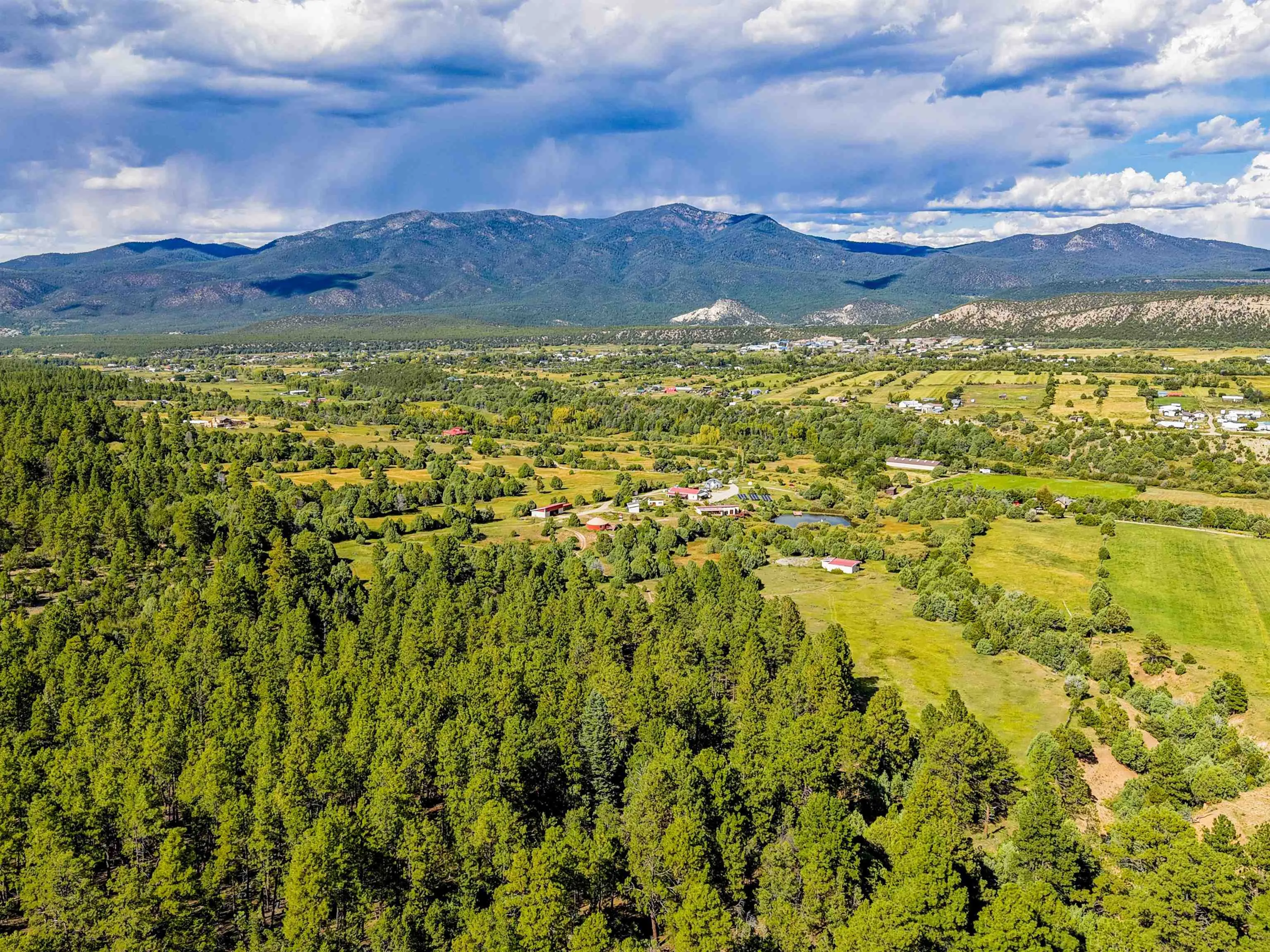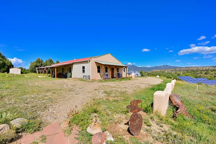 A truly rare 34-acre mountain retreat awaits, nestled in the Sangre de Cristo Mountains with stunning views of Jicarita Peak and Truchas Peaks. This exceptional, self-sufficient, and sustainably developed property is perfect for a small family business, equestrian estate, or serene retreat center. The total living space of 4,100 sq ft includes a charming 1,600 sq ft earth-bermed 2-bedroom home featuring custom stone floors, vigas, radiant in-floor heat in the kitchen and master suite, and an updated kitchen with a Wolf Stove and granite countertops. The home is designed for energy efficiency, maximizing solar gain, and has a wrap-around deck with captivating pond and mountain views. The property also boasts a 2,225 sq ft office/mixed-use building (zoned for cottage industry, previously a successful institute), a 275 sq ft studio/guest house with a half-bath, and a 30’ insulated yurt with off-grid solar, ideal for meditation or a classroom—offering immense flexibility and separate spaces for living, working, and gathering. Outside, find unparalleled amenities dedicated to Earth Stewardship and conservation: • 10 irrigated acres with water rights for farming or grazing. • Rustic 3-stall horse barn and tack room, horse fencing throughout property. • 33’ geodesic Growing Dome for year-round production. • A comprehensive water catchment system utilizing heavy-duty roof guttering on all buildings and multiple cisterns. • A quarter-acre pond with a Trex deck, fed by wetlands and springs, and aerated by a windmill. • A vast network of maintained trails on forested acres (thinned and managed), offering direct access to the Carson National Forest. Additional features include an owned grid-tied solar array, a root cellar, a 40’ cargo container, and extensive landscaping with drip irrigation. This property is a rare gem, beautifully developed, and ready for its next steward.