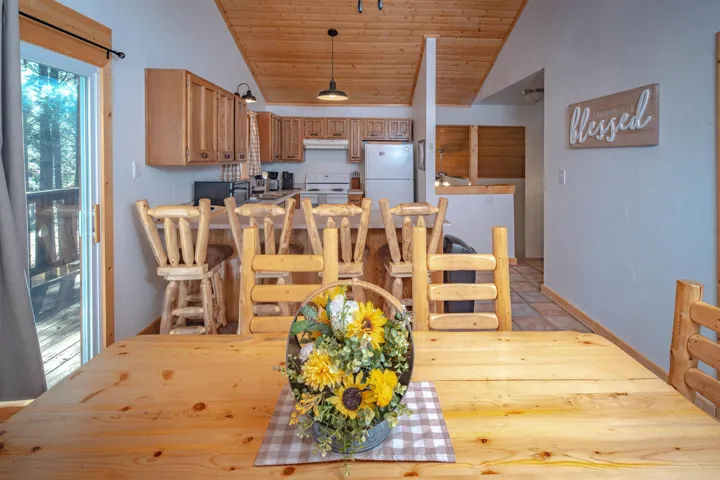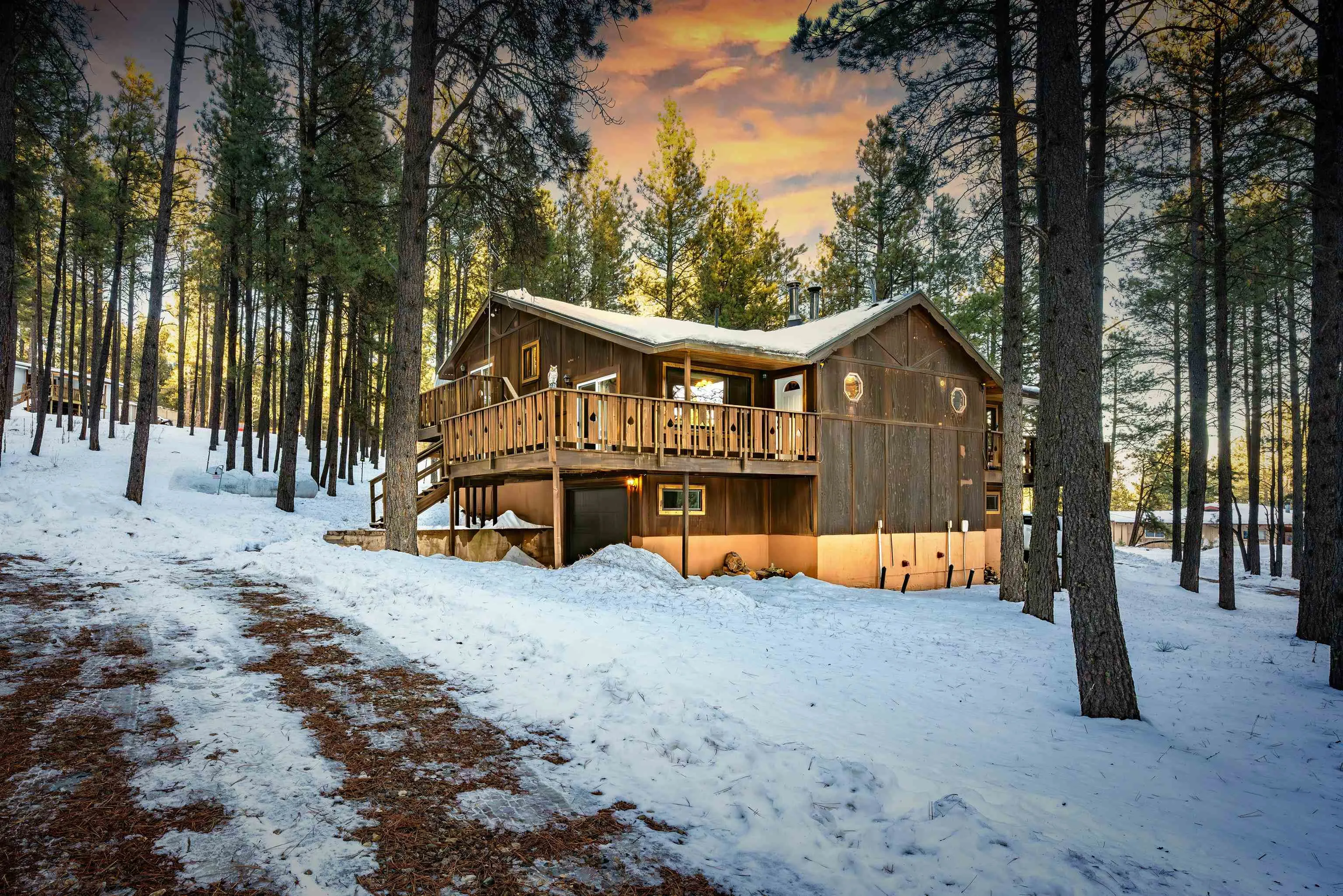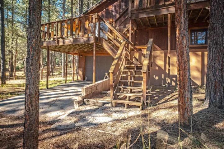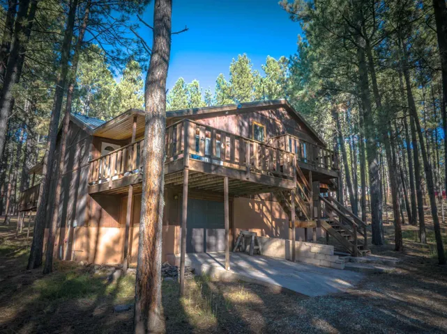 Looking for a mountain home that pays for itself? This well-kept duplex is already income-producing, with a month-to-month tenant on one side bringing in $2,000 a month! With an assumable VA loan at a 2.25% interest rate and seller financing as an option, this property makes for a great investment or mountain getaway that helps cover the bills. Together, the two mirrored units offer 2,930 sq ft of living space on a 1-acre wooded lot, just 10 minutes from Angel Fire Resort. Each side includes 3 bedrooms and 2 baths in a smart split-level layout that gives everyone a little privacy. The main entrance opens to a covered porch with tongue-and-groove ceilings and a welcoming foyer—perfect for kicking off your ski boots after a day on the slopes. The living room centers around a big wood-burning stove that keeps the whole place cozy on snowy days. Downstairs, you’ll find two bedrooms, a full bath, and garage access; upstairs you’ve got the kitchen and primary bedroom. Every level has its own propane wall heater for extra comfort. Recent updates include brand-new windows throughout and tongue-and-groove accents that give the home its warm mountain feel. Each unit has separate utility meters, so it’s easy to manage whether you live in one side or rent them both out. Outside the resort boundary—no membership fees here—saving you thousands every year. Fully furnished and turnkey, this quiet duplex is surrounded by tall pines and designed from the start to be both comfortable and income-generating.