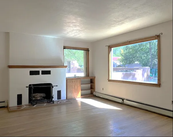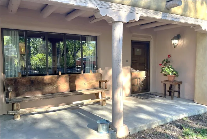 This traditional Taos property sits on two lots in the historic Lund subdivision of downtown Taos. The main house, in Pueblo/Southwestern style, has 3 bedrooms and two bathrooms, while the charming casita has one bedroom, one bath. Built in 1951, the 1,392 sq.ft. main house has a fireplace, galley kitchen, and separate laundry room. House has hot water baseboard heating with an additional wall heater in the livingroom. The generous front and back yards provide ample space for gardening and entertaining. The main house also has two attached carports. Original pecan wood paneling and built-ins throughout. Property features preserved authentic, retro design elements that are hard to find today. Update or restore this original and unique architectural home in the historic Taos district. The one-bedroom, 762 sqft casita was built in 1987 and has new Sierra Vista windows and metal roof, with wall heaters in the bedroom and living area. The casita has a large, private yard with several patios. Walk to everything in downtown Taos, including the historic Taos Plaza, the Taos Inn, the Harwood Museum, restaurants and shops. Fast, fiber-optic internet available in both houses.