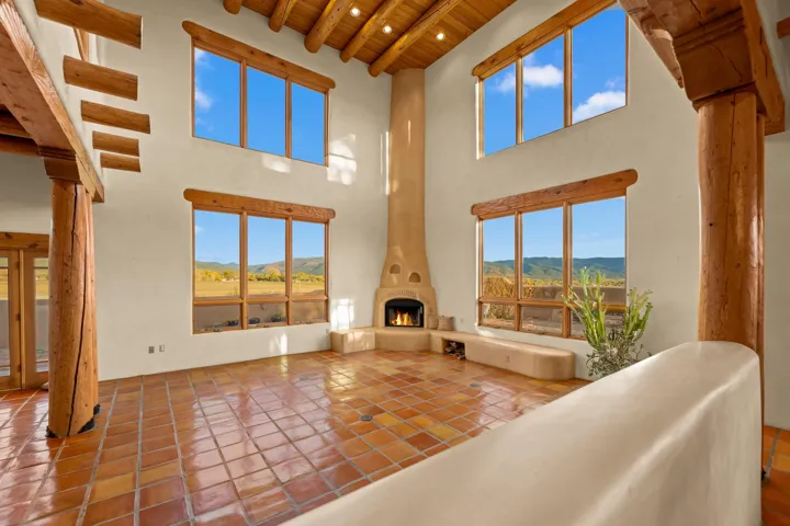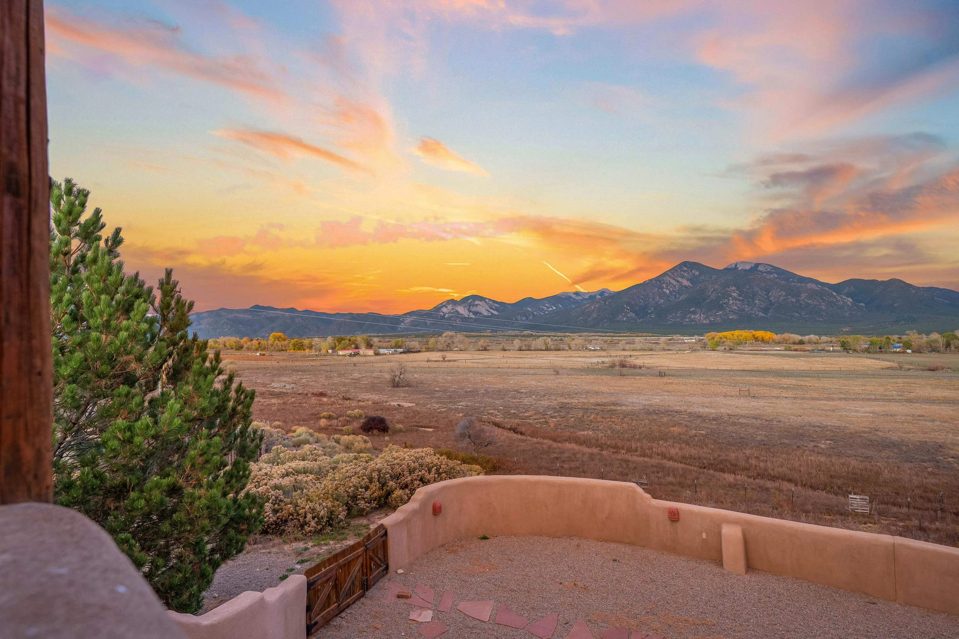 A timeless New Mexico hacienda, this home blends exceptional craftsmanship with vast mountain views and refined living. At its heart lies an inviting entry courtyard with a Spanish fountain, perennial gardens, a custom pizza oven, and an outdoor dining space—perfect for gatherings under the stars. Designed for both entertaining and everyday comfort, the home’s luxuriously sized living areas flow effortlessly outdoors, framing sweeping views of the Sangre de Cristo Mountains. Inside, custom tilework accents the kitchen, stairway, arched doorways, and bathrooms, bringing warmth and authenticity to every space. The kitchen serves as a natural gathering place, opening gracefully into grand living and dining areas that invite connection and easy conversation. Each of the four bedrooms enjoys its own outdoor access, blending indoor comfort with the surrounding landscape. The generously sized primary suite is filled with natural light and offers a serene retreat with a spa-like bath. Outside, an adobe-walled backyard with a soothing water feature provides the perfect setting for quiet mornings or evenings beneath the wide Taos sky. A heated outdoor studio offers a versatile space ready to be customized for art, hobbies, or fitness. In addition to the four-car garage, there is an oversized attached garage with 220V service and an air compressor—ideal for a craftsman or hobbyist. A peaceful sanctuary just minutes from town, this home captures the beauty, warmth, and timeless spirit of Taos.
