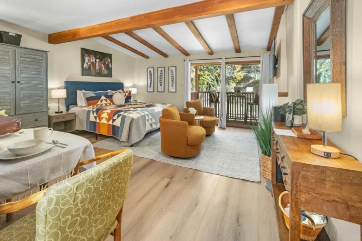Introducing a distinctive condominium opportunity at Powderhorn Condominiums, situated in the heart of Taos Ski Valley. This inviting studio provides an ideal four-season retreat, conveniently located within walking distance of the lifts, base area, restaurants, and shops. Guests can conveniently park their vehicles and access all amenities on foot. This fully furnished and meticulously designed studio offers everything necessary for relaxation, culinary endeavors, and unwinding after a day of skiing or hiking. It features a cozy electric fireplace, ideal for sharing stories, and a complete bathroom equipped with a tub for soothing sore muscles. This condo is turnkey and ready for the season, boasting fresh paint, laminate flooring, a recently installed king-sized bed, an oversized armoire, plush chairs, and a cafe table on the private balcony. Home Owner’s Association fees include virtually all services and expenses: trash collection, grounds and building maintenance, electric, natural gas, water, sewer, Dish Network satellite TV, high -speed fiber Wifi, building insurance, and snow removal. Additional amenities include a private deck for enjoying morning coffee or après-ski beverages and access to a spacious lobby area. The unit also includes a private owner’s locker, providing convenient storage for ski and equipment. A VIP parking area is provided for your convenience after unloading luggage and is within walking distance.