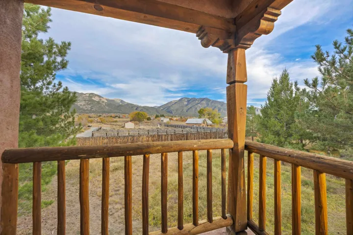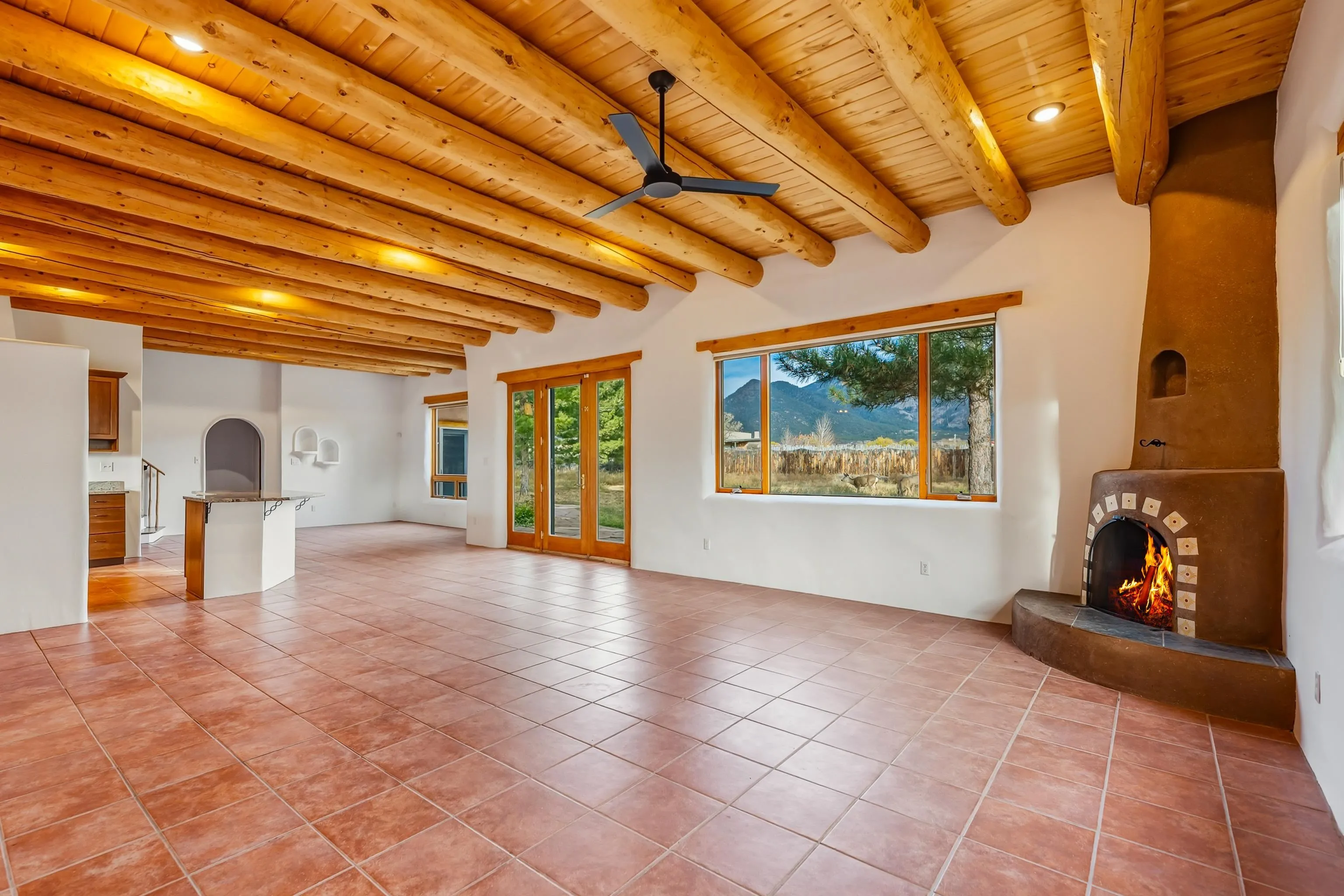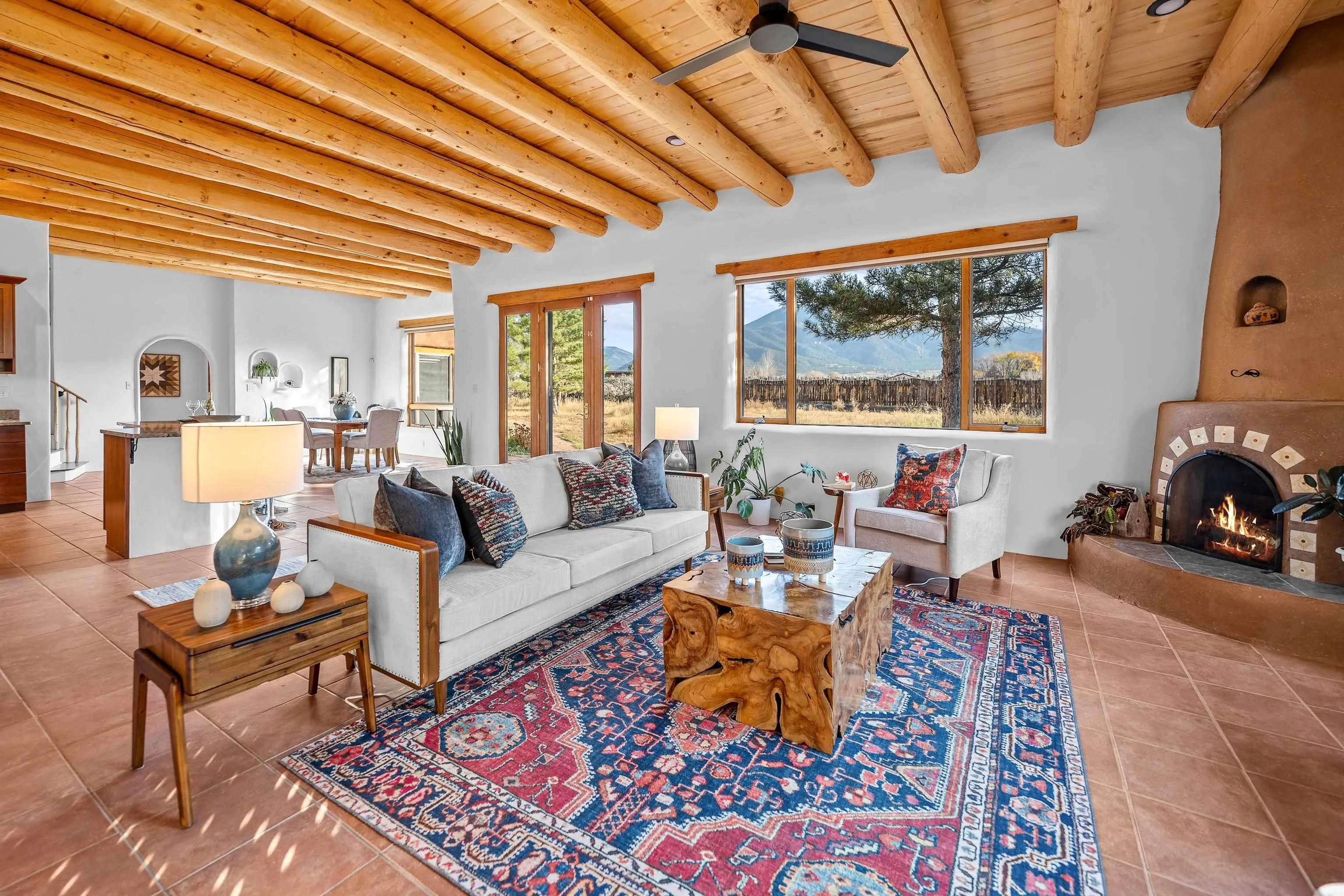 Nestled between Taos Mountain and the sweeping mesa, this inviting adobe-style home blends classic Northern New Mexico craftsmanship with modern comfort. Viga beam ceilings, Saltillo tile floors, and plaster walls create a warm, grounded atmosphere throughout the light-filled interior. The open-concept living area features a southwestern-style fireplace and picture windows that frame stunning mountain views, while the adjoining kitchen offers granite countertops, stainless steel appliances, and generous workspace for everyday living or entertaining. Two spacious bedroom suites—one upstairs, one down—provide privacy and flexibility for guests, remote work, or multi-generational living. The third bedroom and full bath complete the thoughtful layout. Step out to the covered patio or upper deck to watch the sunrise over Taos Mountain and set across the high desert sky. The fenced acre includes mature trees, open space for gardens or pets, and the security of a private well and acequia water rights. Located just a mile from Arroyo Seco’s cafés and market, and fifteen minutes from Taos Ski Valley or the Taos Plaza, this property offers both serenity and convenience—an authentic Northern New Mexico retreat built to stand the test of time.