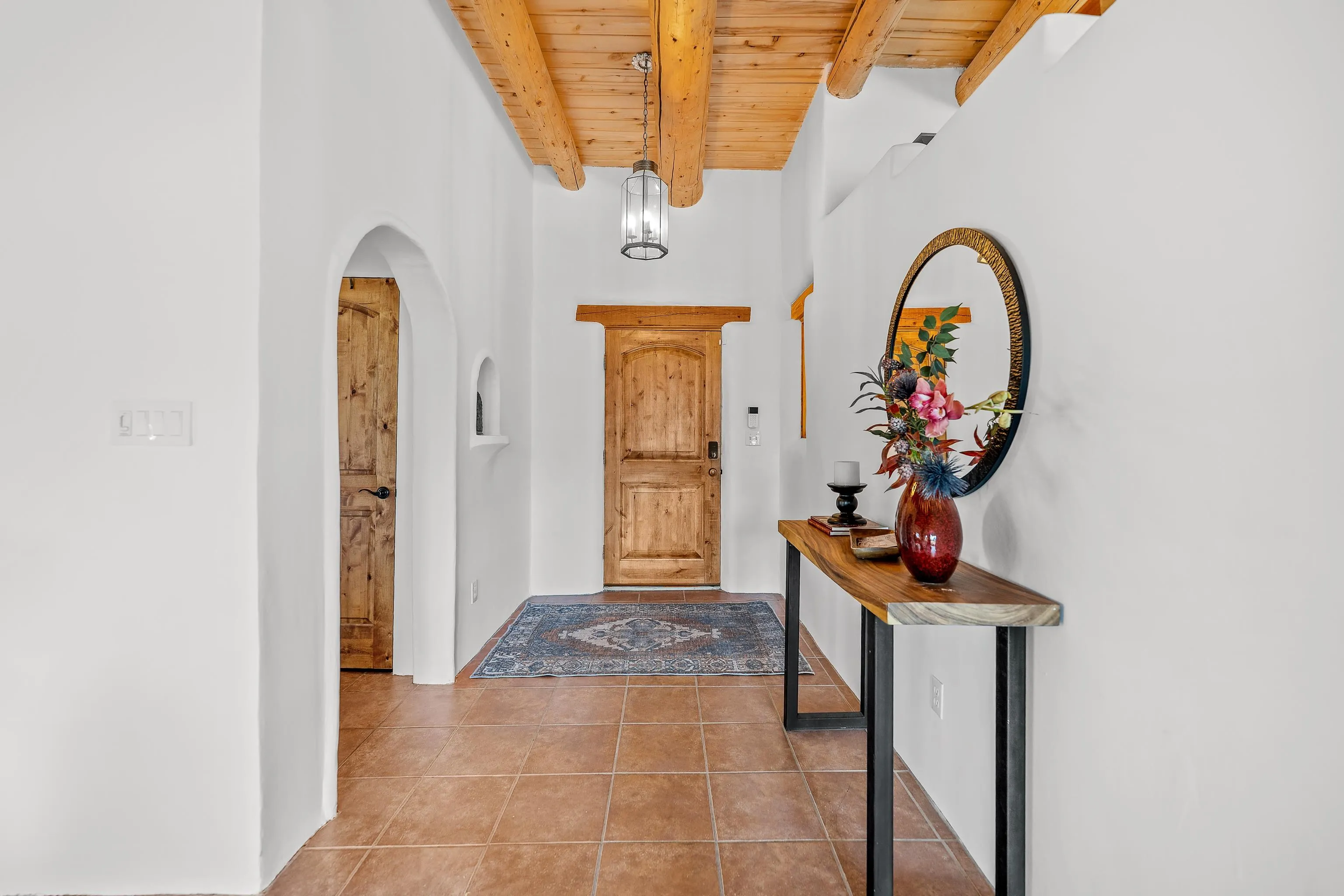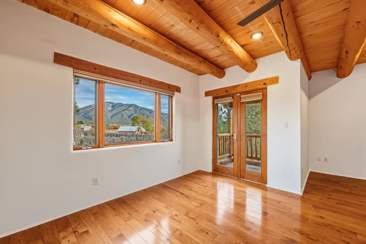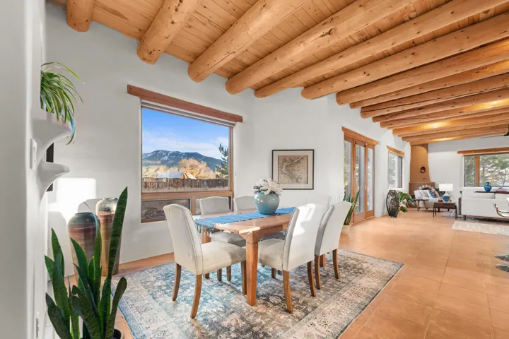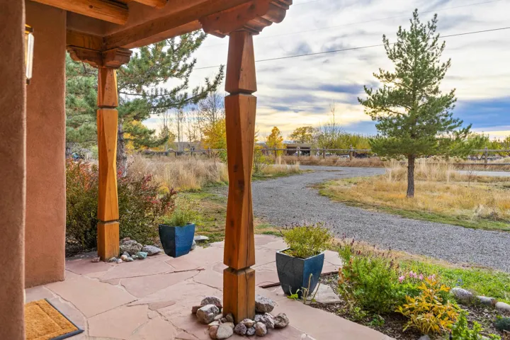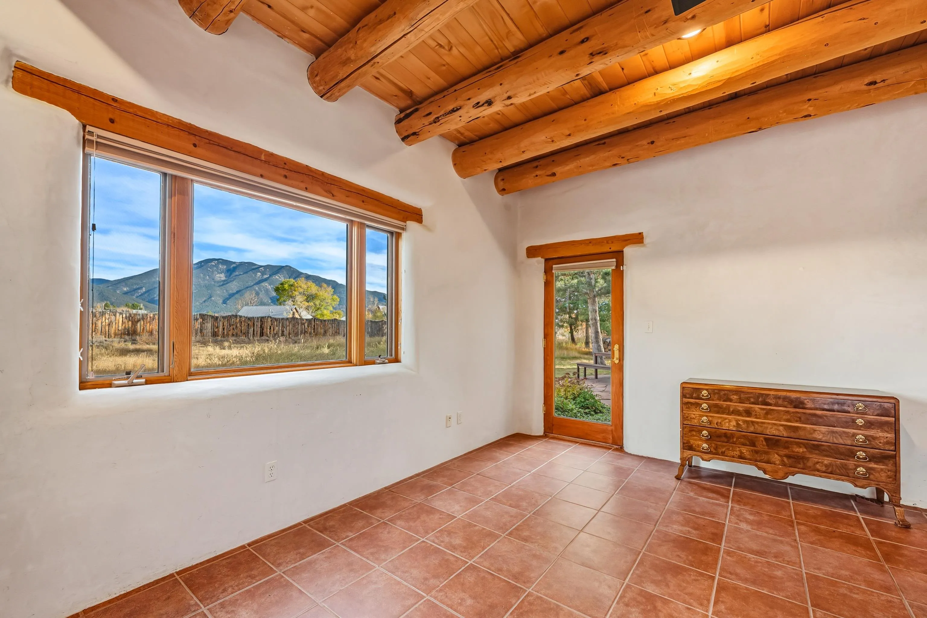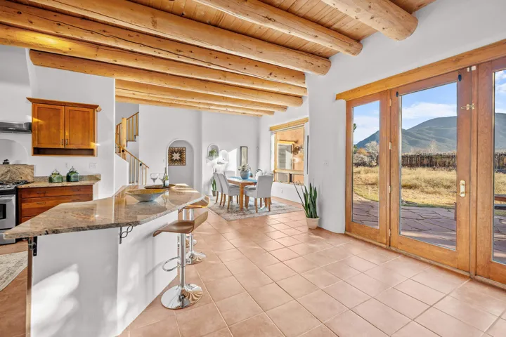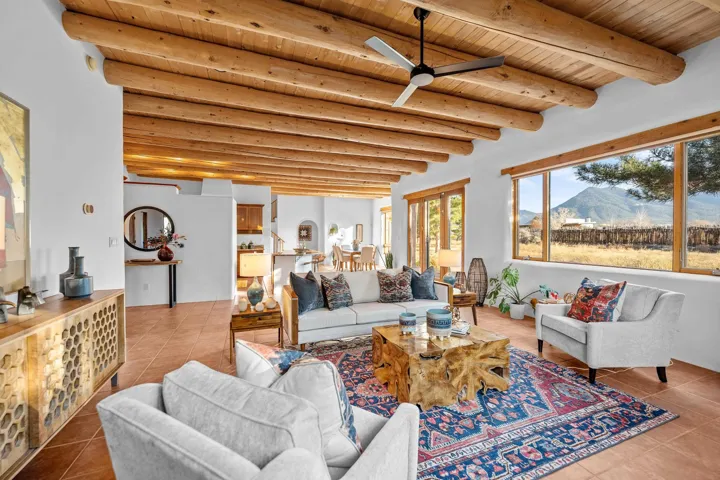 Nestled between Taos Mountain and the sweeping mesa, this inviting adobe-style home blends classic Northern New Mexico craftsmanship with modern comfort. Viga beam ceilings, Saltillo tile floors, and plaster walls create a warm, grounded atmosphere throughout the light-filled interior. The open-concept living area features a southwestern-style fireplace and picture windows that frame stunning mountain views, while the adjoining kitchen offers granite countertops, stainless steel appliances, and generous workspace for everyday living or entertaining. Two spacious bedroom suites—one upstairs, one down—provide privacy and flexibility for guests, remote work, or multi-generational living. The third bedroom and full bath complete the thoughtful layout. Step out to the covered patio or upper deck to watch the sunrise over Taos Mountain and set across the high desert sky. The fenced acre includes mature trees, open space for gardens or pets, and the security of a private well and acequia water rights. Located just a mile from Arroyo Seco’s cafés and market, and fifteen minutes from Taos Ski Valley or the Taos Plaza, this property offers both serenity and convenience—an authentic Northern New Mexico retreat built to stand the test of time.