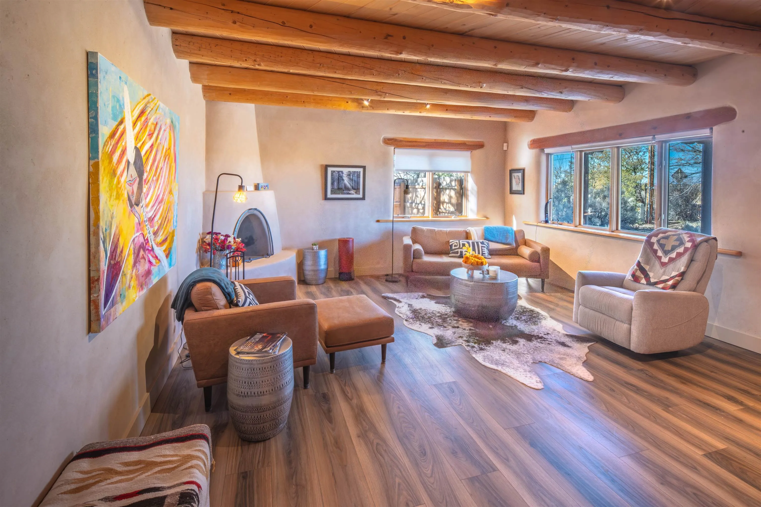 In-Town Living with Views, Privacy, and Southwestern Charm- this property is a cannot-miss kind of oppurtunity! Located in the heart of Taos yet tucked within the quiet feel of a small private community, Pond Village Subdivision offers the best of both worlds. This established neighborhood, within easy walking distance to the historic Taos Plaza, includes a blend of existing homes and newly developed lots. This beautifully maintained 2-bedroom, 2-bath home fronts Valverde Street and overlooks open western lands — where daily sunsets paint the sky in dazzling color. The front portal is sure to be a favorite spot to enjoy both watching nature awaken with morning coffee as well as end your days watching nature’s artist paint the skies. Inside, the spacious living area centers around a traditional kiva fireplace, creating a warm and inviting gathering space. The open floor plan flows seamlessly into a well-appointed kitchen featuring abundant counter space, generous cabinetry, and a welcoming layout ideal for entertaining. Two comfortable bedrooms and two bathrooms feature thoughtful Southwestern details throughout — from the soft plaster walls and exposed vigas to radiant heated floors that add a touch of luxury. The second bedroom easily serves as a home office or guest space. Outdoors, a lovely, fenced yard to the east offers privacy, shade, and room for pets or relaxation under the charming pergola. An oversized storage room and separate laundry room adds extra practicality. As part of Pond Village, homeowners will also enjoy the rights and benefits of an established HOA. If you’ve been seeking the ease of in-town living with minimal maintenance, southwest character, and quick access to Taos’ renowned restaurants, galleries, schools, and shops — this is the perfect place to call home.