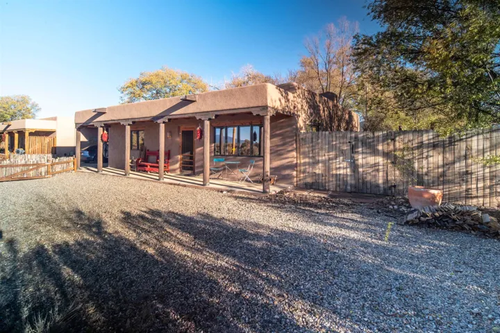 In-Town Living with Views, Privacy, and Timeless Southwestern Charm Opportunities like this don’t come along often. Nestled in the heart of Taos yet tucked within the quiet charm of a small private community, Pond Village Subdivision offers the perfect balance of convenience and tranquility. Located within easy walking distance of the historic Taos Plaza, this established neighborhood features a thoughtful mix of charming homes and newly developed homesites. This beautifully maintained 2-bedroom, 2-bath home fronts Valverde Street and enjoys sweeping views across open western lands—where breathtaking sunsets paint the evening sky in brilliant color. The inviting front portal is sure to become a favorite gathering spot, perfect for savoring morning coffee as the day begins or unwinding in the evening while nature puts on its nightly show. Inside, the spacious living area is anchored by a traditional kiva fireplace, creating a warm and welcoming space for relaxing or entertaining. The open floor plan flows effortlessly into the well-appointed kitchen, featuring generous counter space, ample cabinetry, and a layout designed for both everyday living and hosting friends and family. Two comfortable bedrooms and two bathrooms showcase thoughtful Southwestern details throughout—from soft plaster walls and exposed vigas to radiant heated floors that provide comfort and luxury year-round. The second bedroom offers flexibility as a guest room, home office, or creative retreat. Outdoors, the private fenced yard to the east provides shade and serenity, with a charming pergola offering the perfect place to relax, garden, or enjoy time with pets. An oversized storage room and separate laundry area add practicality and convenience. As part of the Pond Village community, homeowners benefit from the ease of an established HOA while enjoying a peaceful setting just moments from Taos’ renowned restaurants, galleries, schools, and shops. If you’ve been searching for the perfect blend of in-town convenience, Southwestern character, and low-maintenance living, this inviting Taos home is ready to welcome you.