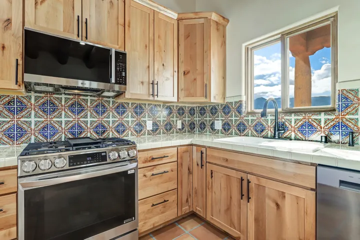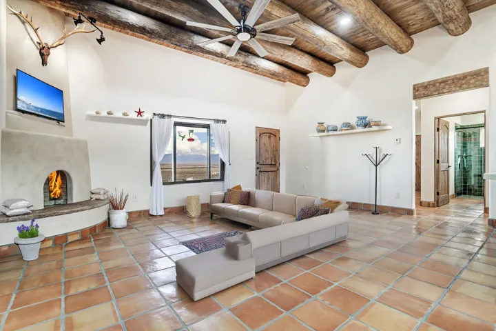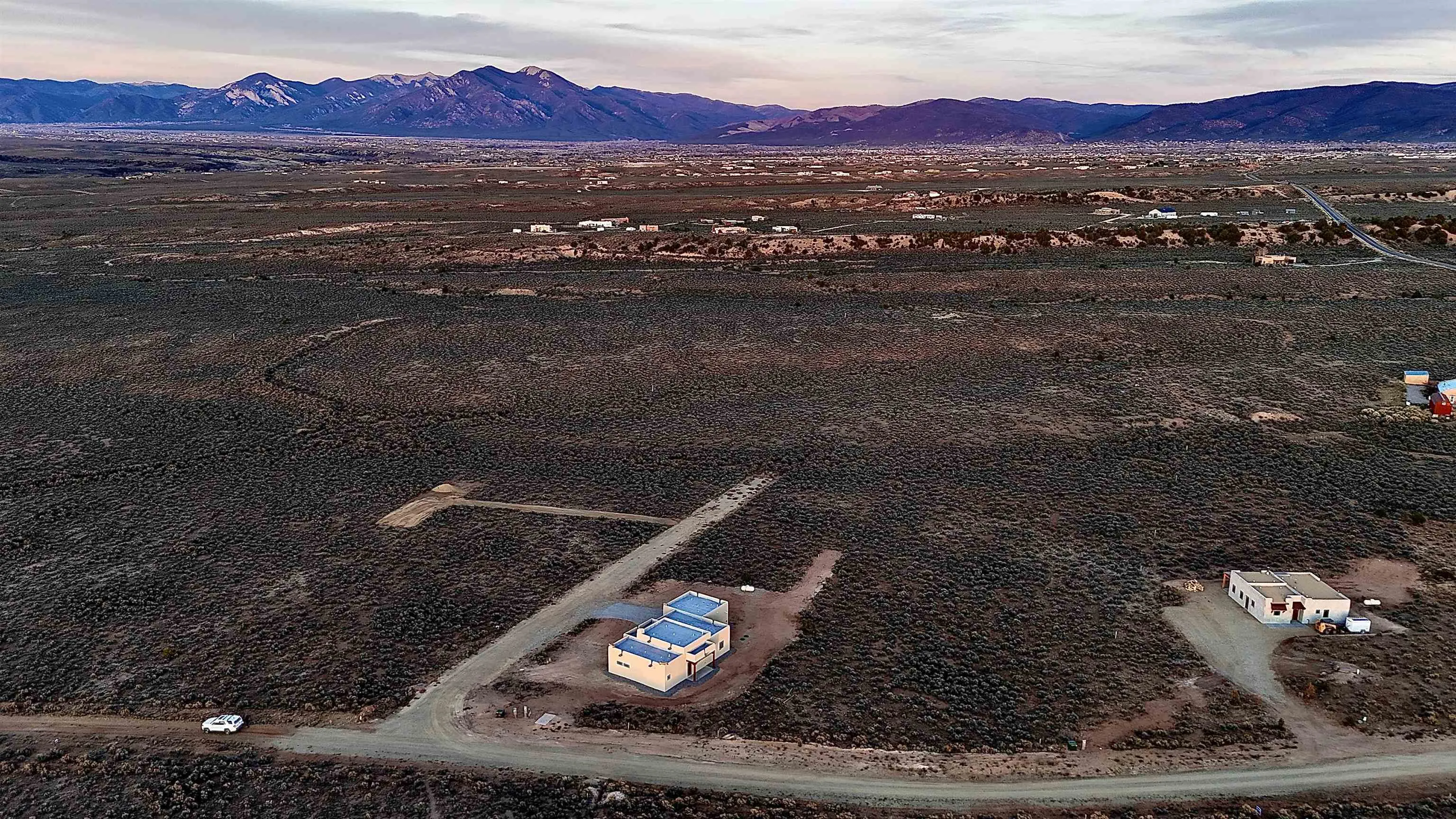 TEN NEW PINON TREES IN THE FRONT YARD! PRICE DROP: $715,000 OR BEST OFFER! POSSIBLE SELLER FINANCING!! Tranquil, peaceful, and absolutely stunning 2025 Southwest Pueblo-style home for sale near the hiking trails at the end of town! Superb quality with an extra 4” of concrete footings and extra rebar to ensure a solid foundation and structural integrity of the home. The home is 1,517 square feet of heated living space with an extra 500 square feet of heated space in the garage. Can easily be converted to a studio with another garage added. Utilities include: a shared well (5 homes), septic, electric, and propane. Radiant heat throughout the home for warm floors on a snowy day. A southwest fireplace in the living room for ambiance and roasting marshmallows on those cold, blizzardy nights! Vigas in the main living space to complement the high ceilings. Custom details throughout – gorgeous handmade Talavera tiles used for the backsplash in the kitchen and bathroom, and accents in the showers and sinks. Matching mirrors above each sink for a well thought-out design flow throughout the home. Light green tiled countertops in the kitchen to forest green tiles in the bathrooms. Custom shower glass doors in each shower with no step but a gentle slope accommodating little ones, pups, elders, or those who may be easily clumsy! Handmade Saltillo tiles throughout. A well-balanced color palette with neutrals to bright reds, yellows, orange, dark blues and an overall green tone that feels refreshing and warm. RV hook-ups behind the home, an electric car plug-in added in the garage. Photos capture the elegance, while the virtual tour captures artistic touch. 3D walkthrough and floor plan are added as a bonus to the listing for you to experience the home if you’re not able to see it right away. Last but not least, the expansive views in almost all directions will always remind you that the mountains are home! A simple yet heart-wrenching reminder of what makes Taos so special and why we all love it so much! *Four Pinon trees to be added to the property* See here for 3D rendering with virtual staging: https://tours.dragonfly360imaging.com/299473
