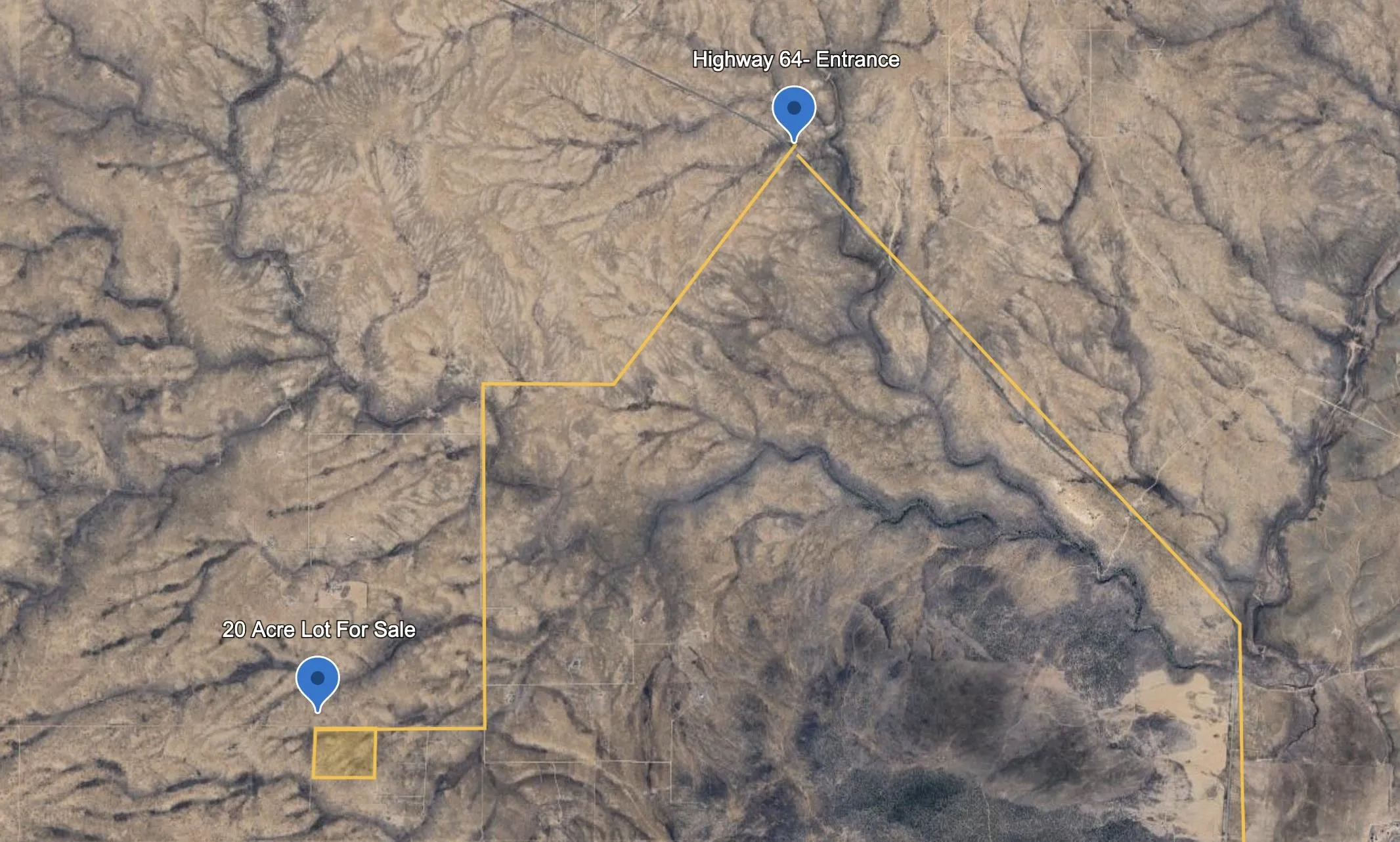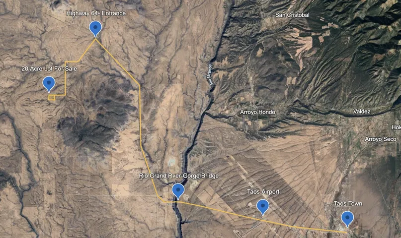 - Travel west on US 64 from the 522/150/64 intersection towards the Gorge Bridge/Tres Piedras. Approximately 16 miles from the turn, immediately beyond Mile Marker 234, turn Left onto Two Hawks Trail. Travel 3.3 Miles. Turn Right in Cielo Grande Rd. Continue .7 miles. Property on Left. Sign.