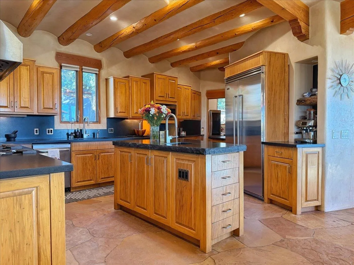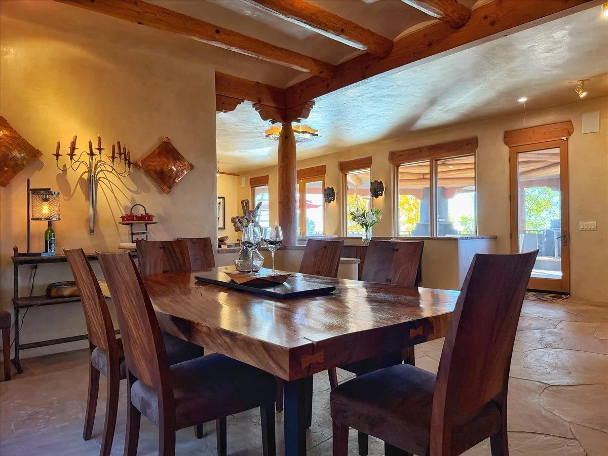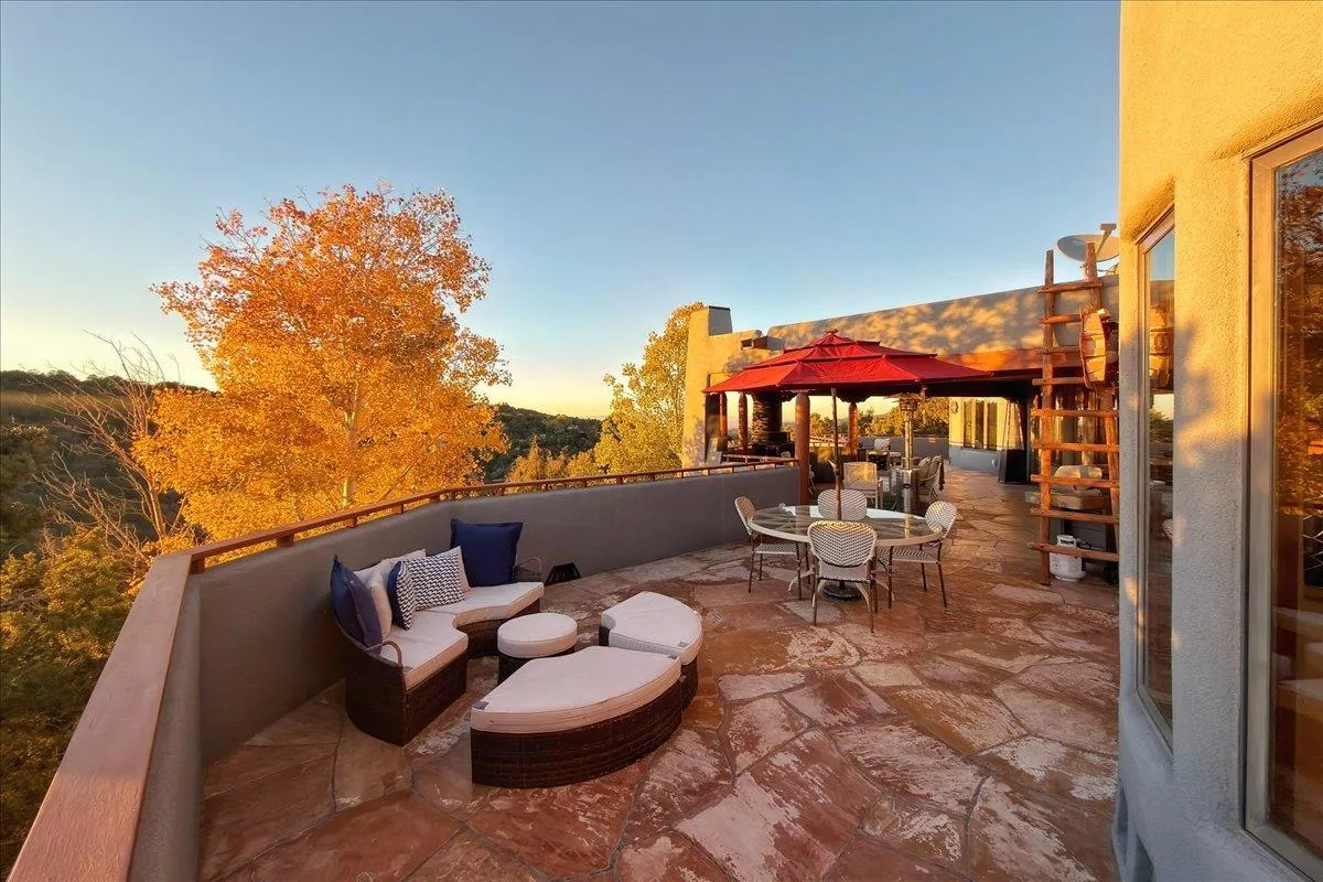 Whispering Hill—where nature’s quiet beauty keeps its own gentle secrets. Set within Hyde Park Estates, this architectural statement captures panoramic vistas that are rare even for Santa Fe—a dramatic sweep of horizon, sculpted mountains, and ever-changing light. Designed with a flexible five-bedroom layout, Whispering Hill offers versatility without sacrificing elegance. The main level functions as a complete living environment, ideal for those who prefer life without stairs. A tranquil primary suite, sophisticated gathering areas, and rare hardwood cabinetry set a tone of refined luxury from the moment you arrive. Throughout the residence, artisan ceilings-each one individually crafted-serve as sculptural centerpieces across both levels and extend to the outdoor entertaining terrace, where their artistry meets the surrounding landscape with extraordinary effect. The Whisper Media Lounge, anchored by a gigantic viewing screen, was envisioned for cinema, live sporting events, and immersive entertainment-an atmospheric space designed for true enjoyment. The lower level continues the architectural flow with a second primary suite and additional bedrooms, each offering direct outdoor access to terraces, pathways, and quiet corners of the landscape. Outdoor living expands with multiple areas to gather, including a radiant-heated portal, a garden pavilion, secluded seating spaces designed for unplugged relaxation, and a private hot tub positioned just outside one of the lower-level bedrooms-a serene vantage point for stargazing and quiet evenings. From the elevated main terrace, you can see 10,000 Waves, Santa Fe’s renowned Japanese-inspired spa nestled among the pines. Across the grounds, irrigated landscaping enhances the natural contours of the site, ensuring year-round beauty, color, and ease of care. Climate comfort is thoughtfully supported by eight strategically placed mini-splits for individualized heating and cooling, working in tandem with the primary systems to ensure four-season comfort at altitude. A pre-listing home inspection has already been completed, offering added transparency and confidence for prospective buyers. Minutes from the Santa Fe Plaza, Whispering Hill is an exceptional choice for those seeking either a full-time luxury residence or an elevated secondary retreat. With premium upgrades far too numerous to list, rare materials, master craftsmanship, and one of Santa Fe’s most compelling vantage points, Whispering Hill stands as a true Santa Fe masterpiece-a seamless fusion of design, nature, and elevated mountain living.