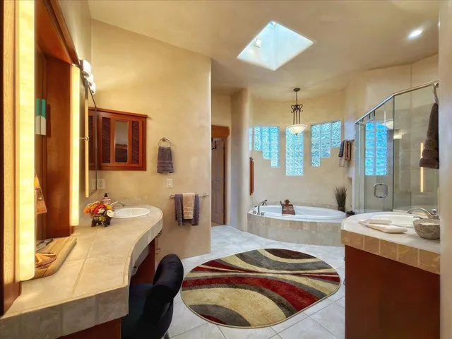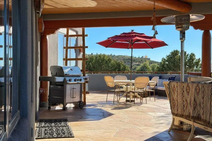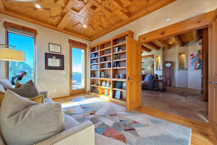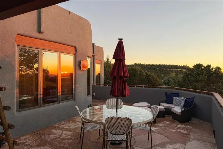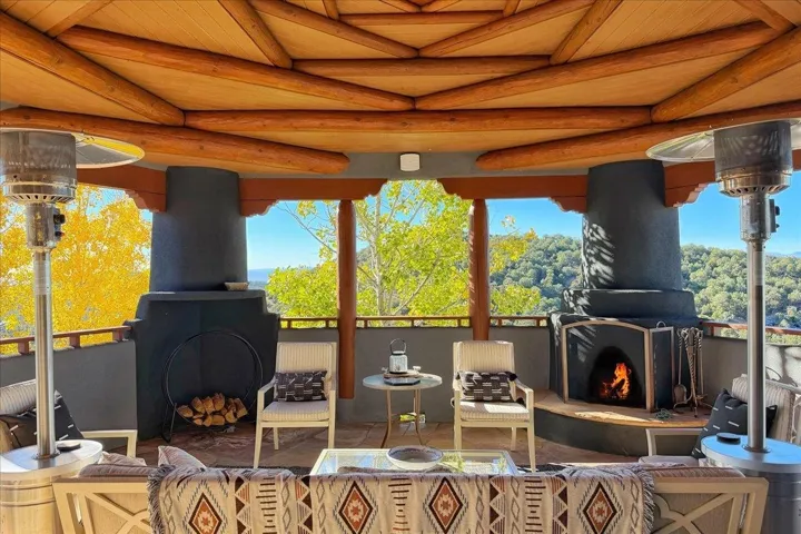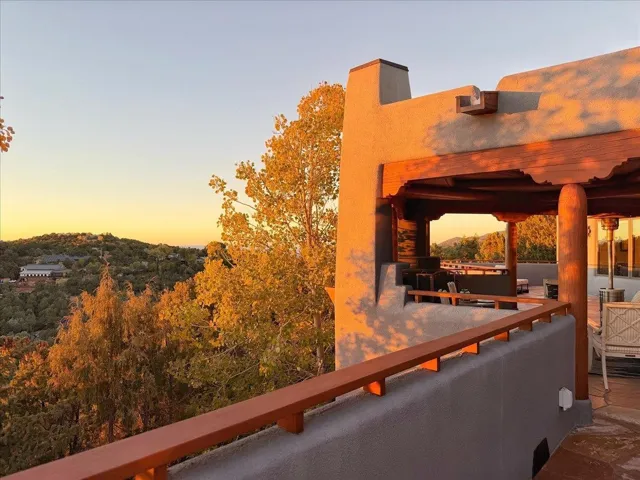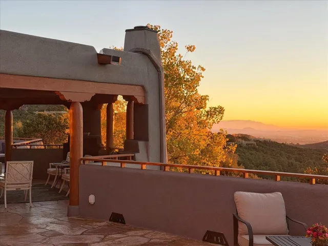 Whispering Hill—where nature’s quiet beauty keeps its own gentle secrets. Set within Hyde Park Estates, this architectural statement captures panoramic vistas that are rare even for Santa Fe—a dramatic sweep of horizon, sculpted mountains, and ever-changing light. Designed with a flexible five-bedroom layout, Whispering Hill offers versatility without sacrificing elegance. The main level functions as a complete living environment, ideal for those who prefer life without stairs. A tranquil primary suite, sophisticated gathering areas, and rare hardwood cabinetry set a tone of refined luxury from the moment you arrive. Throughout the residence, artisan ceilings-each one individually crafted-serve as sculptural centerpieces across both levels and extend to the outdoor entertaining terrace, where their artistry meets the surrounding landscape with extraordinary effect. The Whisper Media Lounge, anchored by a gigantic viewing screen, was envisioned for cinema, live sporting events, and immersive entertainment-an atmospheric space designed for true enjoyment. The lower level continues the architectural flow with a second primary suite and additional bedrooms, each offering direct outdoor access to terraces, pathways, and quiet corners of the landscape. Outdoor living expands with multiple areas to gather, including a radiant-heated portal, a garden pavilion, secluded seating spaces designed for unplugged relaxation, and a private hot tub positioned just outside one of the lower-level bedrooms-a serene vantage point for stargazing and quiet evenings. From the elevated main terrace, you can see 10,000 Waves, Santa Fe’s renowned Japanese-inspired spa nestled among the pines. Across the grounds, irrigated landscaping enhances the natural contours of the site, ensuring year-round beauty, color, and ease of care. Climate comfort is thoughtfully supported by eight strategically placed mini-splits for individualized heating and cooling, working in tandem with the primary systems to ensure four-season comfort at altitude. A pre-listing home inspection has already been completed, offering added transparency and confidence for prospective buyers. Minutes from the Santa Fe Plaza, Whispering Hill is an exceptional choice for those seeking either a full-time luxury residence or an elevated secondary retreat. With premium upgrades far too numerous to list, rare materials, master craftsmanship, and one of Santa Fe’s most compelling vantage points, Whispering Hill stands as a true Santa Fe masterpiece-a seamless fusion of design, nature, and elevated mountain living.