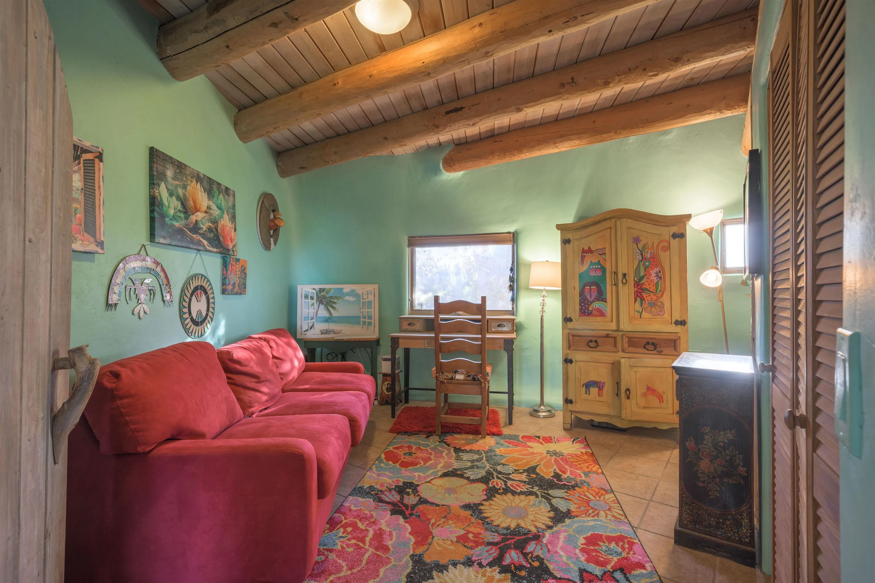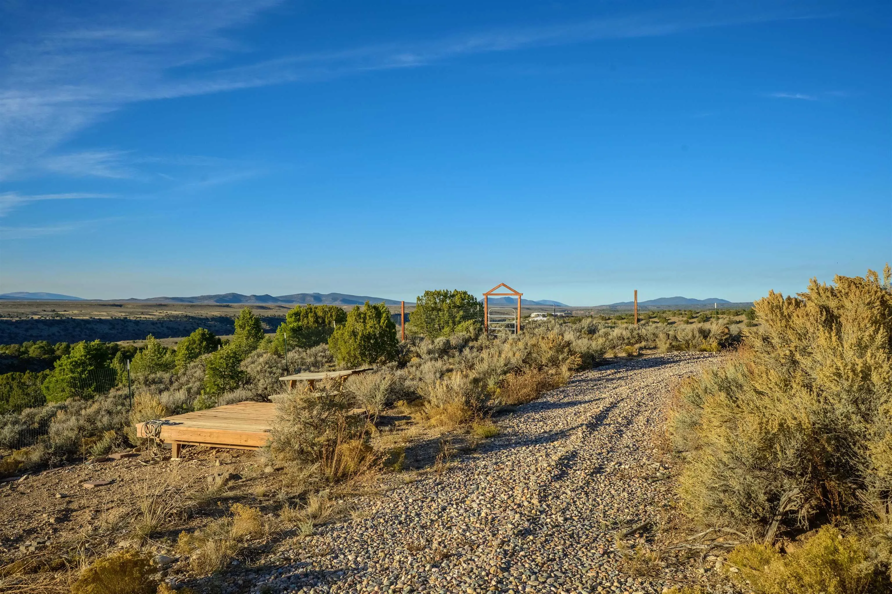 A Dreamy & Wondrous Masterpiece in Taos, New Mexico ~ Perched on five-plus pristine and private high-desert acres at the end of Tune Drive, you will discover “The Dreaming Dome,” a dreamy and wondrous architectural masterpiece. Truly whimsical and delightfully outlandish in all the best ways, this structure—as featured on HGTV and in Parade Magazine as “The Most Beautiful House in America”—is more of a sculpture than your standard residence. Inspired by the rainforests of Costa Rica and the New Mexico alpine high-desert, this sustainable, monolithic designed dome includes a yoga hut in the backyard, engulfed by the most stunning views the region has to offer. Upon stepping inside this architectural wonder, you are greeted by a visual dreamland defined by 35-foot ceilings, hand-finished adobe-style walls in rich earth tones, hand-carved doors, travertine tile, luxurious stained-glass chandeliers, and high-end CUSTOM finish-work throughout. The spacious interior features vibrant mosaic paths, hand-painted murals, cedar trunk columns with hanging monkeys, toucans, and sloths, beside a romantic mystic tree wood-burning fireplace in the den with a black river rock bancito, and a dramatic painted sky ceiling flooded with circular skylights. The extra-large, half-moon juniper-framed window is as special as can be, offering equally incredible views and providing natural warmth and light from Mother Sun to compliment the radiant heated floors. The functional and stylish kitchen, just beyond the pond (now an atrium), includes Taos turquoise floors, soft green cabinets with marble countertops embedded with stainless steel appliances, a central island bar, beneath the traditional vigas beam ceiling. The adjacent dining room comfortably fits the family and offers another charming gathering area. The home provides ample and elegant space, possessing three distinctive bedrooms with three and a half eclectic bathrooms, including a private second-story primary ensuite straight out of a Disney movie, complete with a fireplace, and accessed by a dazzling sculpted vine staircase that leads up through your bedroom to a walk-in shower and access to a private hot tub deck—perfect for stargazing under the big NM sky. Outside, you will enjoy all of your time taking in the Land of Enchantment, tending to the garden under the cottonwood trees, and entertaining and bewildering your guests en su casa. Some of life’s sweetest memories will be created here, while kids and furry friends roam freely in one of the fenced yards, accessible through a convenient double-doggie-door. Fresh H2O from your own 900-foot private well from the aquifer below is a major plus for day-to-day living, providing some of the best-tasting water you will find. As for the location, it is simply unbeatable for adventure and relaxation, situated close to the Rio Grande River, near natural hot springs, a jaunt from Taos Airport, and not far from the Historic Taos Plaza, world-class skiing and snowboarding at Taos Ski Valley, and endless hiking, biking, fishing, and bird watching trails. Even the wildlife will find their way to this magical wonderland while you lead a yoga class or mold pottery in the Yoga Dome, make bread in the blue horno, drink your morning coffee or evening wine, and experience the sweetest sunsets on our planet; and don’t be surprised if an occasional hot air balloon emerges from the Gorge during a dreamy sunrise. This is custom luxury, eco-friendly, and fantasy, while submerged in nature, right here in Taos, New Mexico. Does it get any better? The answer very well might be no, so don’t waste any time making this wonder of Taos, New Mexico your very own Reality.
