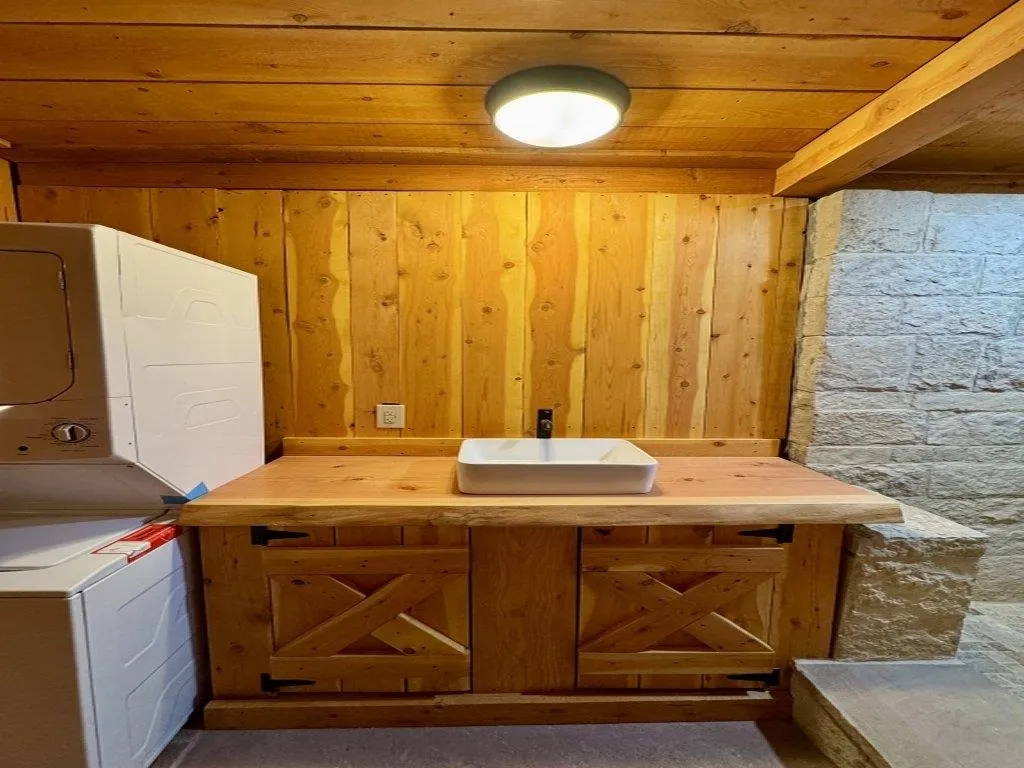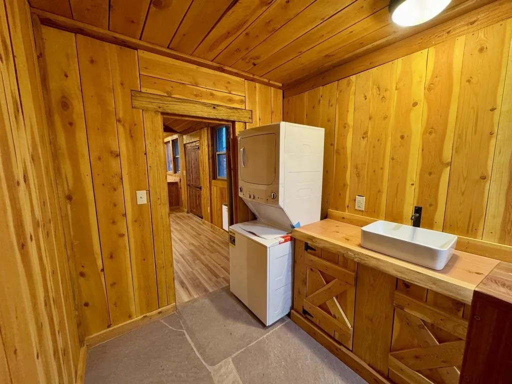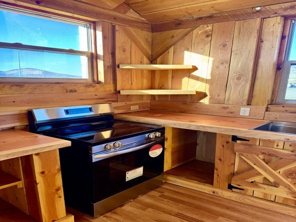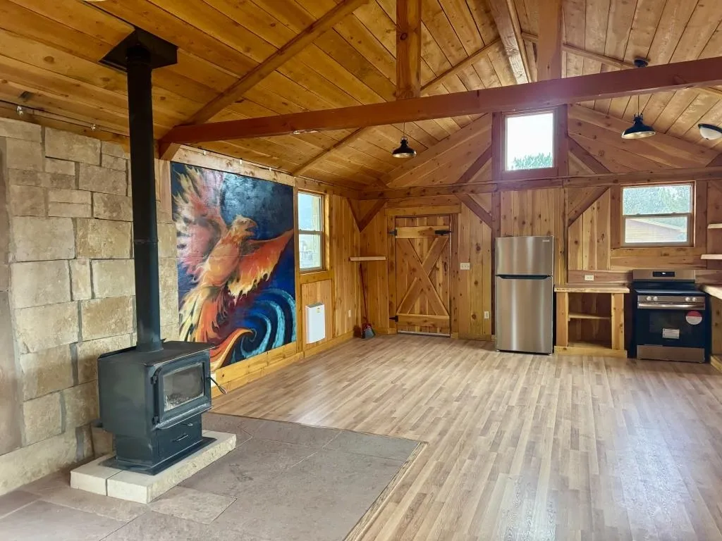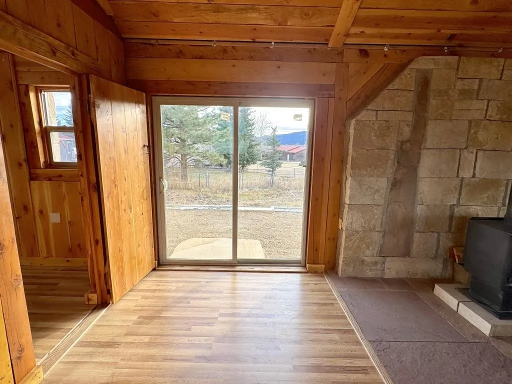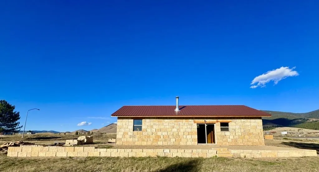 A Stone Mountain Home. The new home is 900 sqft, with one bedroom and one bath on .3 acres with an incredible view of the surrounding mountains and easy access to Hwy 64. Inspired by the Hill Country limestone homes in Texas. the exterior is clad with thick Texas Limestone. The interior walls and ceiling are sided with Doug Fir paneling. The home has a cathedral ceiling and abundant windows that fill the house with light and a beautiful view of the mountains. There is a large “Phoenix Rising” mural. The home has a custom built limestone shower and wood stove surround and custom built Doug Fir counters tops and Red Cedar Front Door. The home is 12 minutes to Angel Fire and 18 minutes to Red River for shopping, skiing and off roading. Located in a beautiful valley just a few blocks from Eagle Nest Lake allows for year around access to hunting and fishing. The home is connected to Eagle Nest water, sewer and electric power. With the thick limestone exterior siding and heavy insulation the home will stay warm in the winter and cool in the summer. With a wood stove and electric heaters in every room the home will be comfortable year around. The temperature in the mountains here rarely rises above the 70’s in the summer making it the perfect escape from the summer heat. An extra bedroom, garage or a flagstone patio can be added if desired. The house is set up for a direct wifi connection if you want to work from home in a beautiful mountain valley. The house is zoned commercial/residential.