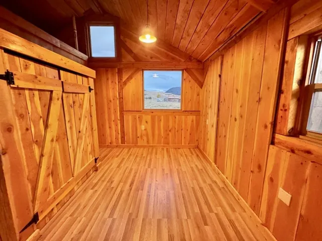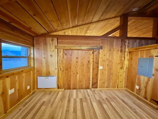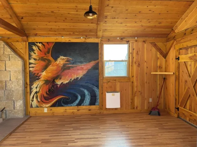 A Stone Mountain Home. The new home is 900 sqft, with one bedroom and one bath on .3 acres with an incredible view of the surrounding mountains and easy access to Hwy 64. Inspired by the Hill Country limestone homes in Texas. the exterior is clad with thick Texas Limestone. The interior walls and ceiling are sided with Doug Fir paneling. The home has a cathedral ceiling and abundant windows that fill the house with light and a beautiful view of the mountains. There is a large “Phoenix Rising” mural. The home has a custom built limestone shower and wood stove surround and custom built Doug Fir counters tops and Red Cedar Front Door. The home is 12 minutes to Angel Fire and 18 minutes to Red River for shopping, skiing and off roading. Located in a beautiful valley just a few blocks from Eagle Nest Lake allows for year around access to hunting and fishing. The home is connected to Eagle Nest water, sewer and electric power. With the thick limestone exterior siding and heavy insulation the home will stay warm in the winter and cool in the summer. With a wood stove and electric heaters in every room the home will be comfortable year around. The temperature in the mountains here rarely rises above the 70’s in the summer making it the perfect escape from the summer heat. An extra bedroom, garage or a flagstone patio can be added if desired. The house is set up for a direct wifi connection if you want to work from home in a beautiful mountain valley. The house is zoned commercial/residential.