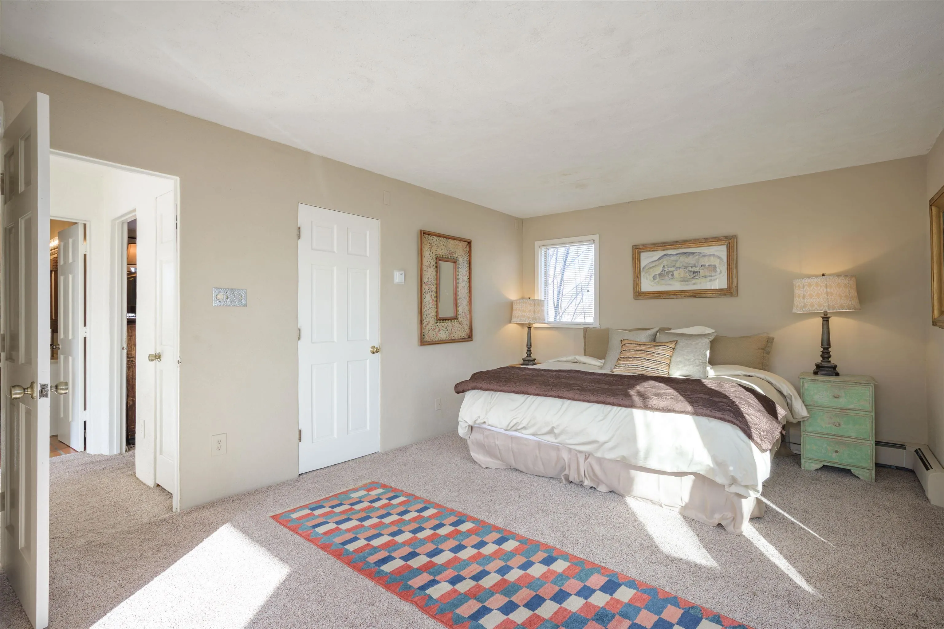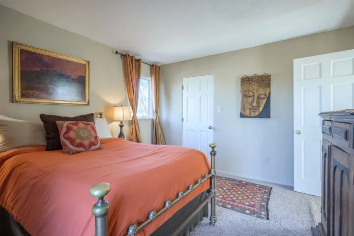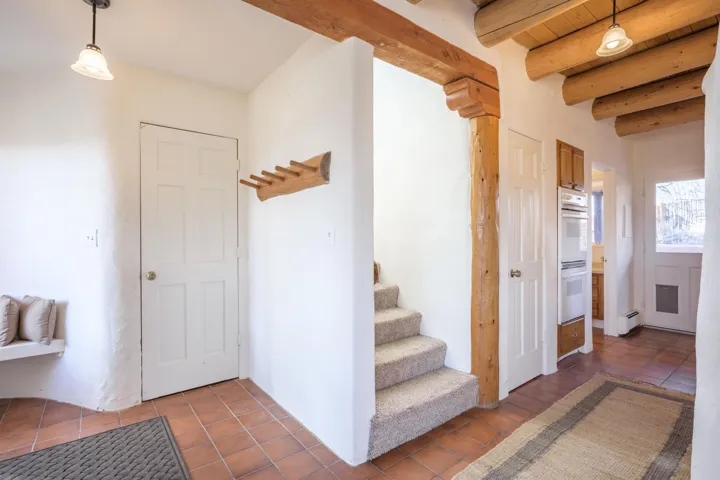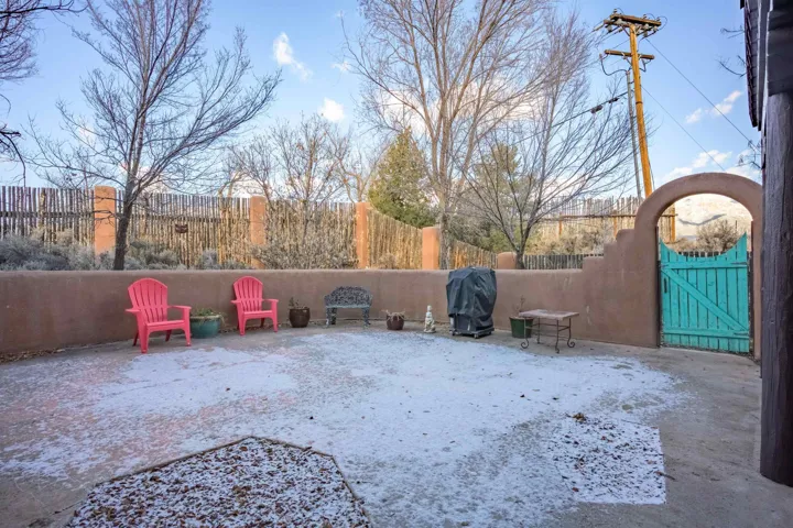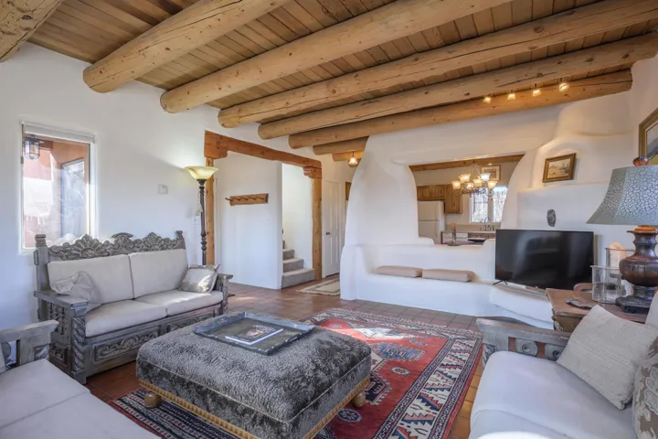 Discover classic Northern New Mexico charm in this beautifully maintained end-unit townhouse perfectly positioned between Arroyo Seco, the Town of Taos, and Taos Ski Valley. Warm architectural details—including vigas, Saltillo-style tile, carved wood accents, and hand-troweled plaster walls—give the home an inviting Southwestern character from the moment you step inside. The main level features a bright, open living area with large windows framing stunning mountain views, plus a cozy kiva-style fireplace that anchors the space. The adjacent kitchen offers generous counter space, natural wood cabinetry, and a built-in banco dining nook with sculpted adobe forms that echo traditional Taos design. A full bath with laundry adds convenient functionality on the first floor. Upstairs, both bedrooms are filled with natural light and offer access to outdoor spaces with views of the Sangre de Cristo range. The primary bedroom includes a spacious sunroom-style nook—ideal for a home office, reading area, or meditation retreat. A large second full bath with dual Talavera sinks completes the upper level. Outdoor living areas include a private walled courtyard off the kitchen and additional fenced space suitable for pets or gardening. A detached one-car carport adds covered parking and storage options. With only four units and no HOA or condo dues, this property offers rare tranquility with unbeatable proximity to skiing, hiking, dining, and the vibrant culture of Taos and Arroyo Seco. A wonderful opportunity to enjoy the best of Northern New Mexico living.