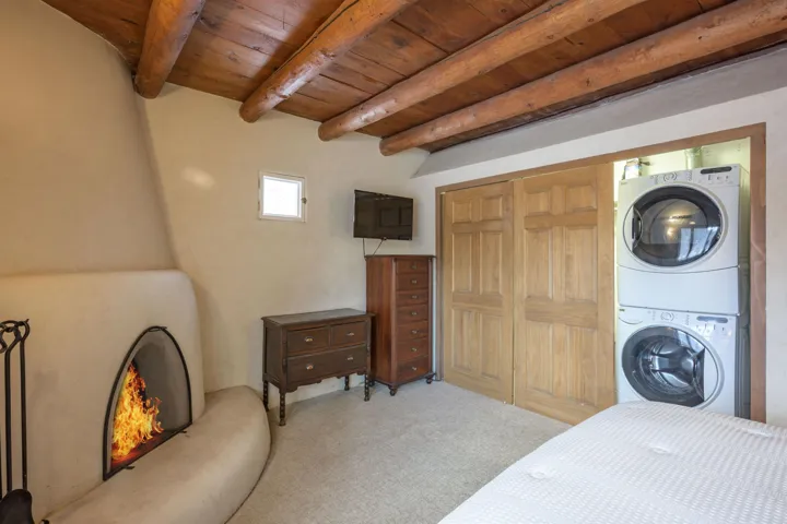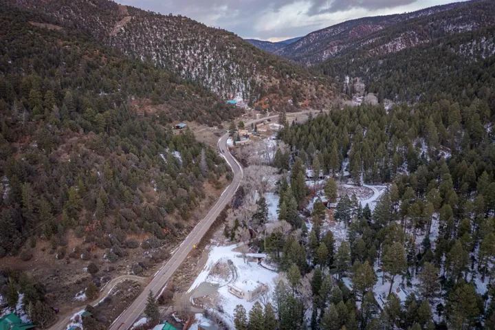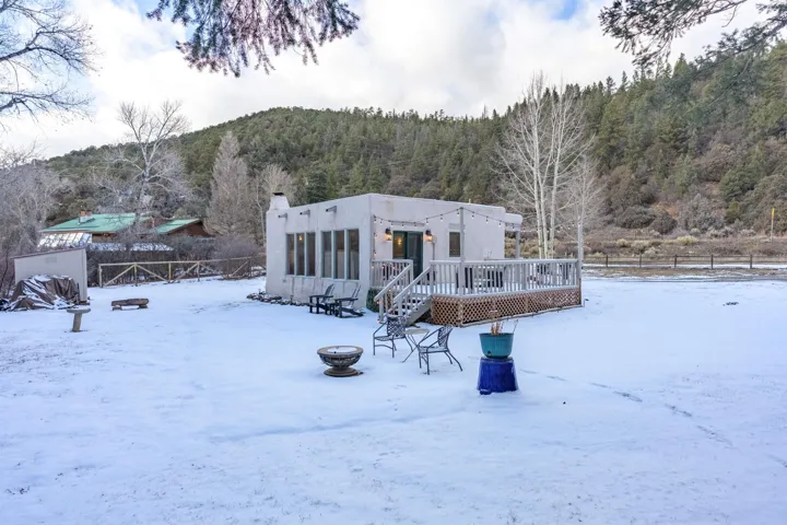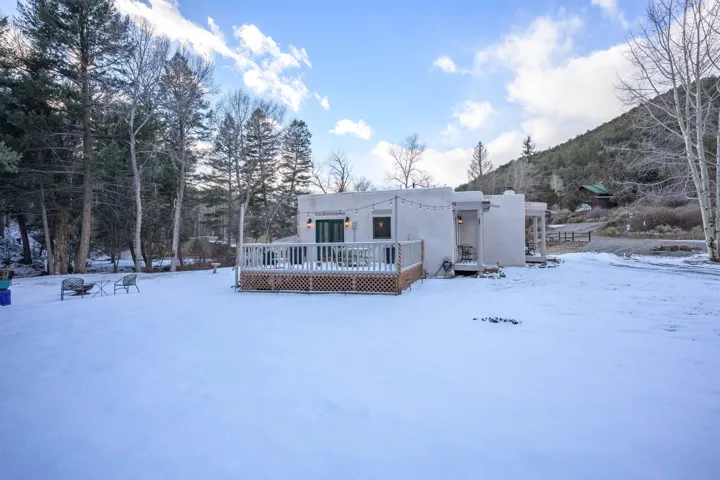 Your Winterwonderland Awaits! This turn key gem is being sold furnished as dipicted in the photos. Nestled in the heart of Taos Canyon along the Rio Fernando, this charming 1-bedroom adobe home offers a serene retreat on 0.91 acres of lush, wooded surroundings. Set back from the road and enveloped by mature trees, the property feels private and peaceful—an ideal escape just minutes from Taos and a short, scenic drive to Angel Fire or Taos. Inside, classic Southwestern craftsmanship shines through with vigas, tongue-and-groove ceilings, plaster walls, and a cozy kiva fireplace that warms the open living space. Large windows line the dining and living areas, bringing in natural light and uninterrupted views of the grassy yard and forest beyond. The updated kitchen features warm wood cabinetry, tile accents, stainless steel appliances, and a breakfast bar that blends seamlessly into the living space. The spacious bedroom includes its own kiva-style fireplace and looks out onto the surrounding greenery. A full bath and a conveniently located laundry closet complete the interior. Outdoor living is where this property truly stands out. Enjoy a morning coffee on the side patio, host gatherings on the large deck, or wander down to your own stretch of the Rio Fernando, where a shaded seating area offers a perfect spot to relax beside the running water. With nearly an acre of usable land, there’s ample room for gardening, pets, and outdoor recreation. Whether you’re looking for a year-round residence or a tranquil mountain getaway, this Taos Canyon gem brings together privacy, natural beauty, and timeless Northern New Mexico character. This Gem Won’t Last Long! Reach Out Today to Schedule Your Exclusive Showing! NOTE: Fire in fireplaces are virtually staged.