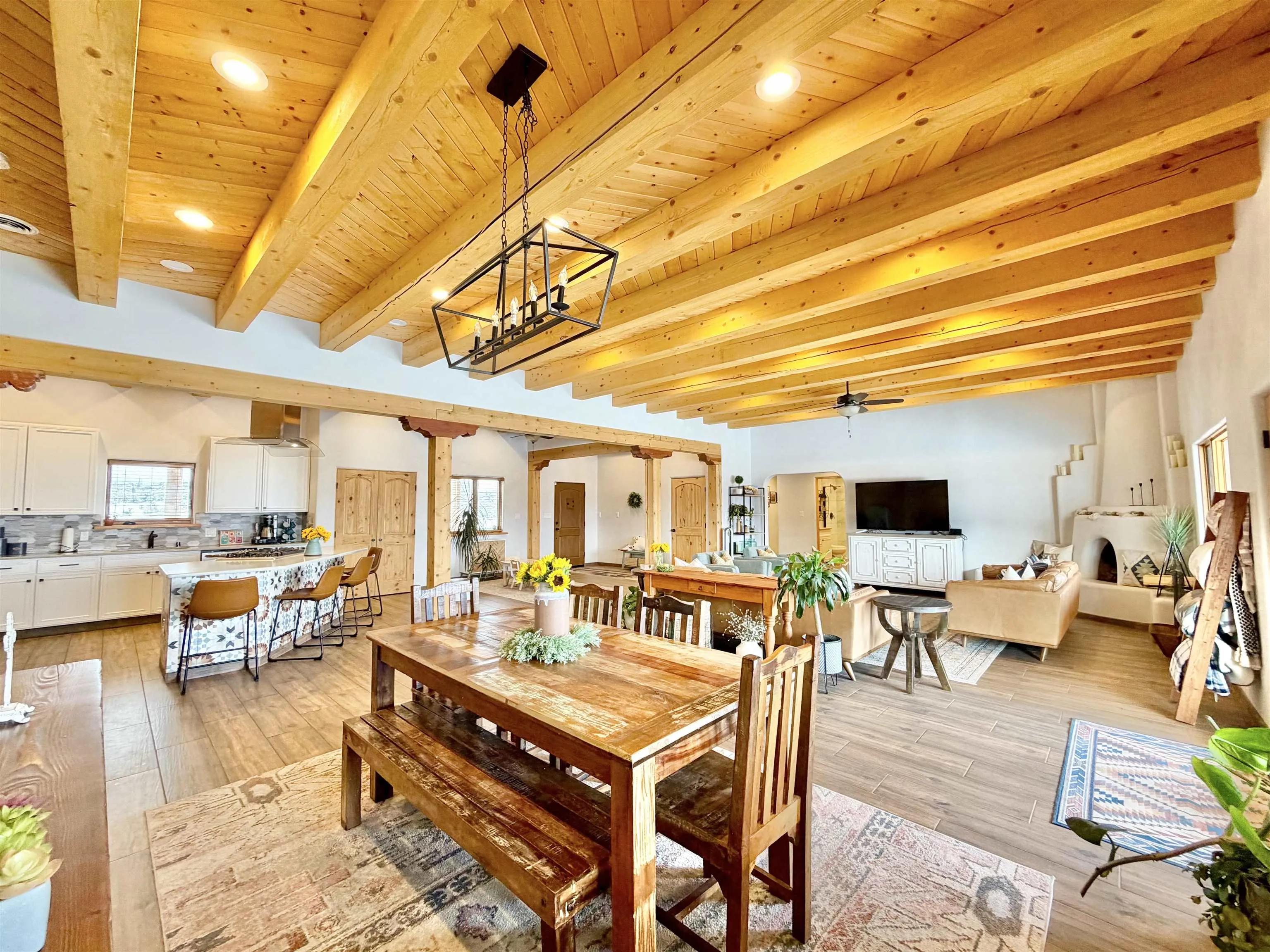 A Resilient and Enchanting Residence in an Optimal Location: Nestled in the heart of Northern New Mexico, this exquisite property offers unparalleled access to renowned amenities such as the esteemed Taos Country Club, the awe-inspiring Rio Grande del Norte National Monument, and the renowned Slide Trail-Upper Trailhead, all conveniently situated near the picturesque Rio Pueblo Gorge. The property’s centerpiece is a meticulously crafted, Pueblo-style residence that spans an impressive 2,993 square feet. It is complemented by an exceptional landscaping design that exudes tranquility and beauty. The distinctive floor plan includes four large bedrooms, three full baths, and is characterized by elegant tile flooring, quartz countertops, stunning elevated viga ceilings, and generously open living spaces. When you aren’t opening the windows to take advantage of the cool northern New Mexico summer nights, this property is equipped with central heat and air conditioning. The primary heat source though, comes from the highly efficient Navien combi-boiler that provides tankless hot water as well as radiant floor heating to the entire home. The radiant floor heating includes a zone for the oversized two-car garage, meaning you will never have to defrost your windshield or climb into a freezing car again! A whole house water softener system enhances the water provided by the property’s private well. The exterior is adorned with a captivating array of miniature rose bushes, iris, and dwarf cherry bushes, and potentilla, providing a pop of color all year long. Professionally designed by Taos Landscaping, the yard features aspen, choke cherry, and pinon trees throughout, all on drip irrigation. The backyard includes a smokeless Breeo fire pit, an outdoor seating area, and a recreational basketball/sport court. All of which is tastefully lit with energy efficient, programmable landscape lighting. The expansive east-facing back patio provides the perfect spot to witness the breathtaking Northern New Mexico sunrise, Taos Country Club’s 14th and 15th fairways, and breathtaking panoramic views of Taos Mountain. Alternatively, the west side of the home provides a serene backdrop for breathtaking sunsets, with the patio and portal serving as inviting vantage points.