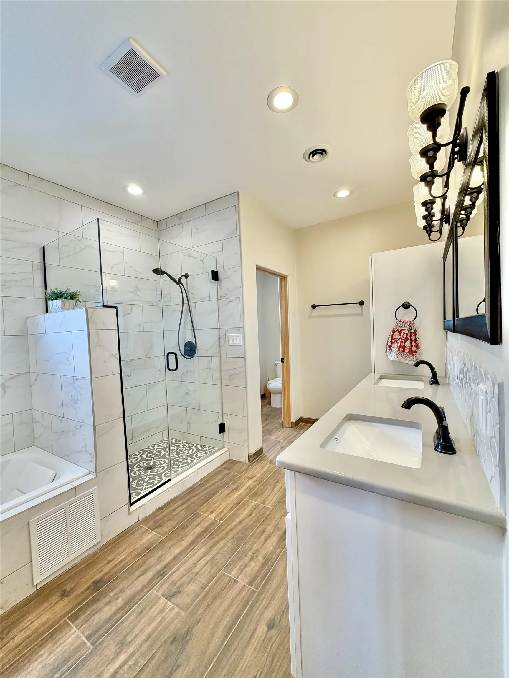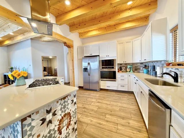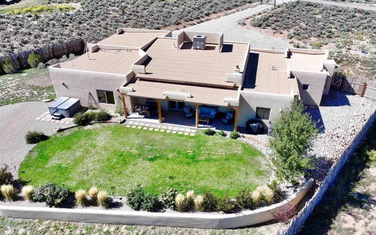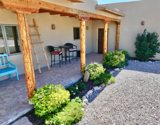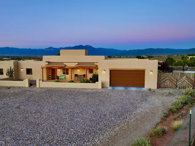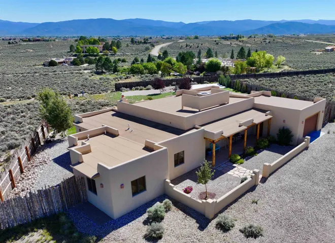A Resilient and Enchanting Residence in an Optimal Location: Nestled in the heart of Northern New Mexico, this exquisite property offers unparalleled access to renowned amenities such as the esteemed Taos Country Club, the awe-inspiring Rio Grande del Norte National Monument, and the renowned Slide Trail-Upper Trailhead, all conveniently situated near the picturesque Rio Pueblo Gorge. The property’s centerpiece is a meticulously crafted, Pueblo-style residence that spans an impressive 2,993 square feet. It is complemented by an exceptional landscaping design that exudes tranquility and beauty. The distinctive floor plan includes four large bedrooms, three full baths, and is characterized by elegant tile flooring, quartz countertops, stunning elevated viga ceilings, and generously open living spaces. When you aren’t opening the windows to take advantage of the cool northern New Mexico summer nights, this property is equipped with central heat and air conditioning. The primary heat source though, comes from the highly efficient Navien combi-boiler that provides tankless hot water as well as radiant floor heating to the entire home. The radiant floor heating includes a zone for the oversized two-car garage, meaning you will never have to defrost your windshield or climb into a freezing car again! A whole house water softener system enhances the water provided by the property’s private well. The exterior is adorned with a captivating array of miniature rose bushes, iris, and dwarf cherry bushes, and potentilla, providing a pop of color all year long. Professionally designed by Taos Landscaping, the yard features aspen, choke cherry, and pinon trees throughout, all on drip irrigation. The backyard includes a smokeless Breeo fire pit, an outdoor seating area, and a recreational basketball/sport court. All of which is tastefully lit with energy efficient, programmable landscape lighting. The expansive east-facing back patio provides the perfect spot to witness the breathtaking Northern New Mexico sunrise, Taos Country Club’s 14th and 15th fairways, and breathtaking panoramic views of Taos Mountain. Alternatively, the west side of the home provides a serene backdrop for breathtaking sunsets, with the patio and portal serving as inviting vantage points.