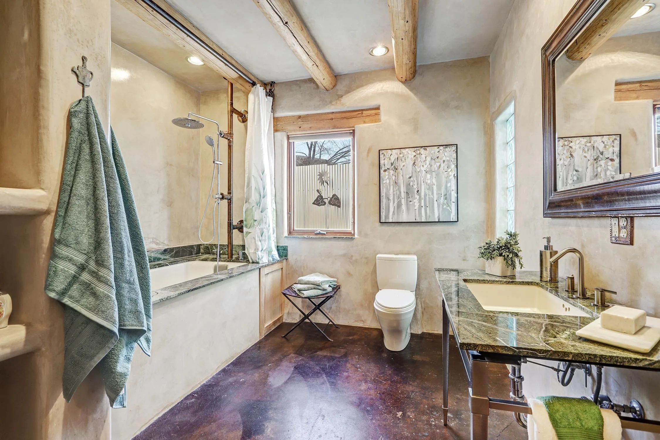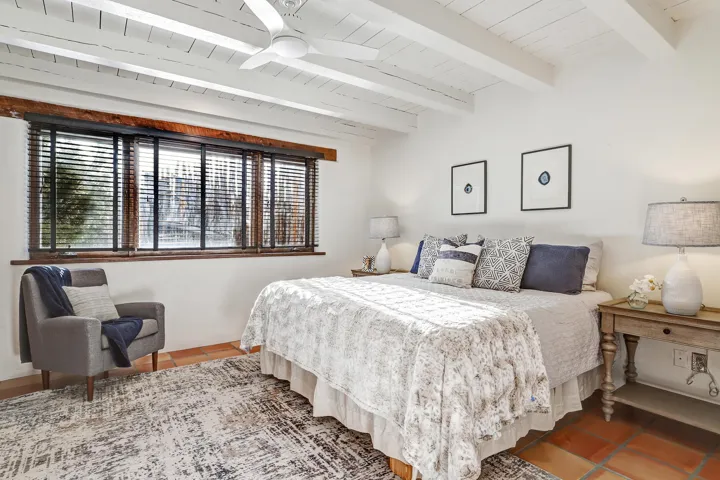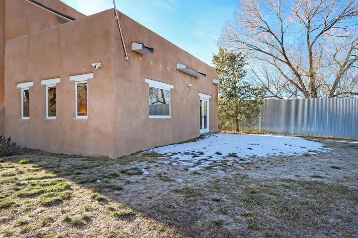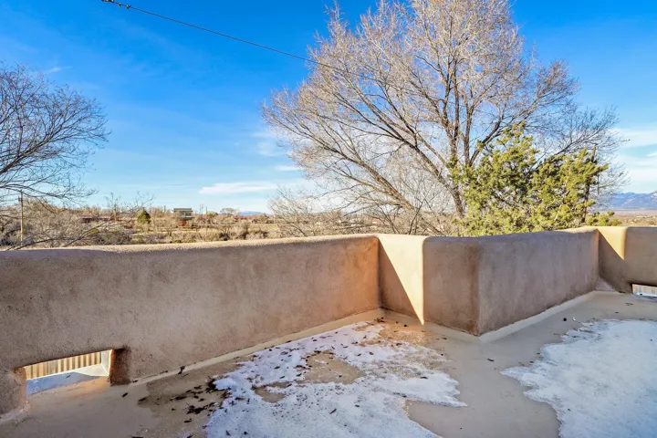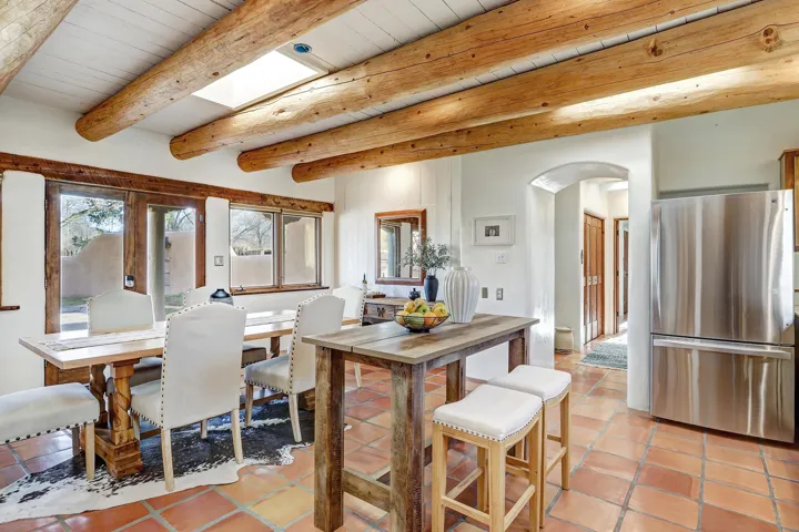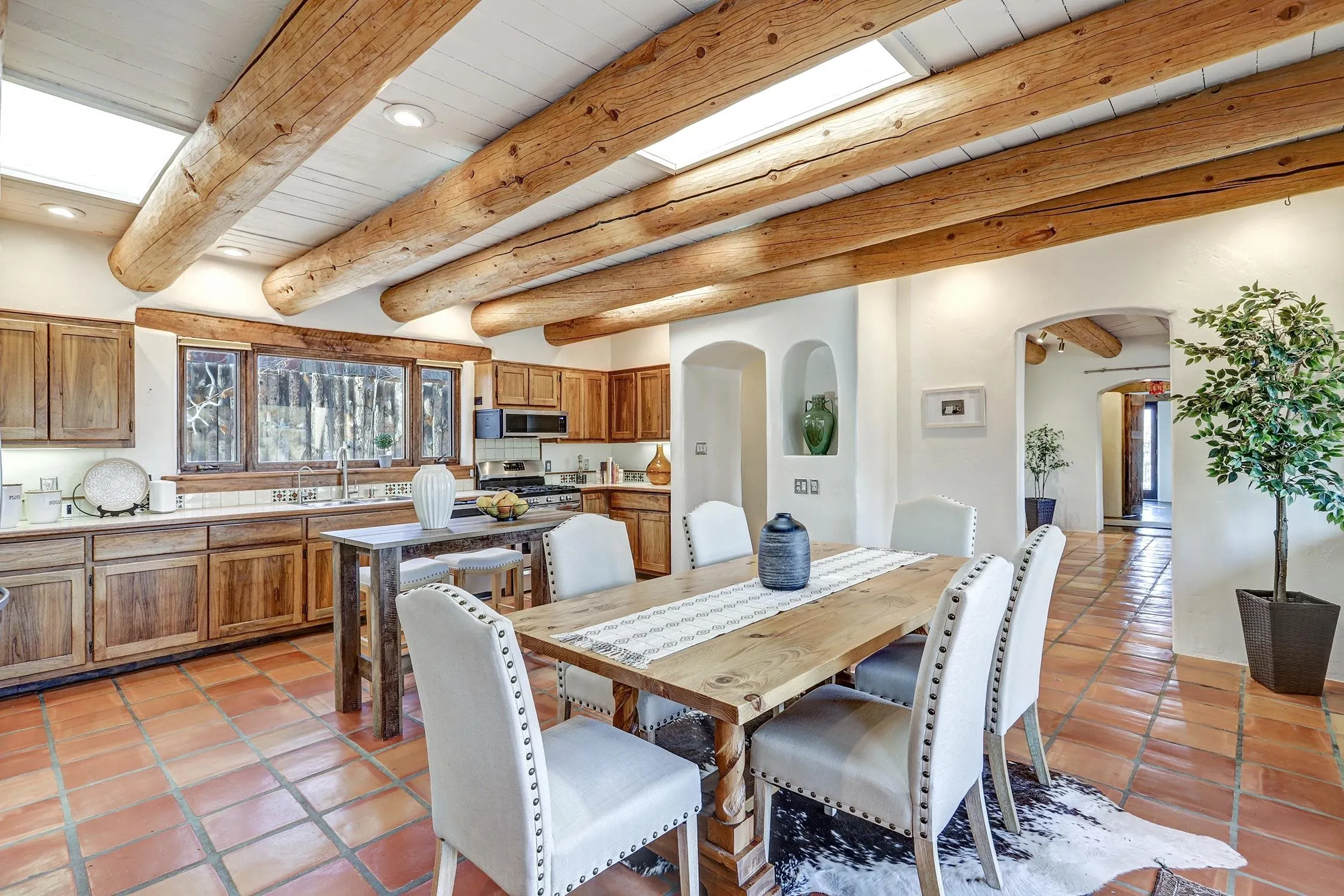 Nestled on over half an acre on the south end of Taos, this elegant 2,721 sq ft home perfectly captures the beauty, warmth, and spirit of Northern New Mexico. Step inside and feel the charm of classic Southwest design — graceful vigas and beams, Saltillo tile, stained concrete and wood floors, and abundant natural light streaming through skylights. The two-story layout offers 4 bedrooms, 3 baths, with the smaller bedroom being ideal to use as an office, studio, or nursery. Upstairs, a private suite features an ensuite bath, breathtaking Taos Mountain views, and access to a rooftop lounging area — the perfect spot to unwind beneath the New Mexico sky. Outside, you’ll find gardens, grassy spaces, and a patio with a fireplace, creating a tranquil setting for morning coffee or sunset gatherings. A flexible downstairs layout offers the potential for a glorious primary suite or even a lock off suite — ideal for guests, extended family, or rental income. Beautifully designed and filled with light, this home offers comfort, versatility, and a sense of place that is uniquely Taos.