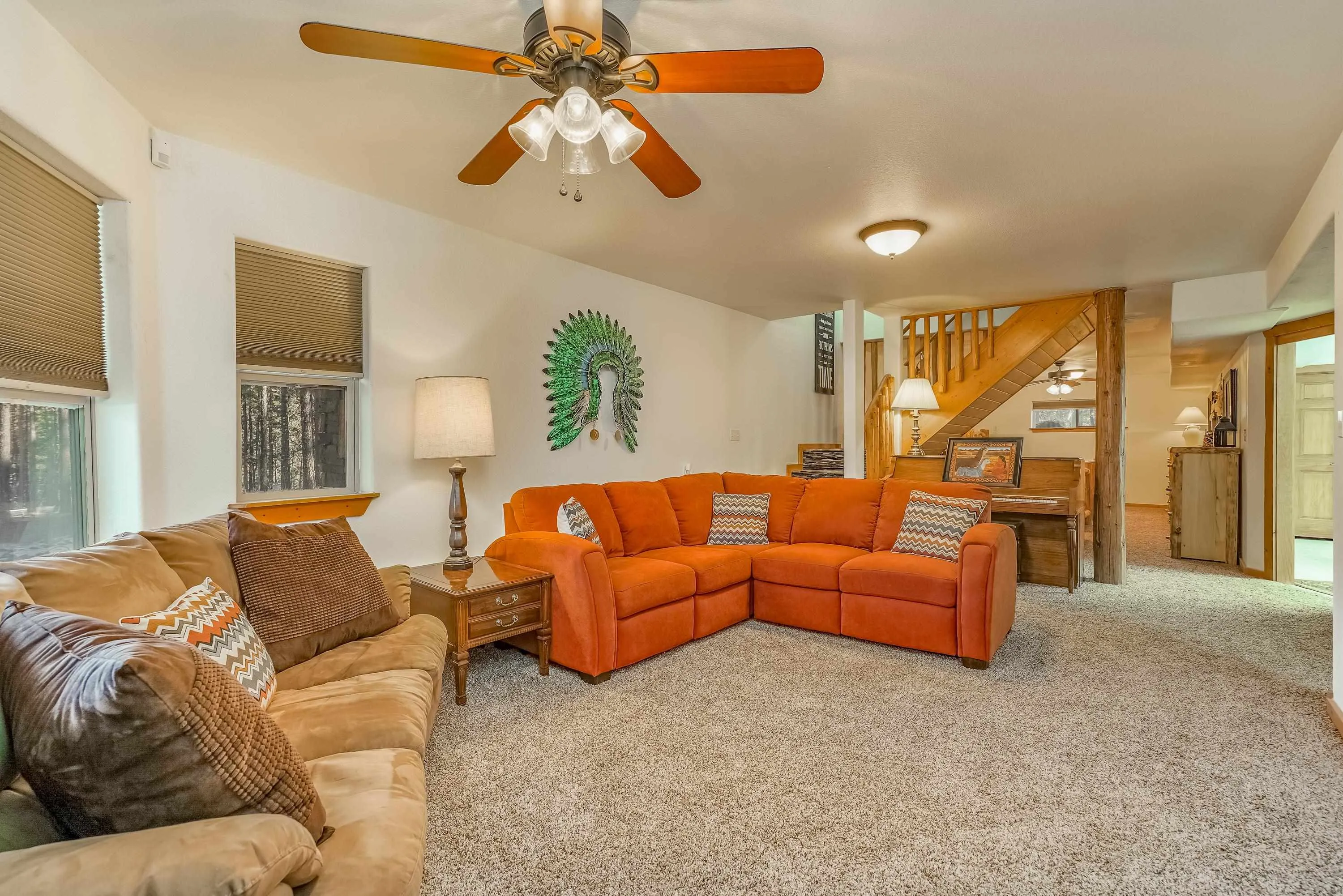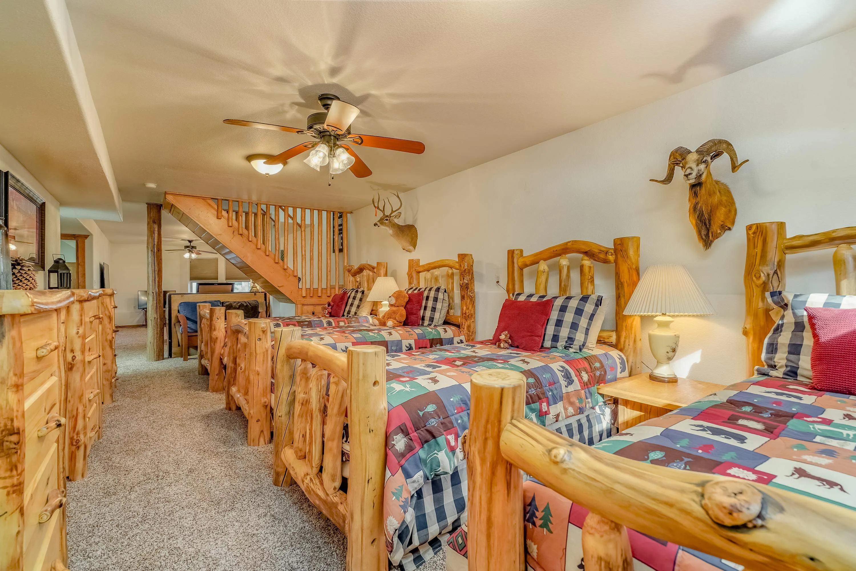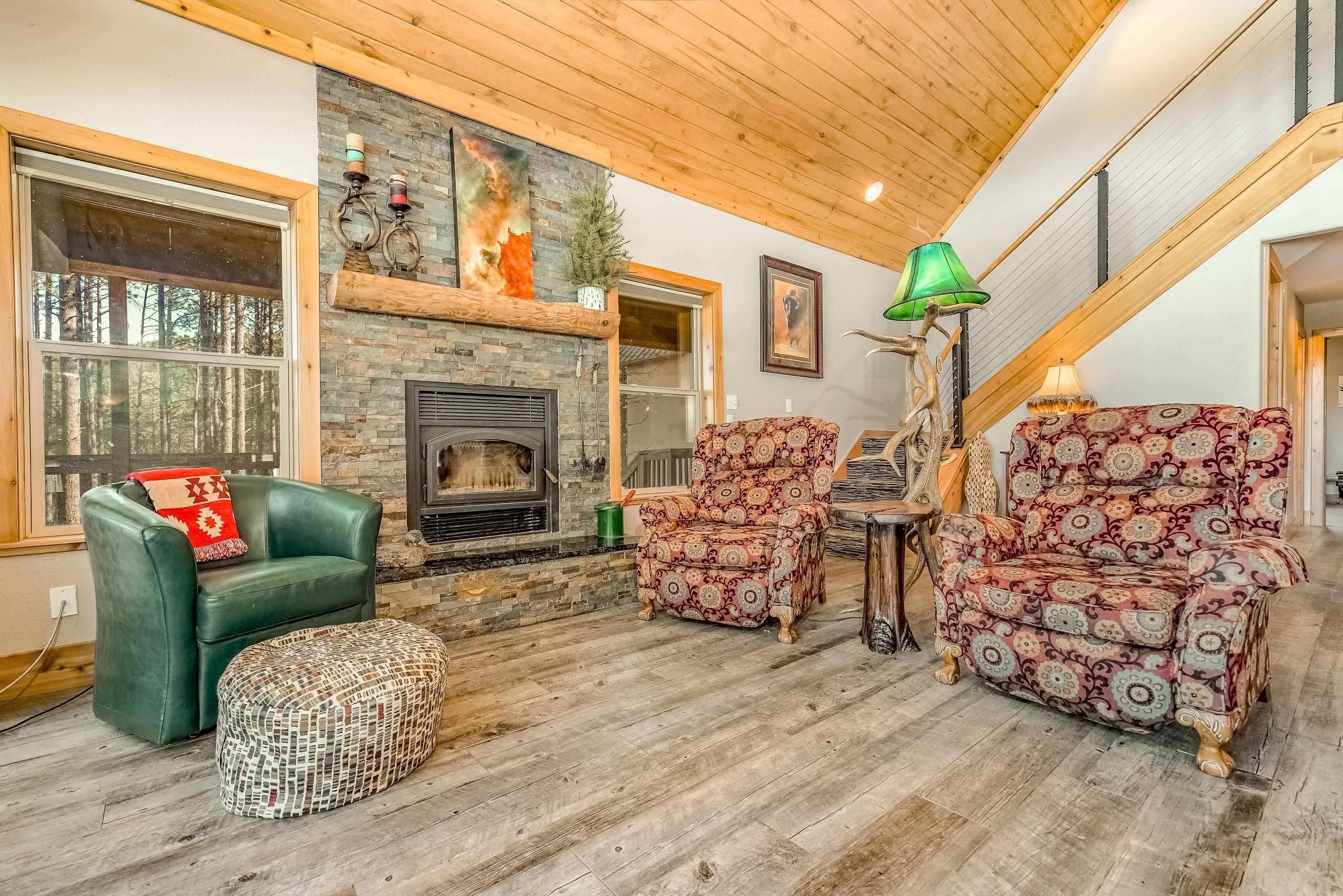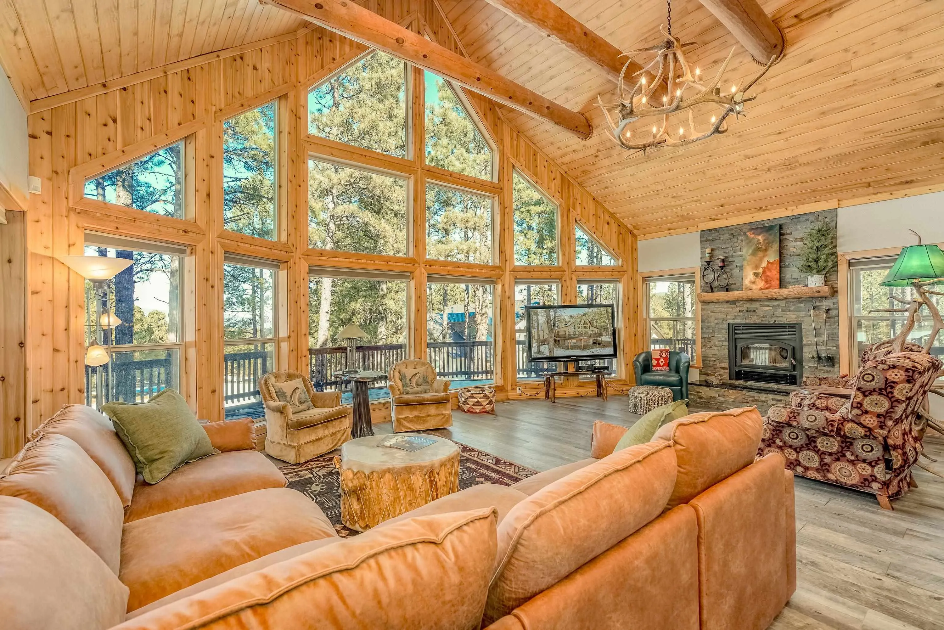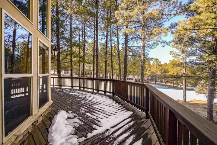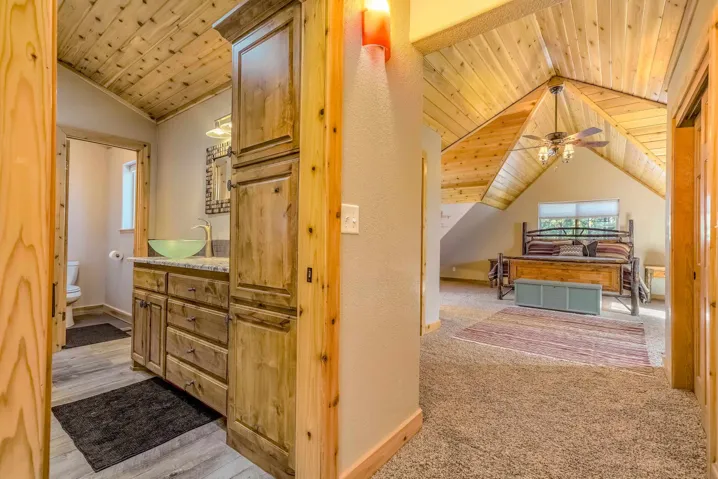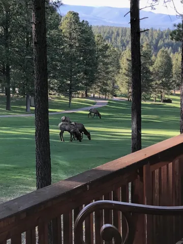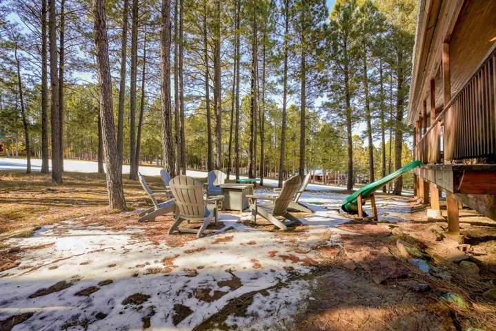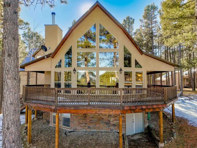 Incredibly beautiful custom home located on the highly manicured 10th green of the Angel Fire Golf Course, close to the Country Club and just a short drive to the Tennis/Pickleball Courts, Monte Verde Lake and the AF Ski Basin. As you enter the home you are welcomed with a custom front door and entryway. The open floor plan with a stacked stone fireplace featuring a wood burning stove, new cable railing and flooring is a great place for family gatherings. The dining room table seats 8. The main floor has many high end custom features including a kitchen that was remodeled in 2015 with new wood cabinets, granite counter tops, a turquoise inlaid backsplash and a pantry. There is also a guest bedroom and bathroom on the main floor. Retreat upstairs to the huge primary bedroom with vaulted cathedral ceilings and a sitting area and beautiful ensuite with double sinks. There is another guest bedroom and bathroom and a large walk-in closet. The lower level has a second living area and bathroom so the kids have their own space. The bunk room sleeps 4 and another bedroom sleeps 3 so you can accommodate the whole family. The utility room has plenty of space to store all your gear, play board games and do your laundry. Enjoy watching wildlife in your backyard from the large covered deck and build great memories surrounding the fire pit, completed in 2024. There is a 24×24 oversized two car garage. The home has a nice level yard, easy year round access with an asphalt drive. Exterior stacked stone and stucco completed in 2015. Home comes fully furnished so it’s ready for you to enjoy the mountains. If you want a beautiful signature home in Angel Fire this is it. Awesome location with year round access makes this a fantastic rental opportunity!