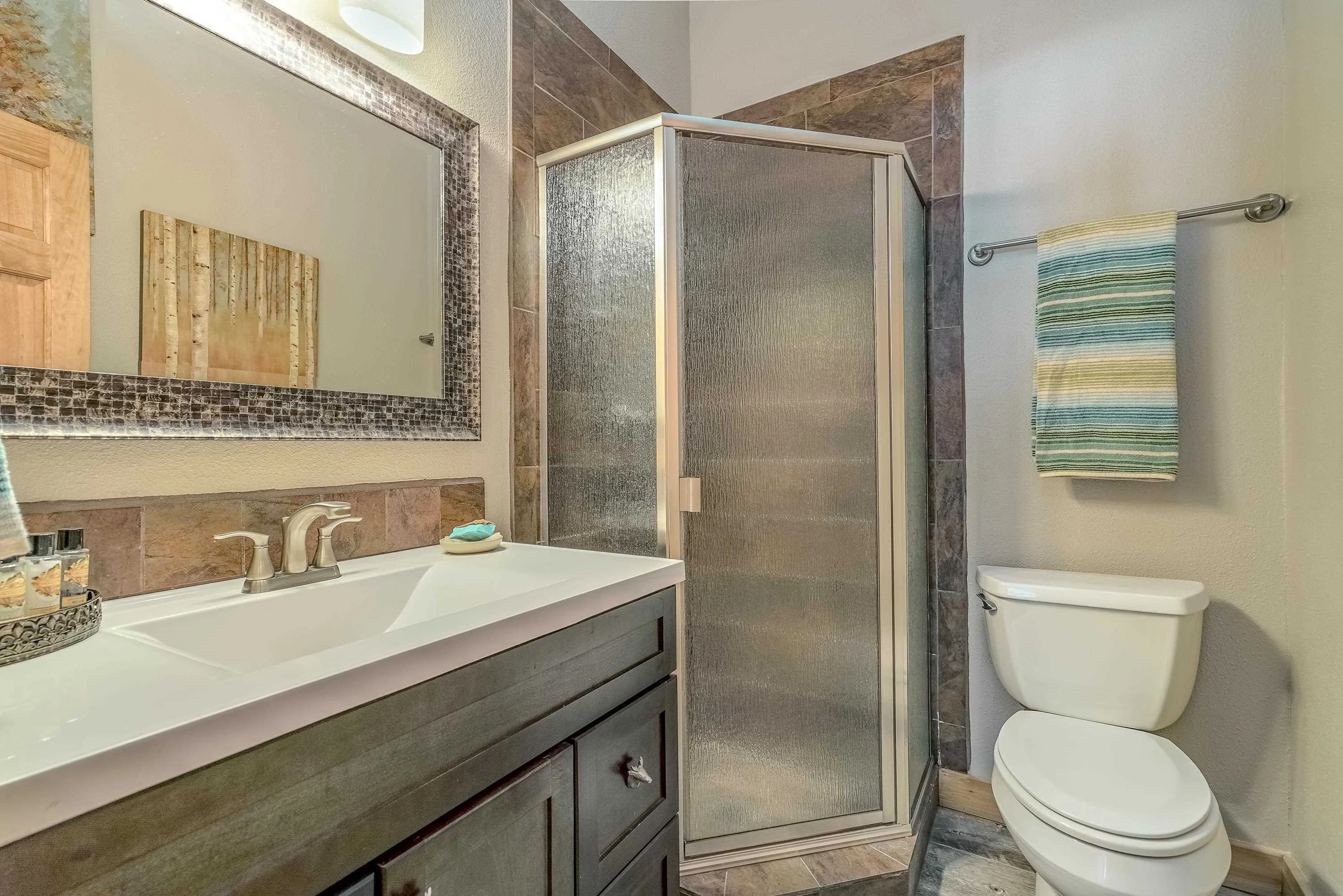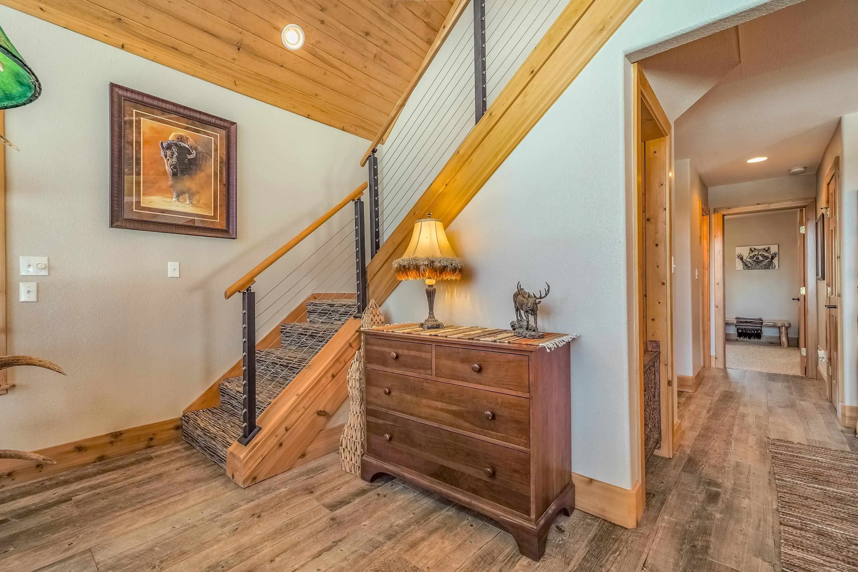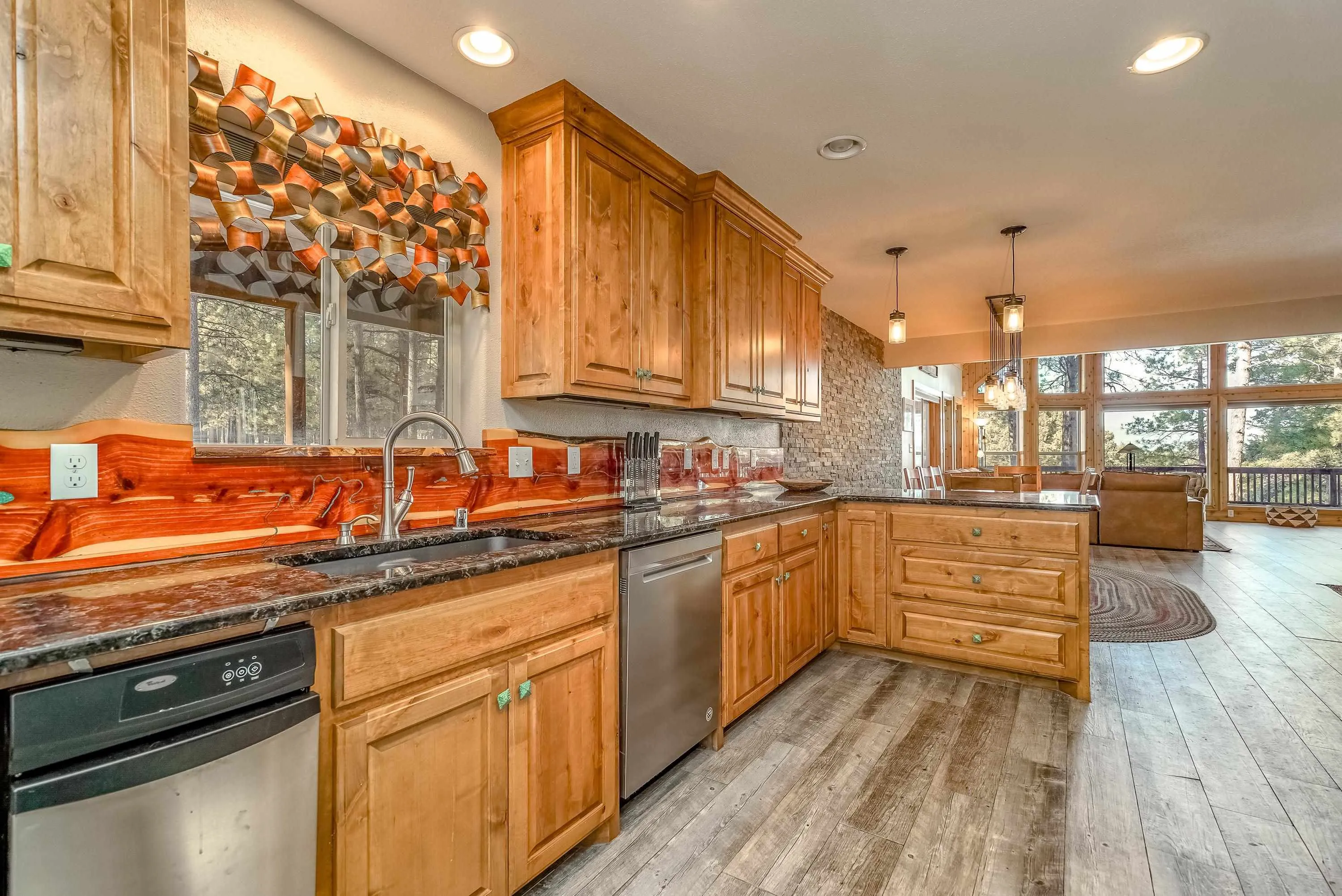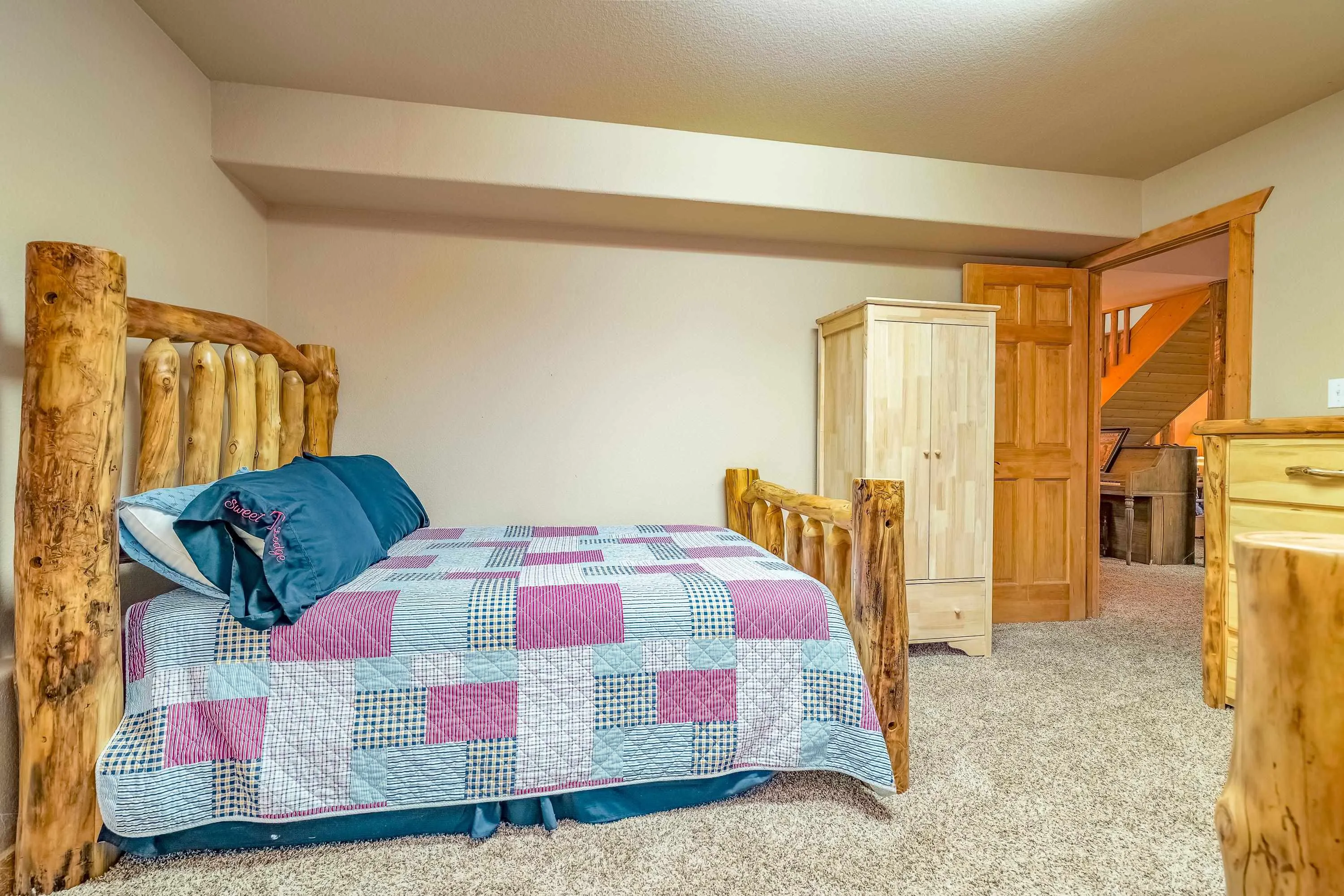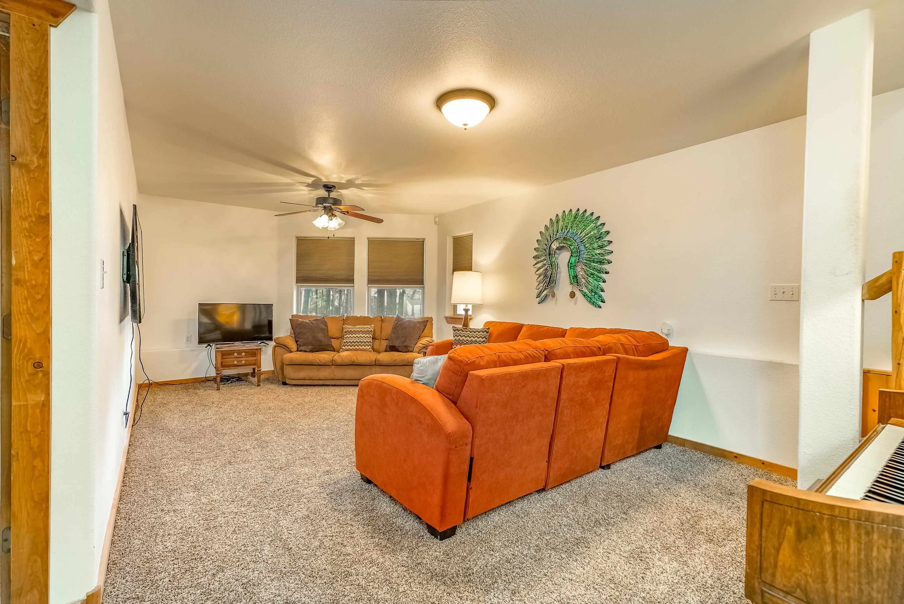 Incredibly beautiful custom home located on the highly manicured 10th green of the Angel Fire Golf Course, close to the Country Club and just a short drive to the Tennis/Pickleball Courts, Monte Verde Lake and the AF Ski Basin. As you enter the home you are welcomed with a custom front door and entryway. The open floor plan with a stacked stone fireplace featuring a wood burning stove, new cable railing and flooring is a great place for family gatherings. The dining room table seats 8. The main floor has many high end custom features including a kitchen that was remodeled in 2015 with new wood cabinets, granite counter tops, a turquoise inlaid backsplash and a pantry. There is also a guest bedroom and bathroom on the main floor. Retreat upstairs to the huge primary bedroom with vaulted cathedral ceilings and a sitting area and beautiful ensuite with double sinks. There is another guest bedroom and bathroom and a large walk-in closet. The lower level has a second living area and bathroom so the kids have their own space. The bunk room sleeps 4 and another bedroom sleeps 3 so you can accommodate the whole family. The utility room has plenty of space to store all your gear, play board games and do your laundry. Enjoy watching wildlife in your backyard from the large covered deck and build great memories surrounding the fire pit, completed in 2024. There is a 24×24 oversized two car garage. The home has a nice level yard, easy year round access with an asphalt drive. Exterior stacked stone and stucco completed in 2015. Home comes fully furnished so it’s ready for you to enjoy the mountains. If you want a beautiful signature home in Angel Fire this is it. Awesome location with year round access makes this a fantastic rental opportunity!