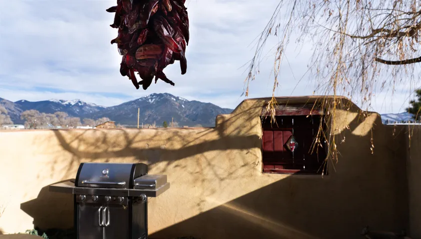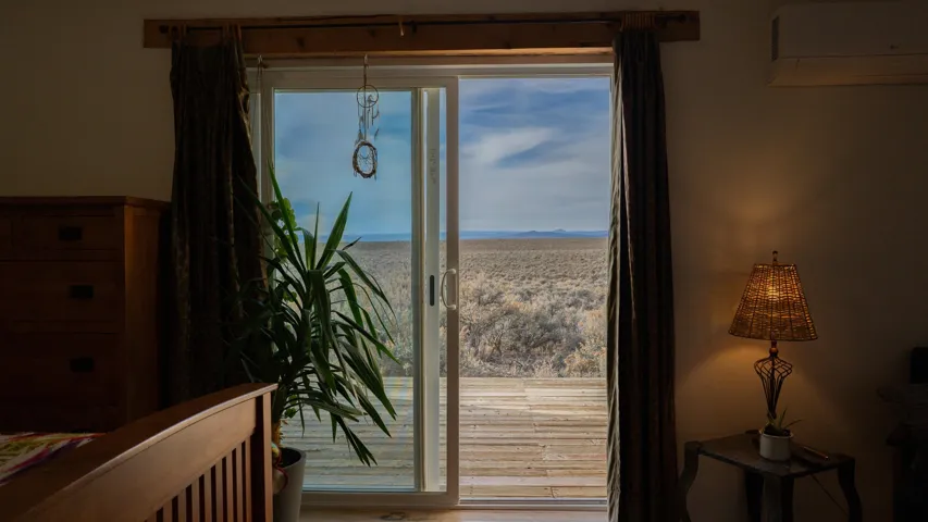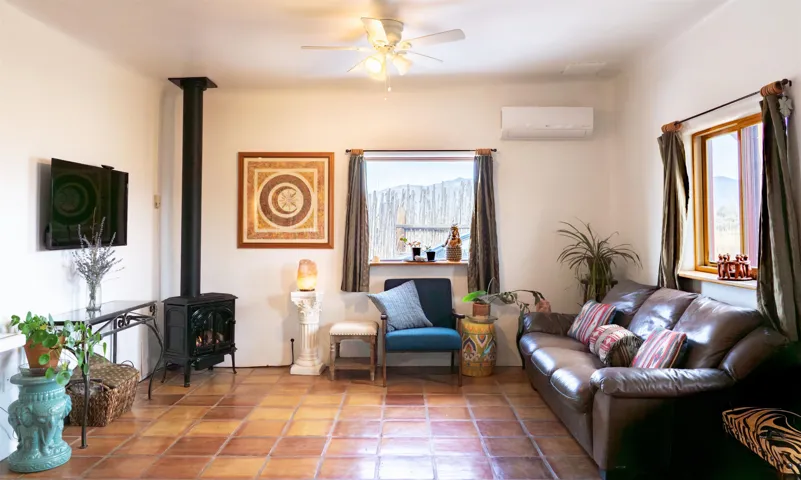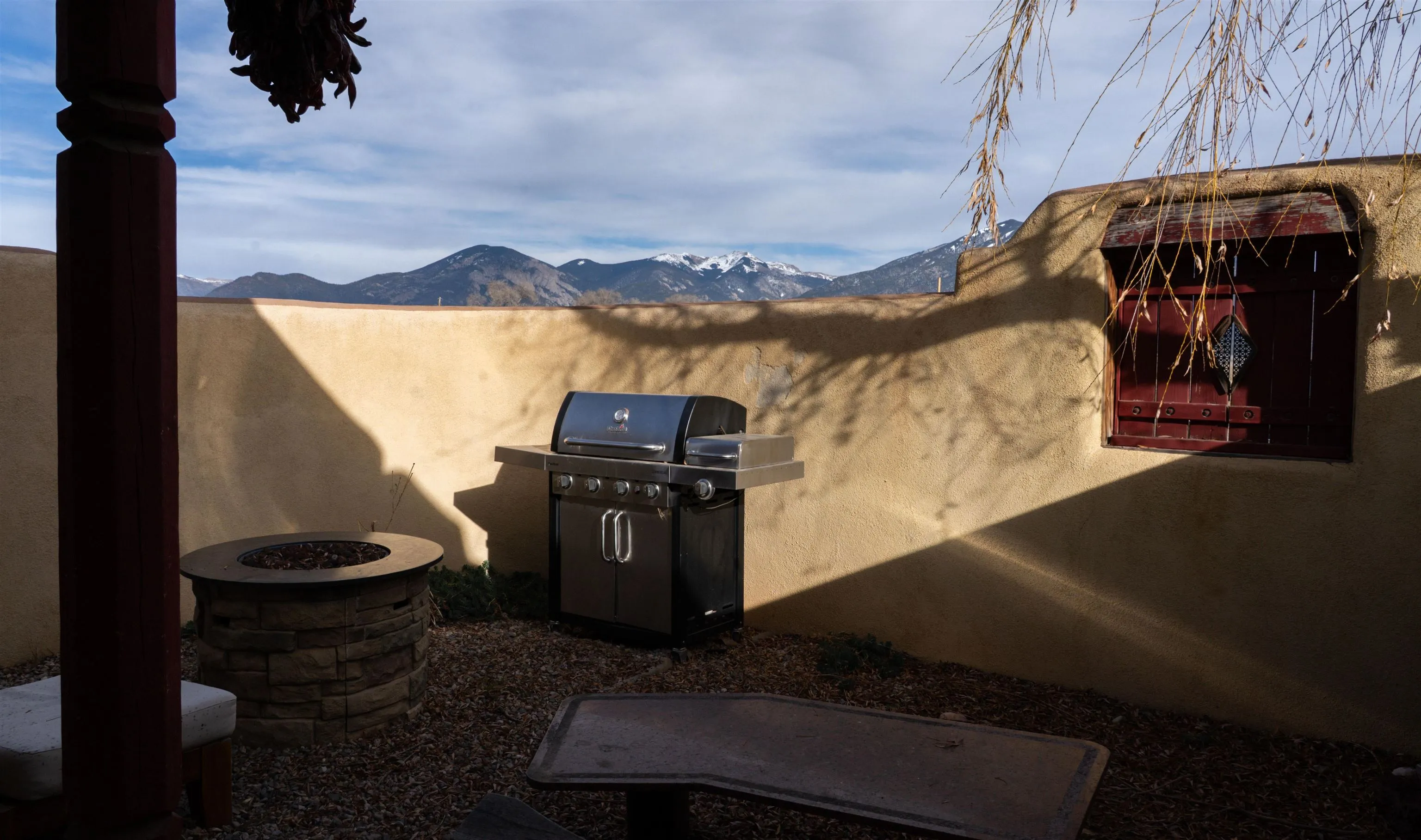 Conveniently located in El Prado, only 13 miles from Taos Ski Valley, and approximately 5 miles from Taos Plaza, this recently remodeled one-bedroom, one-bath end-unit condominium offers an ideal opportunity for a full-time residence, part-time Taos retreat, or income-producing property. The end-unit design features three exterior concrete block walls, creating excellent insulation and a strong noise barrier from the road and neighboring units. This particular unit has two of its own parking spaces next to the unit, separate from the remaining units parking spaces, along with a 10×20 garage with electric service, with an insulated ceiling, and a concrete block west wall. The garage is electrified and has previously been rented on a monthly basis, offering added flexibility and potential income. The interior includes plaster-finished walls, three ceiling fans with lights, and an efficient floor plan with abundant natural light throughout. Heating and cooling are well-supported with two heat-pump mini-splits, electric baseboard heat, and a Jøtul propane stove in the living area capable of heating the entire condo and operating without power during outages. The unit has its own individual propane tank, not shared with other units. A generator system powers the water supply during power outages, adding reliability and peace of mind. Recent 2025 updates include a complete bathroom remodel, installation of heat-pump mini-splits with separate compressor units for each room, replacement of the hot water tank with an instant propane Rinnai system designed for altitude, new appliances including washer/dryer, refrigerator, stove/oven, and water heater, upgraded electrical panel capacity, and replacement of both exterior doors with energy-efficient doors for improved heat and sound control. The condominium association has also recently updated the shared septic system. Enjoy immaculate western views of the mesa, San Antonio Mountain, and stunning Taos sunsets. The property is bordered on the west by undeveloped Taos Pueblo land, providing a rare sense of openness and privacy. Outdoor living includes a fully enclosed front patio and a partially walled rear deck. Personal Garden space along the front exterior wall, and shared garden space on the northern part of the condominium property. Easy access to all that the Taos area offers completes this well-maintained and thoughtfully updated property.