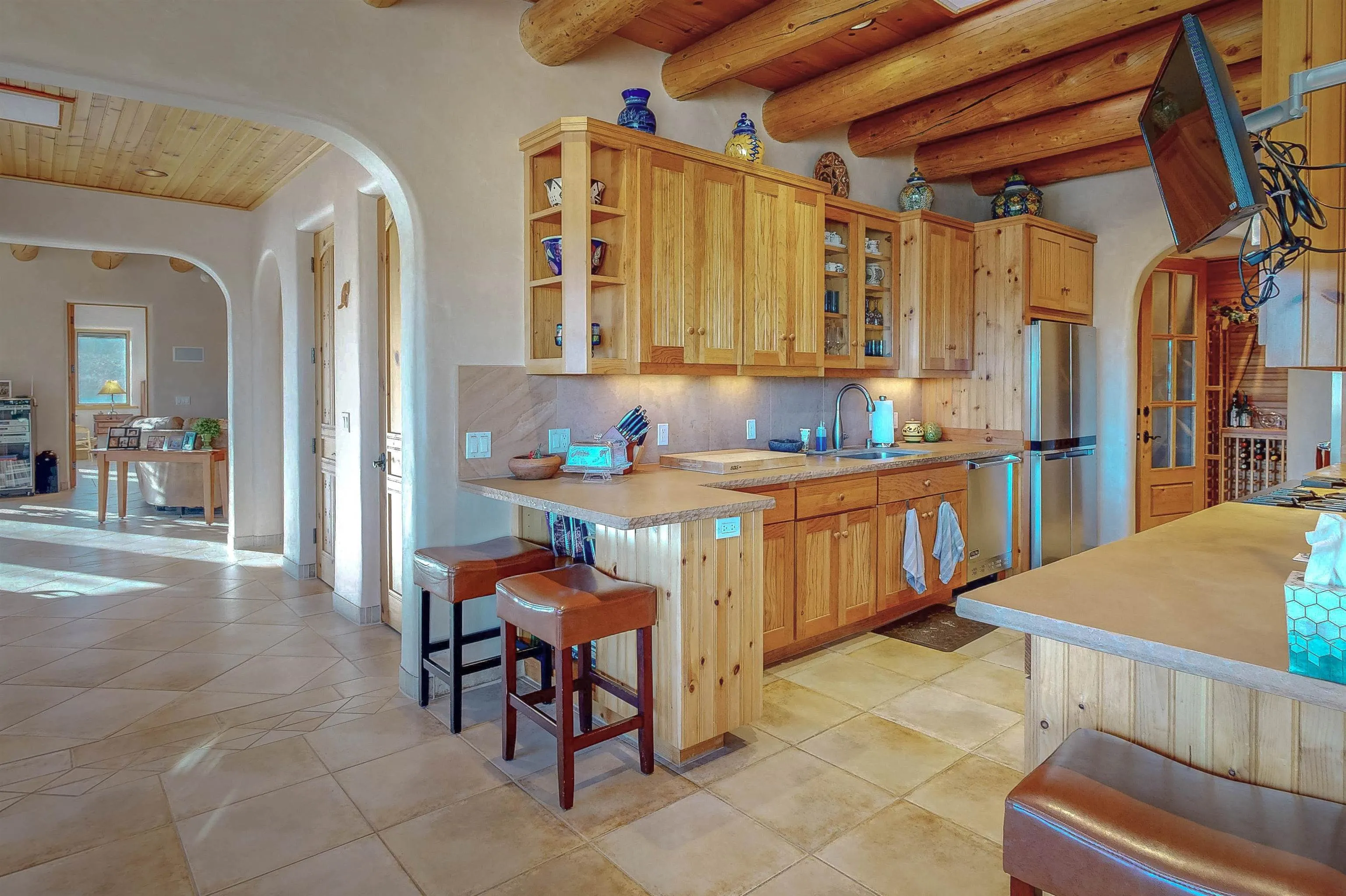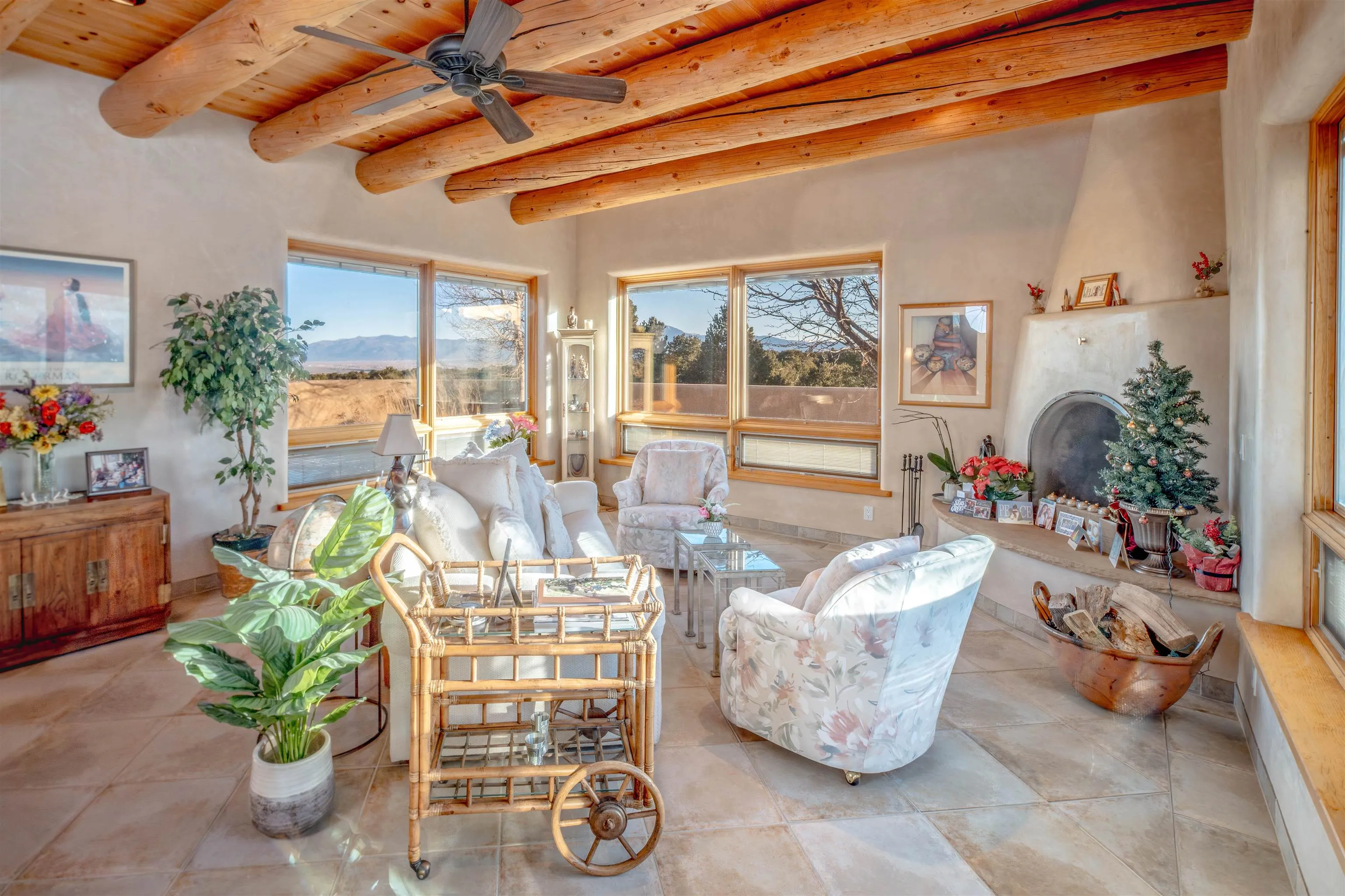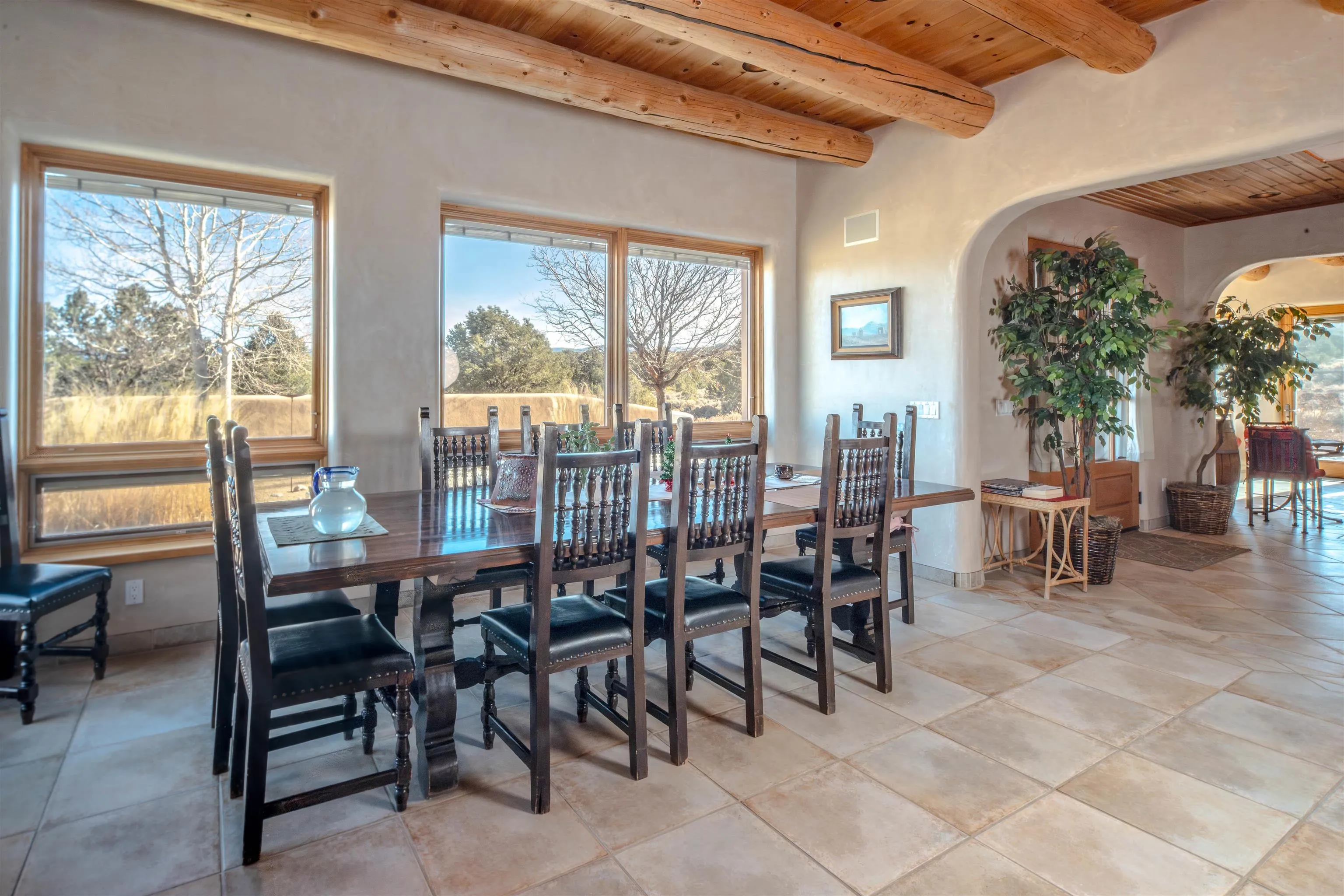Introducing La Esencia de El Mirador, a home designed for the essence of entertaining: sharing life, good food, and spectacular views. Located in the peaceful county setting of Ranchos de Taos in the exclusive El Mirador subdivision, La Esencia de El Mirador is an exceptional single-level residence offering approximately 2,600 square feet of refined living space, masterfully crafted by respected builder Ken Wolosin – known for his quality construction and meticulous attention to detail. A private security gate welcomes you onto the property, immediately setting the tone for the thoughtful design, elevated finishes, and enduring craftsmanship found throughout. Inside, the open-concept floor plan lives effortlessly with no interior steps, elegant porcelain stone floors, and radiant in-floor heating that extends into the expansive 779 sq ft heated garage with storage areas. The inviting living room is anchored by a cozy fireplace and framed by Pella triple-pane R-4 windows, filling the home with natural light while delivering outstanding energy efficiency and serene comfort. Pella doors and windows are featured throughout, with enclosed blinds for additional insulation, and reinforcing the home’s commitment to quality and performance. The chef’s kitchen is a true gathering space, thoughtfully designed for both daily living and entertaining. Viking appliances – including a gas cooktop with hood and double electric wall ovens – are complemented by stone countertops, a dedicated coffee counter, and a well-planned pantry area complete with a wine fridge and microwave. A separate wine closet adds an extra layer of sophistication and convenience rarely found at this level. The primary suite offers a private retreat, featuring a custom California walk-in closet and a luxurious spa-inspired bathroom with an oversized soaking tub and bidet. Two additional bedrooms and a beautifully appointed full guest bath provide comfort and flexibility for family and guests alike. Additional upgrades enhance both form and function, including a Bry fire-resistant roof, ceiling fans in every room, and a security system installed during construction. The spacious utility room includes a deep sink, cabinetry, ample storage, and a gas dryer. The radiant-heated garage is fully finished and exceptionally well-equipped, offering a workbench, wall organizers, a storage room, and a dedicated mechanical room – ideal for projects, hobbies, or outdoor gear. The roof is a flat roof with a 1/2″ per every foot slope instead of the standard 1/4″ per foot slope, allowing for the rain to spew out of the canales feeding all the Aspen trees and wildflowers. The home was also built with 2″ of foil faced styrofoam insulation on the exterior and beneath the plaster creating an R40 insulation thickness value. The current owner is the original owner of this home and was heavily involved in its construction and has kept meticulous maintenance records for the entire 18 years. The home is also being sold mostly furnished. Set on 11.93 quiet, open acres, La Esencia de El Mirador offers remarkable privacy, sweeping views, and space to savor the surrounding landscape – an increasingly rare opportunity in today’s market. With superior craftsmanship, a thoughtfully designed layout, and high-end finishes throughout, this is a home created to be experienced, shared, and enjoyed. This listing has very detailed exterior and interior videos for your viewing pleasure.