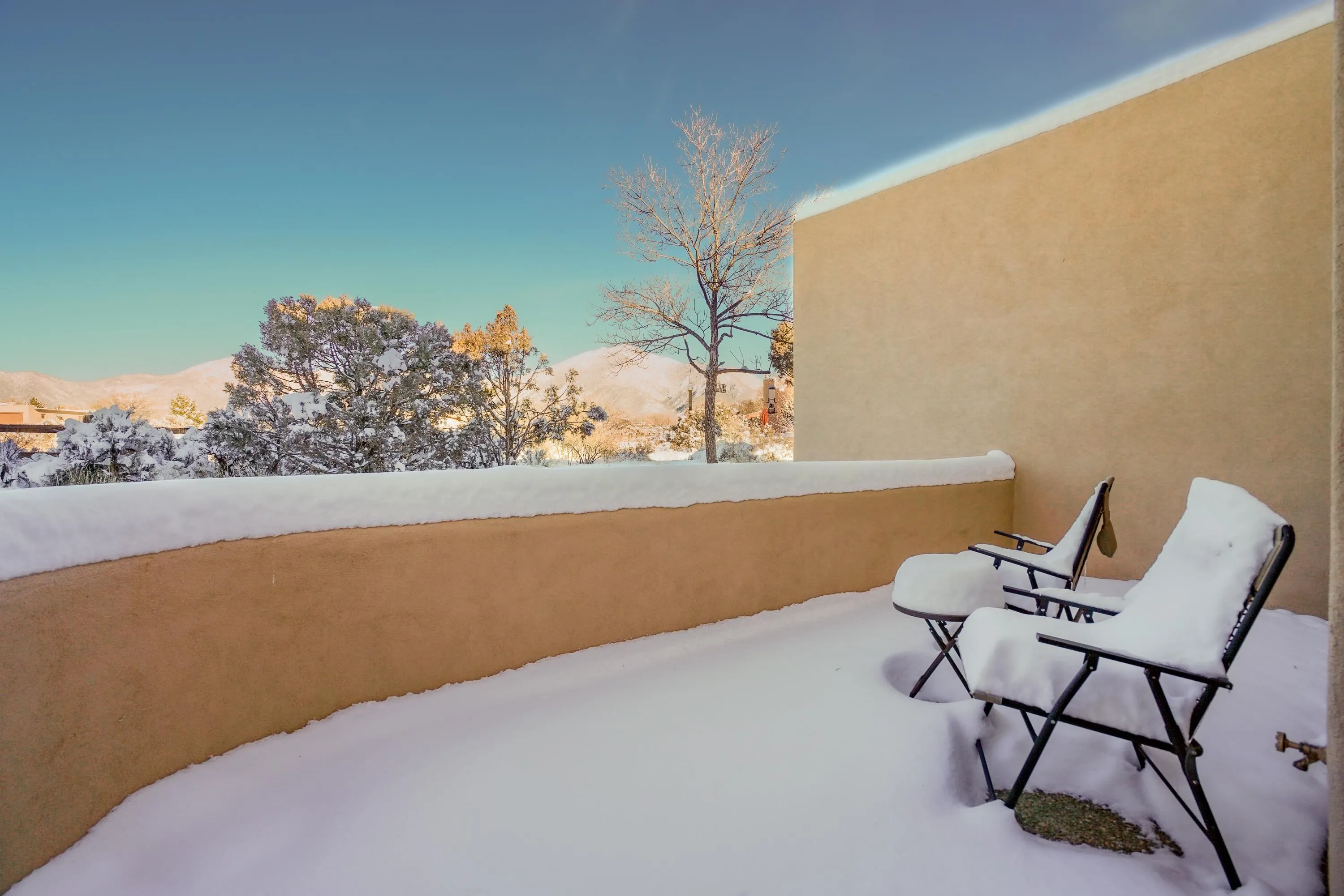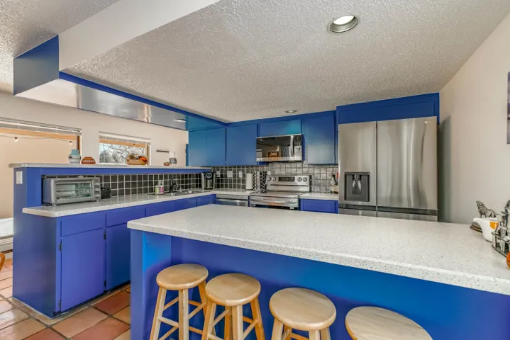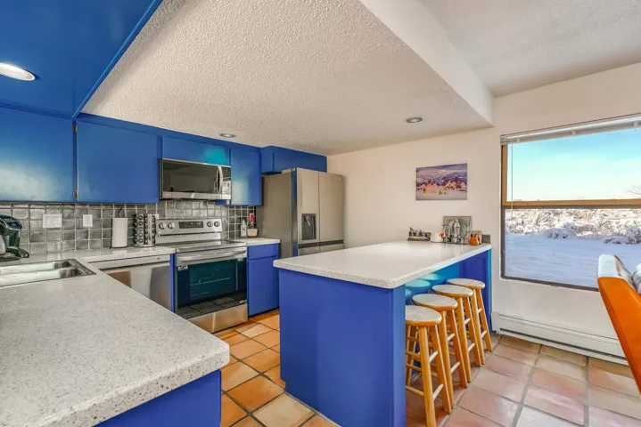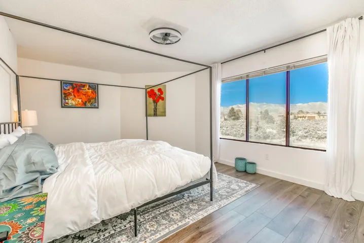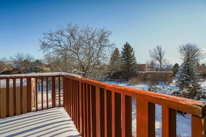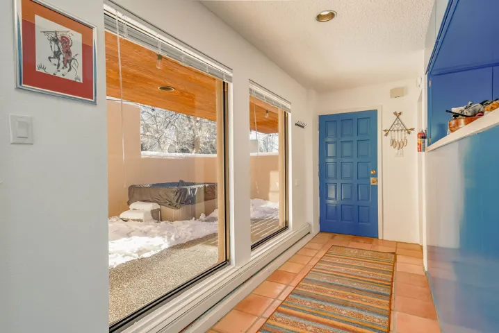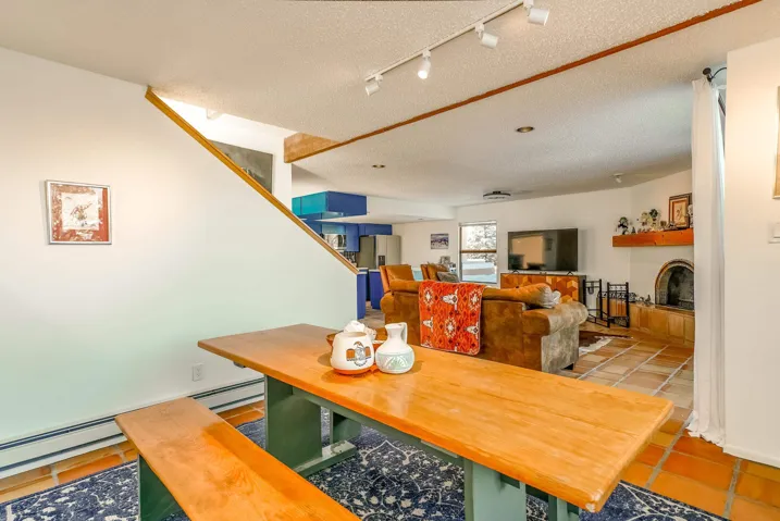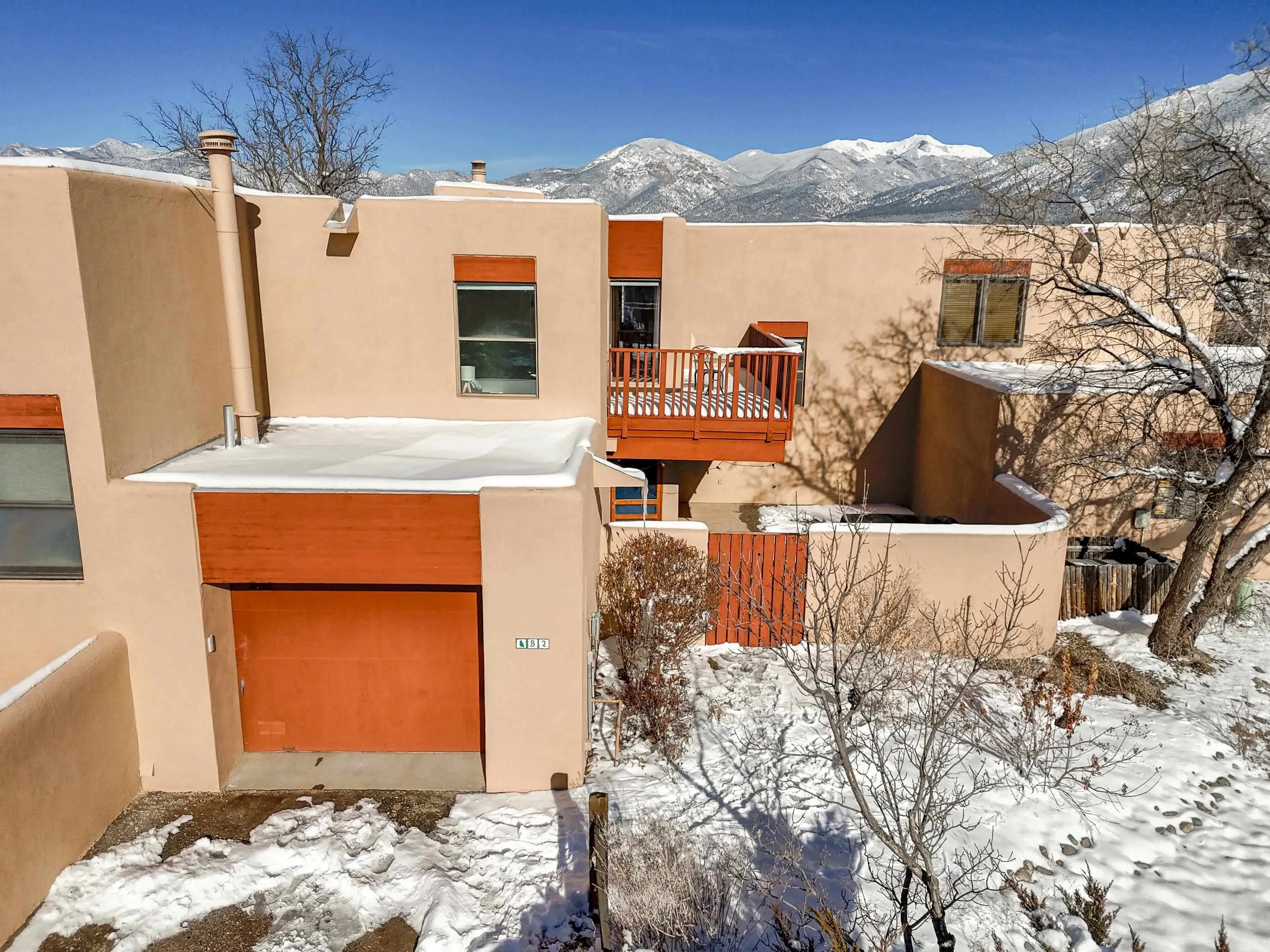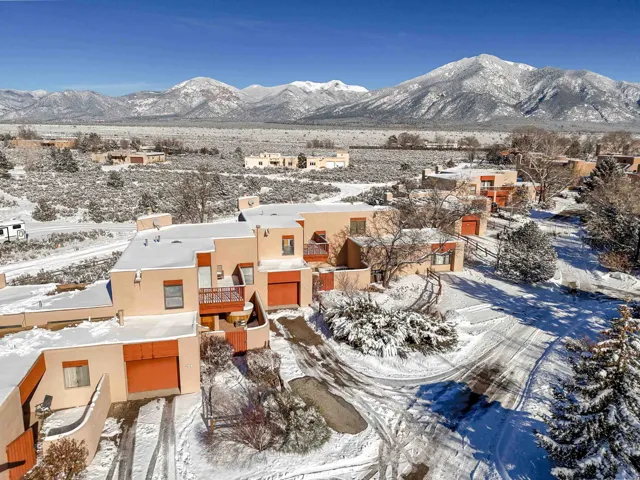 This Antoine Predock designed 2 story, 3 bed/2.5 bath, 1997 sq ft condo with a heated 1 car garage is located in the quiet cul-de-sac of Comanche Court. Part of the Quail Ridge Resort this bright and view-filled home comes with access to the Quail Ridge tennis courts and pool. Extensive renovations to the condo include, hard wood and tile floors, a new lighting package, new stainless appliances and an updated Main Bath. You enter the property through a large walled private courtyard with a 220 v Hot tub that conveys. There are decks facing east and south that give you views of Taos Mountain during both sunrise and sunset. Spacious, secluded and modernized, this condo with its own sauna and reasonable HOA fees could easily be your home or an easy-living vacation pad. Come see why folks love the northside of Taos – and the proximity to superb hiking, biking, skiing or fly fishing – located just 15 min from Taos Ski Valley, the Rio Grande at the John Dunn Bridge or from the center of Taos and the shops and museums and art that you love so well.