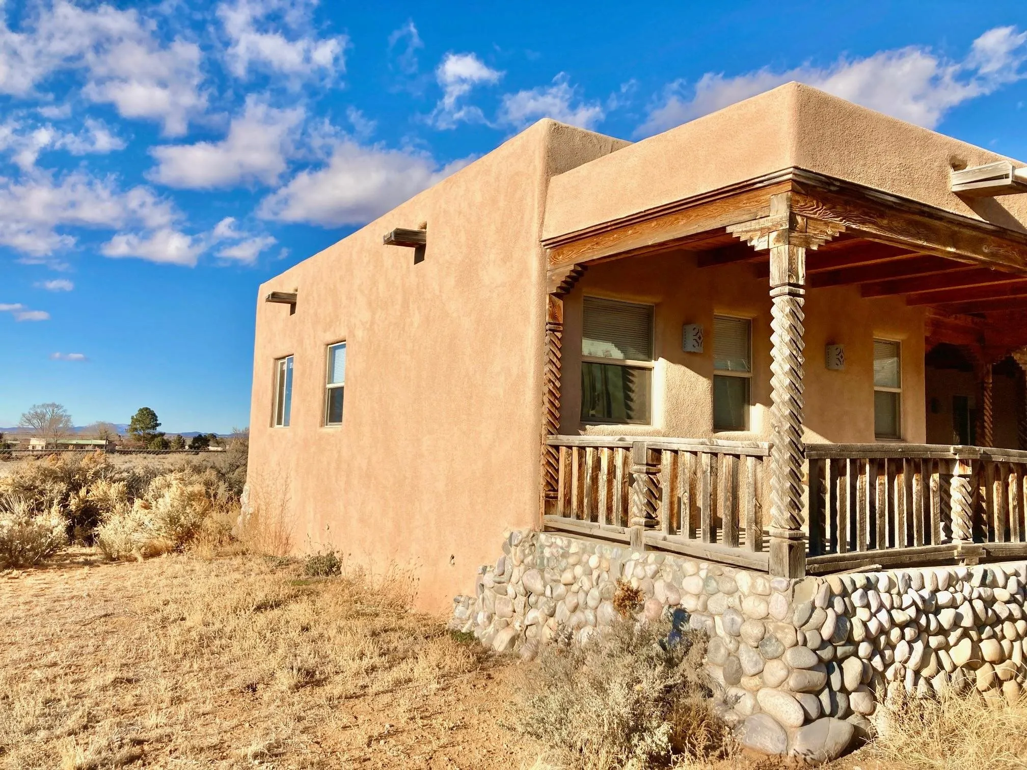 Beautiful 3 bedroom & 3 bathroom home, appx 1,490 sf, offering privacy & serenity at the end of a quiet cul-de-sac in convenient South Taos. Open, airy design features rough-sawn, corbelled pine beams, T&G ceilings, hardwood & Saltillo tile floors, and tiled baths. New roof installed 2025. Quiet hydronic boiler heating. Three sets of double doors connect to a spacious wrap-around covered porch with views. Light-filled kitchen and Living Room have views of the northern mountains & western mesa. The warm living room opens to the porch. Two bedrooms with private double door deck access, the third has southern views.. Close to shopping, dining, entertainment & medical care. Your perfect Taos escape—schedule a tour today!